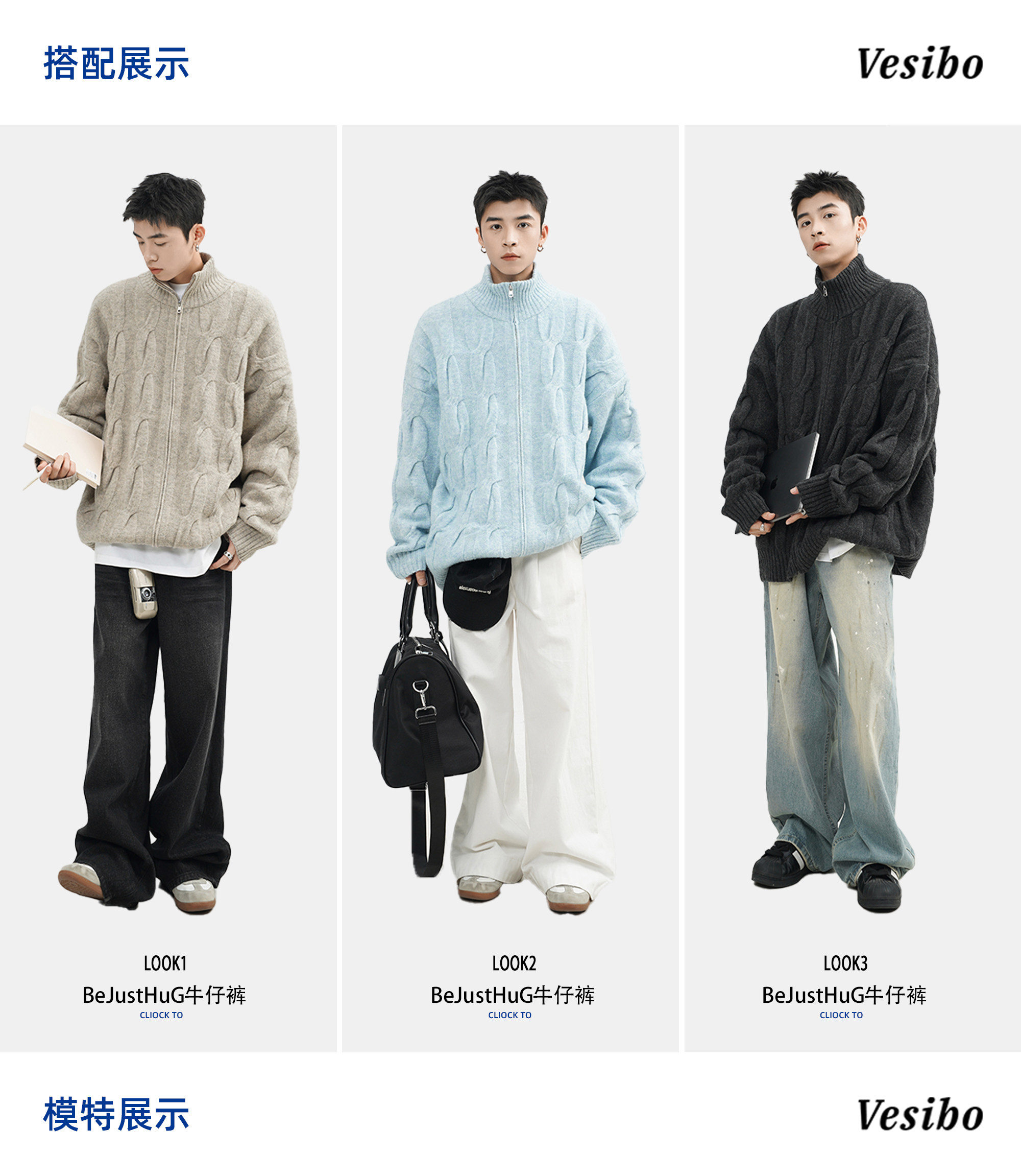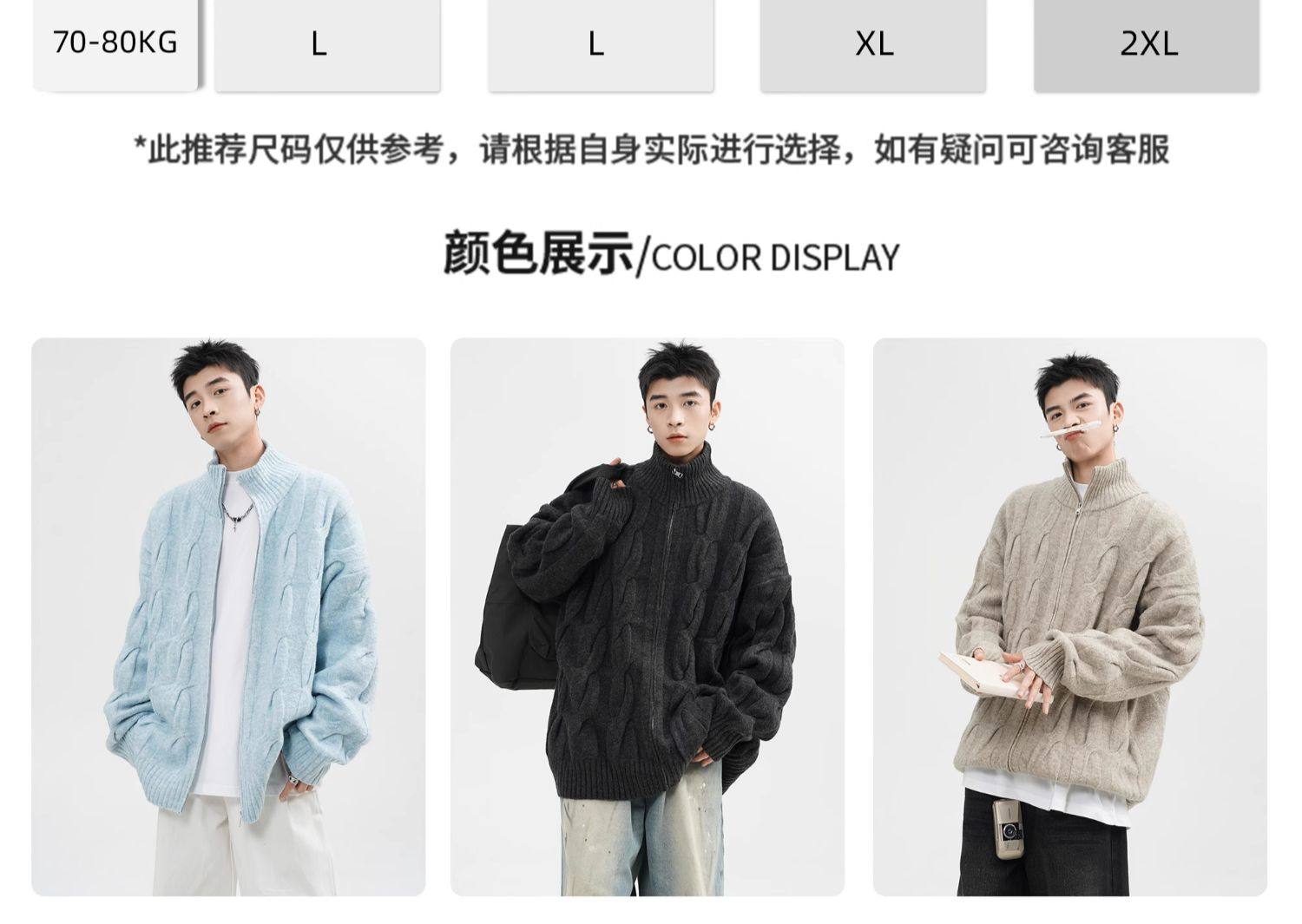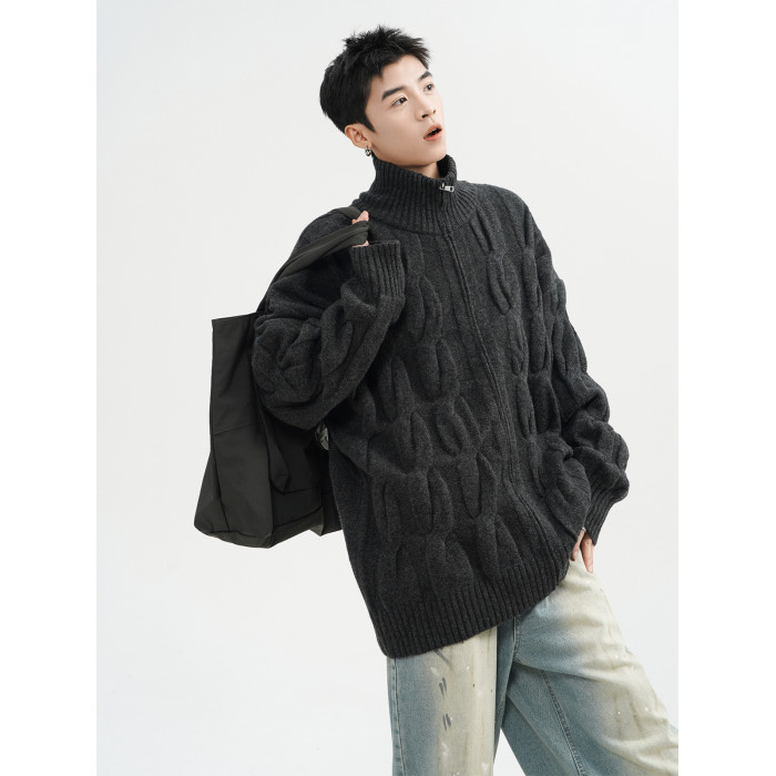 美式半高領毛衣男冬季重磅慵嬾風麻花針織衫潮牌高街情侶開衫外套