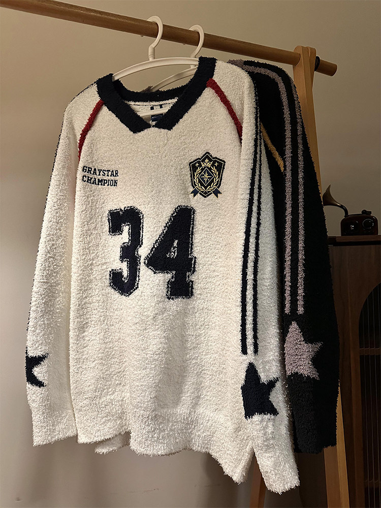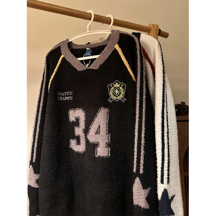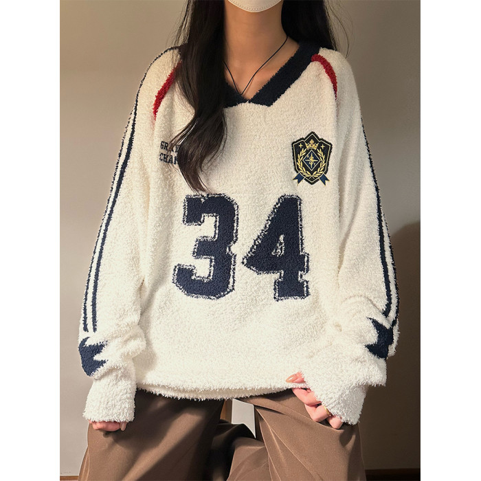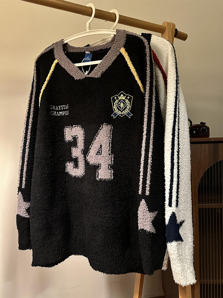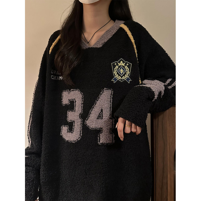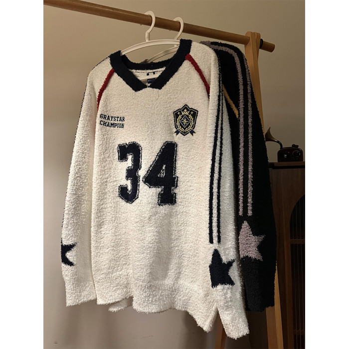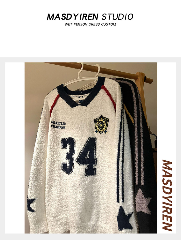 MASDYIREN 秋季美式復古寬鬆休閒學院風字母V領針織衫毛衣男女潮