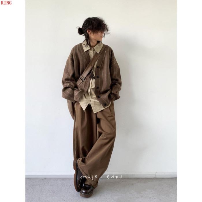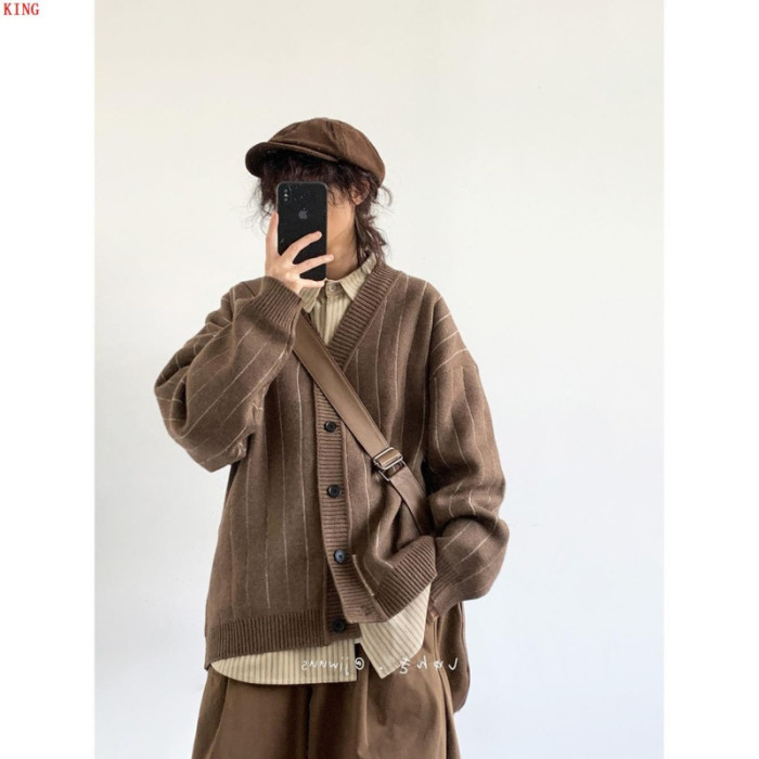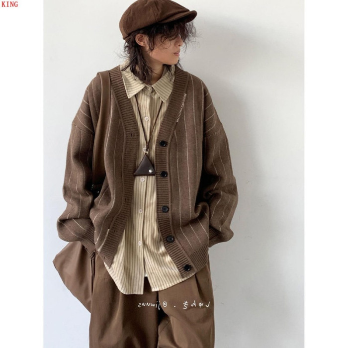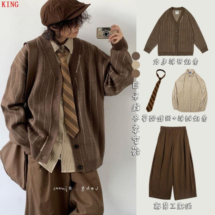 秋冬季日系復古穿搭整套中性條紋開衫毛衣男女學院風V領針織外套