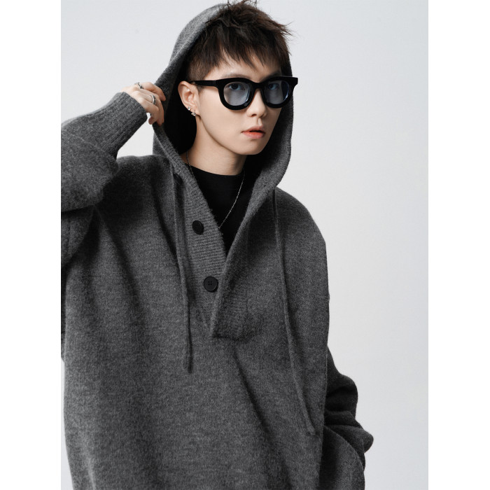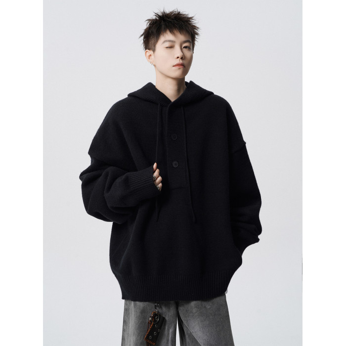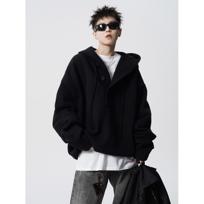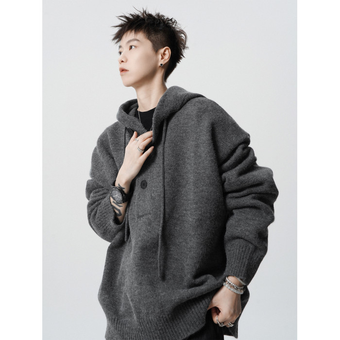 高街純色連帽針織衫男款冬季美式cleanfit連帽衛衣高級感痞帥毛衣