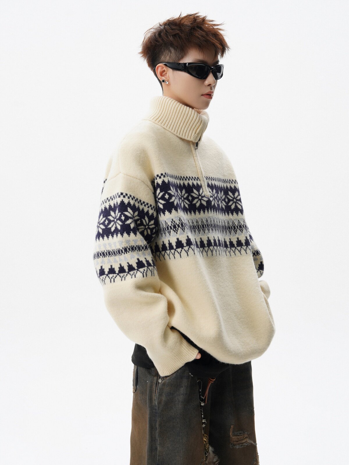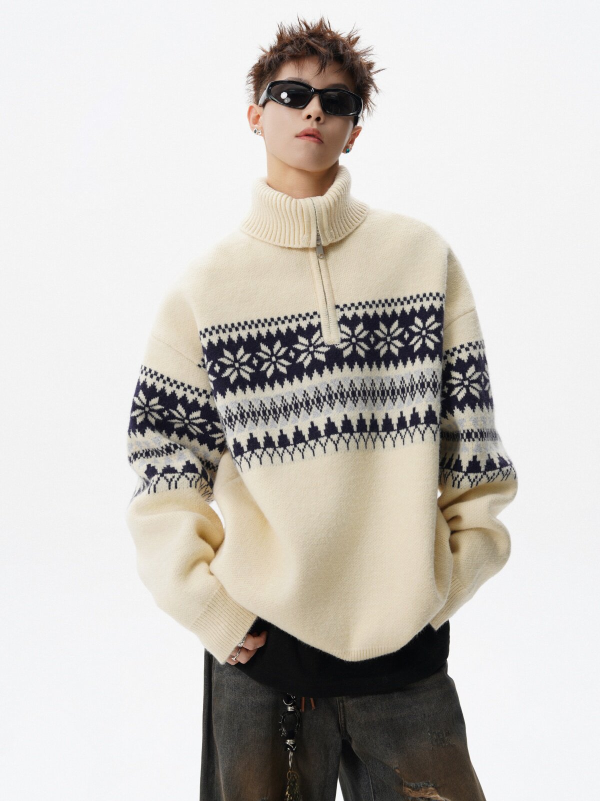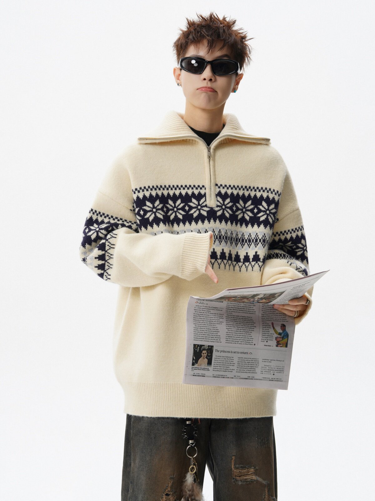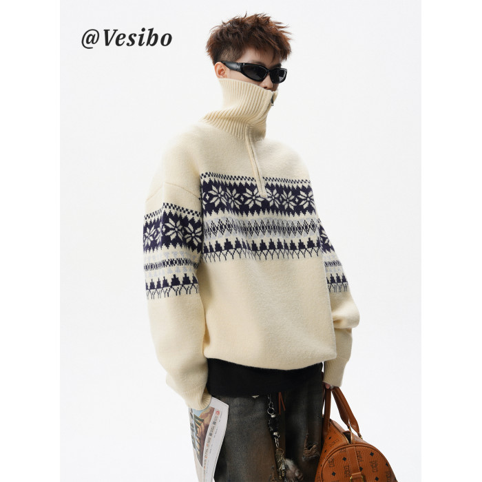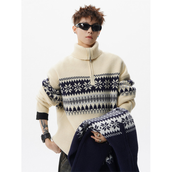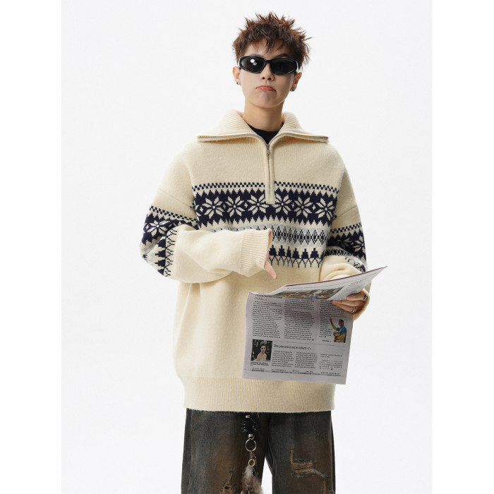 費爾島提花米色針織衫男冬美式半拉鍊高領毛衣慵懶感寬松情侶外套