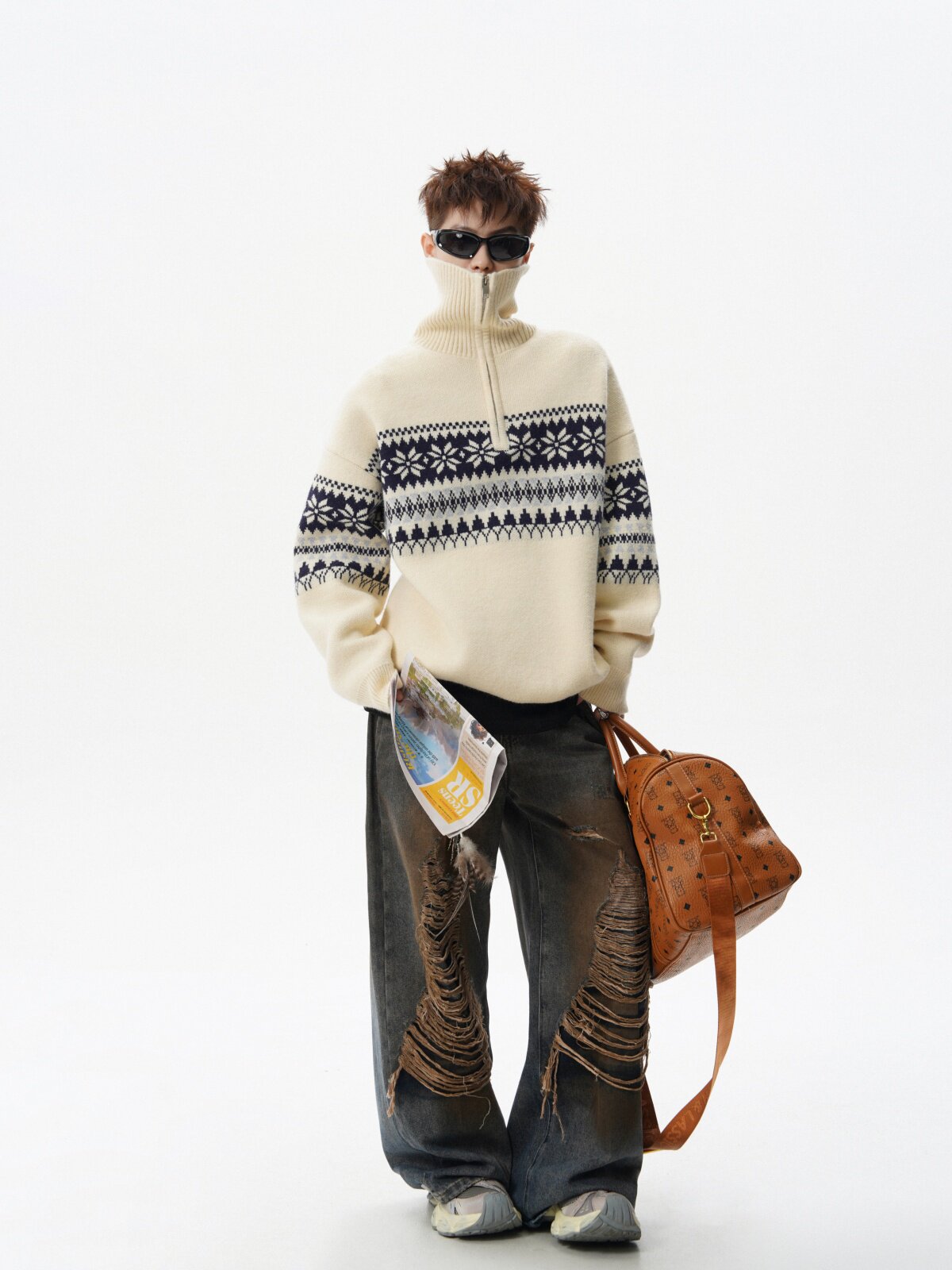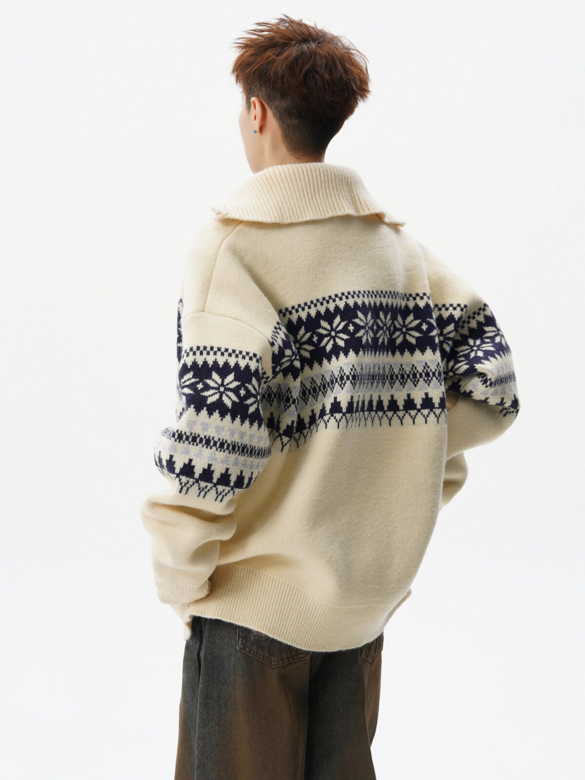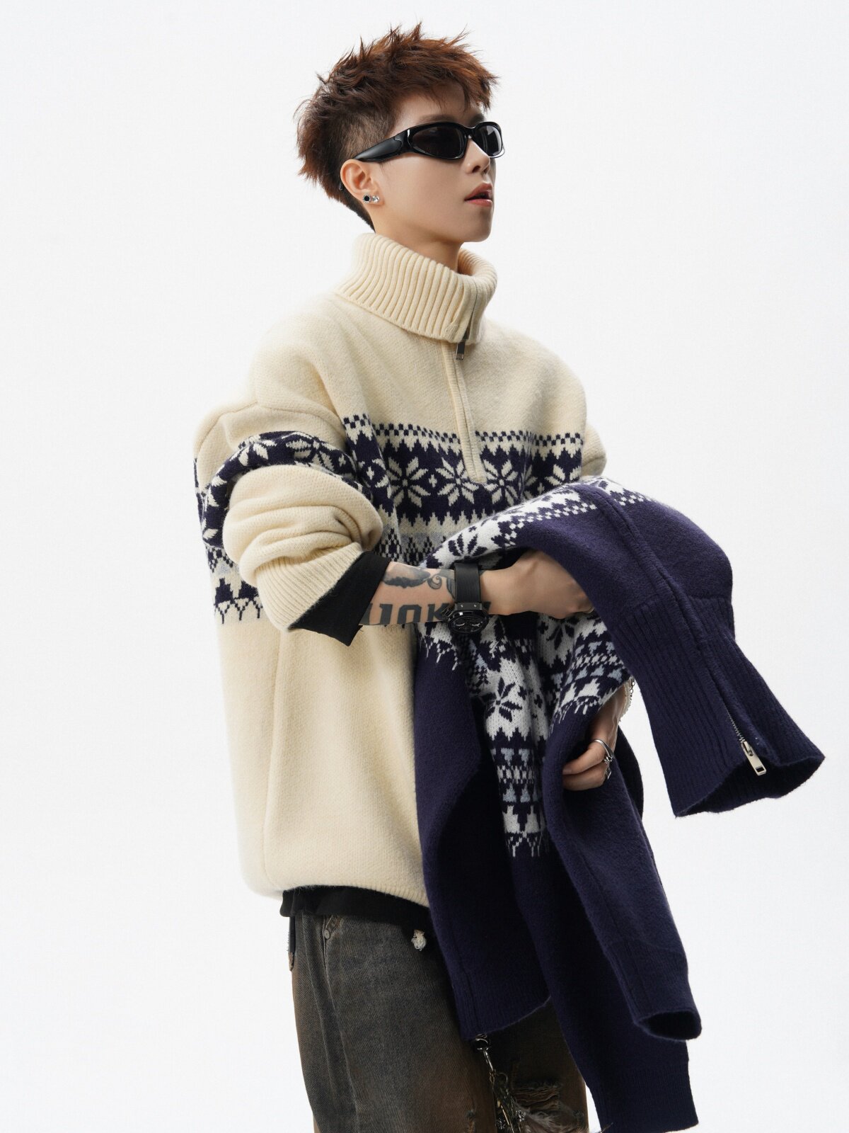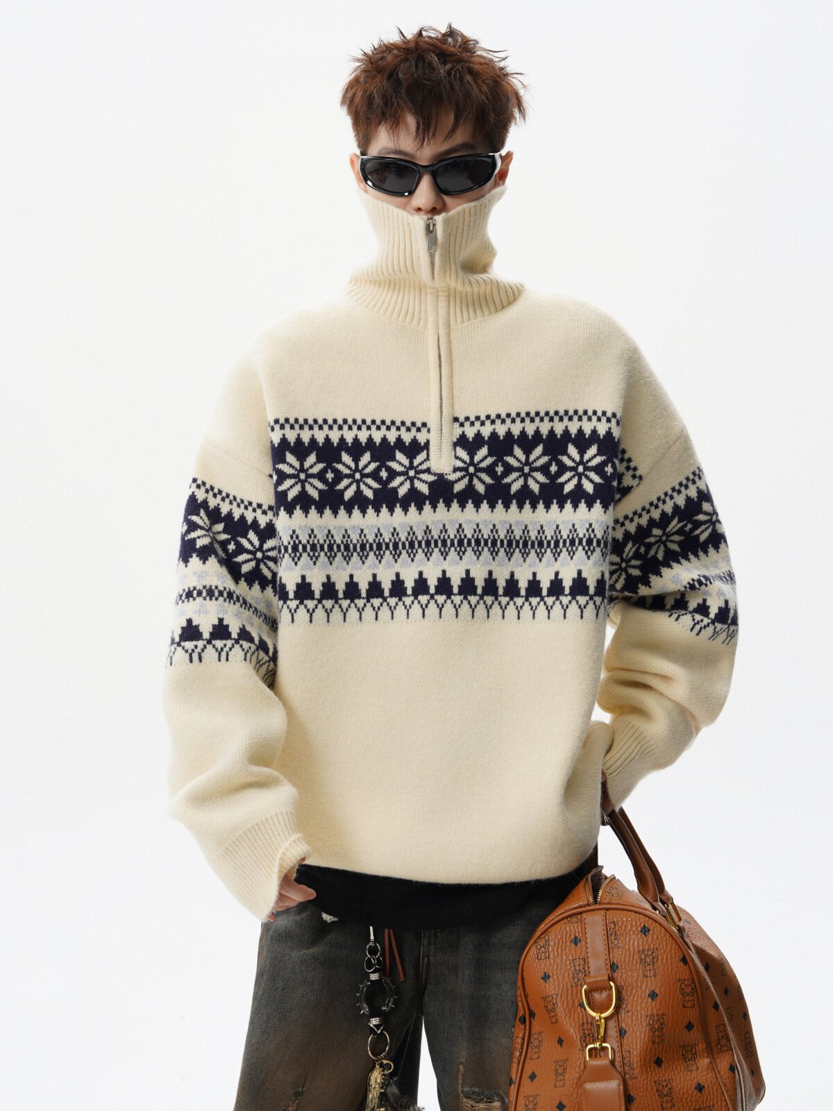 費爾島提花米色針織衫男冬美式半拉鍊高領毛衣慵懶感寬松情侶外套