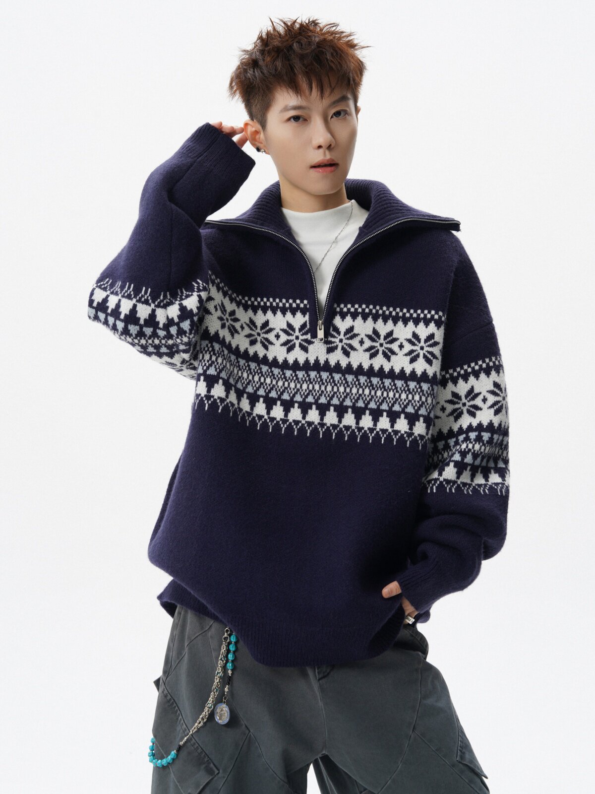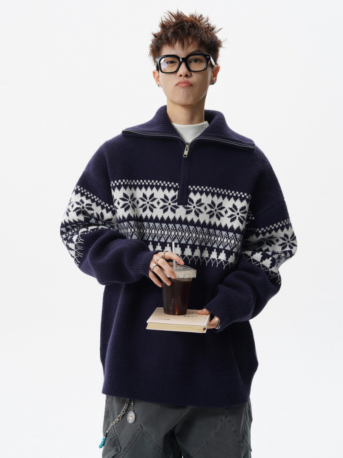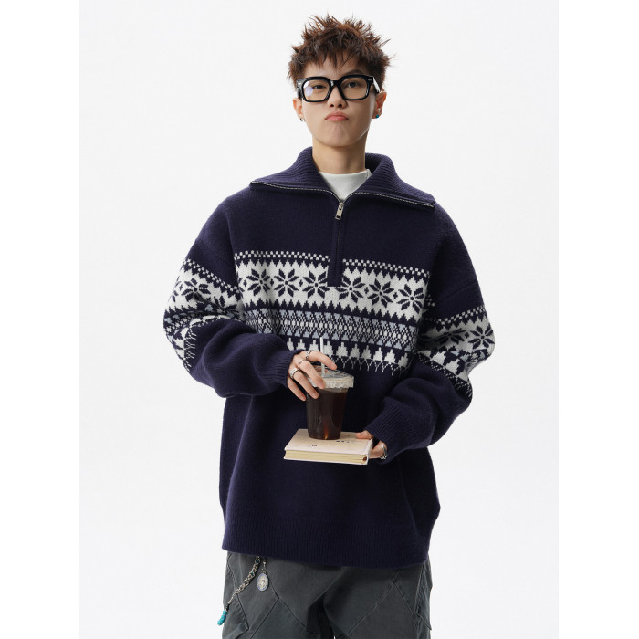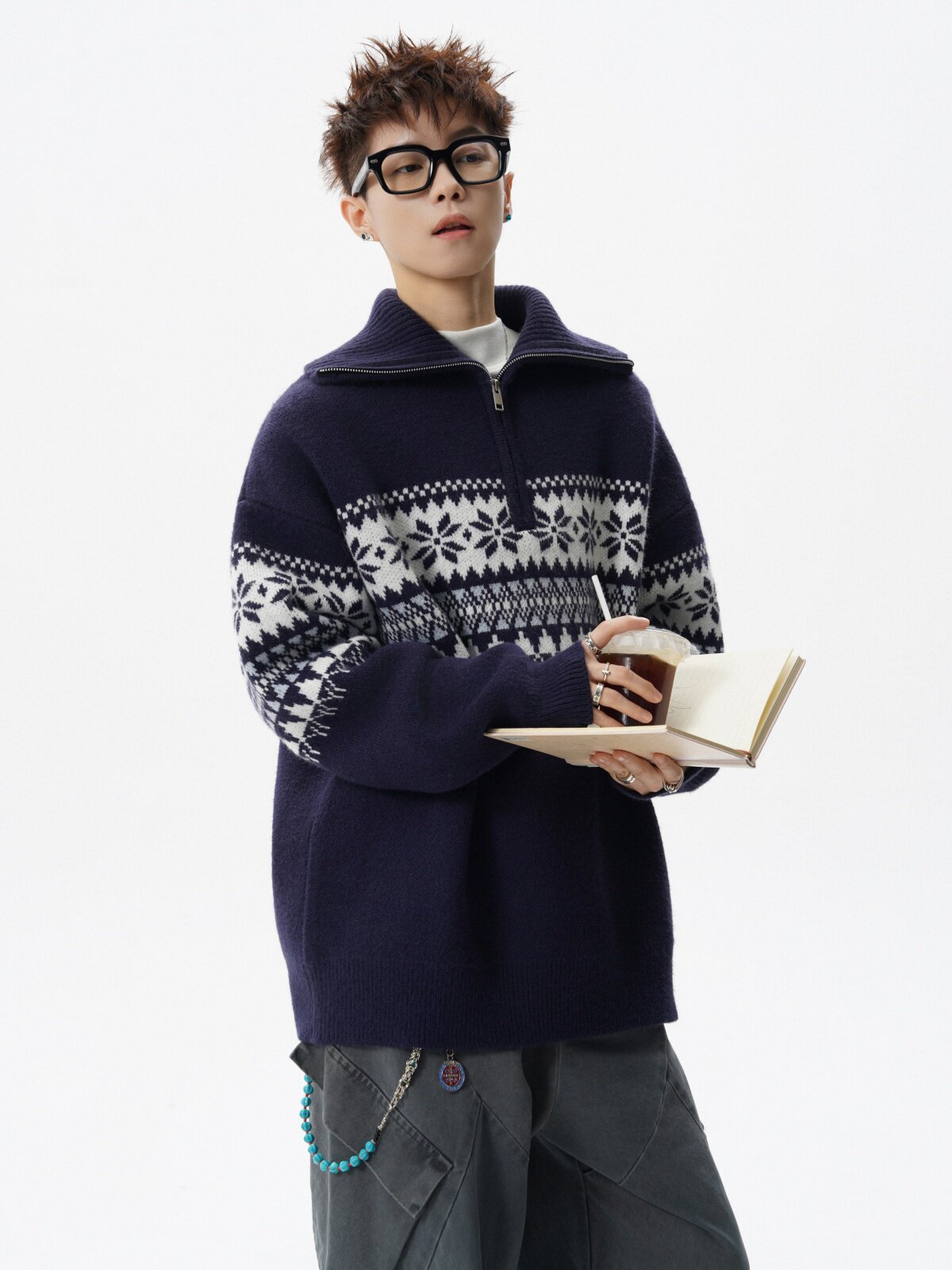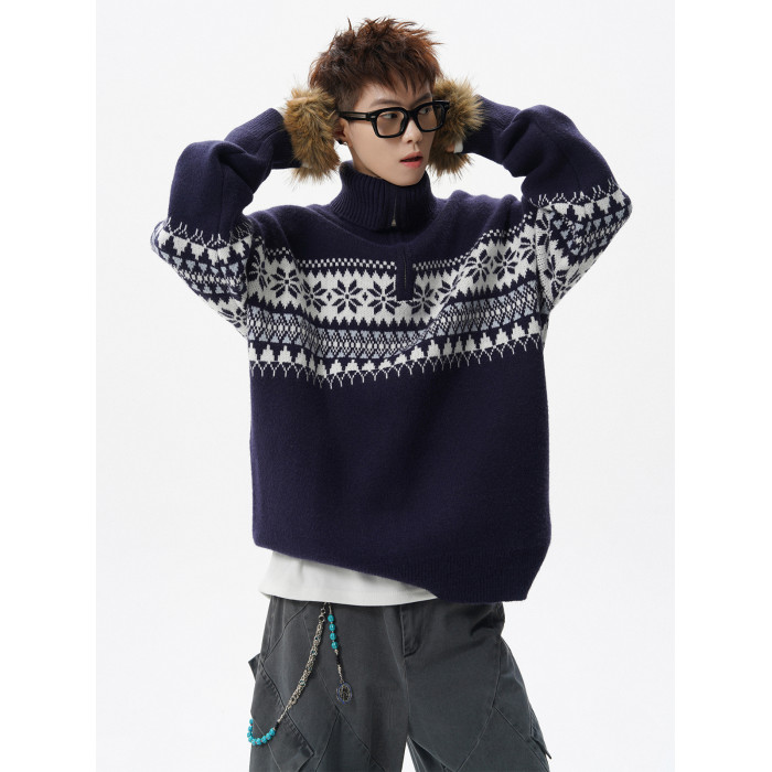 費爾島提花米色針織衫男冬美式半拉鍊高領毛衣慵懶感寬松情侶外套