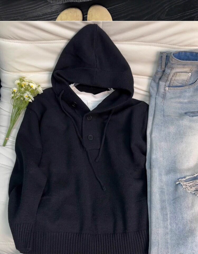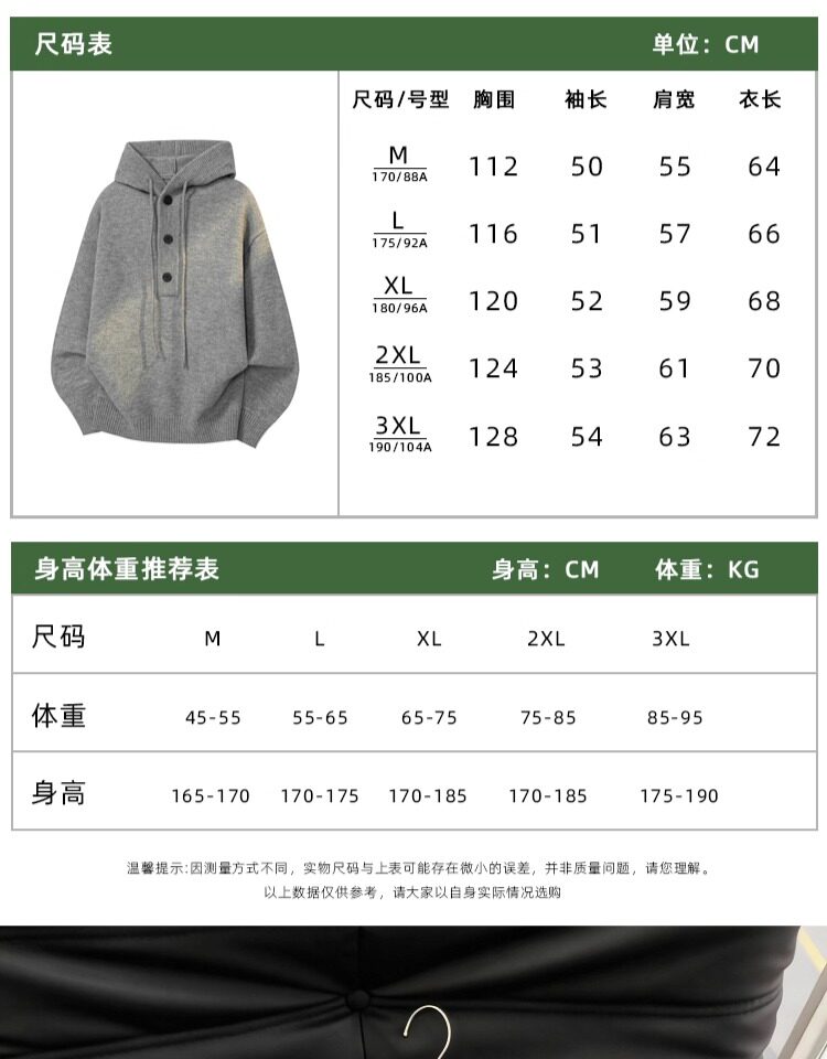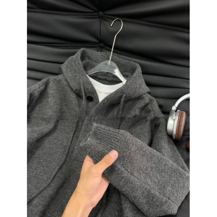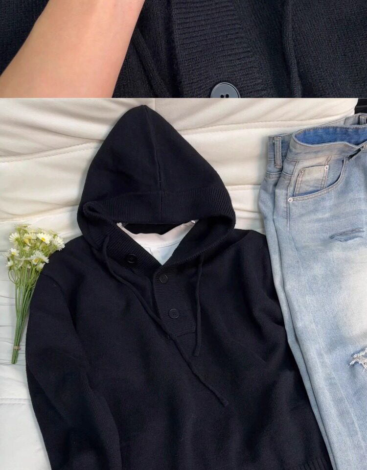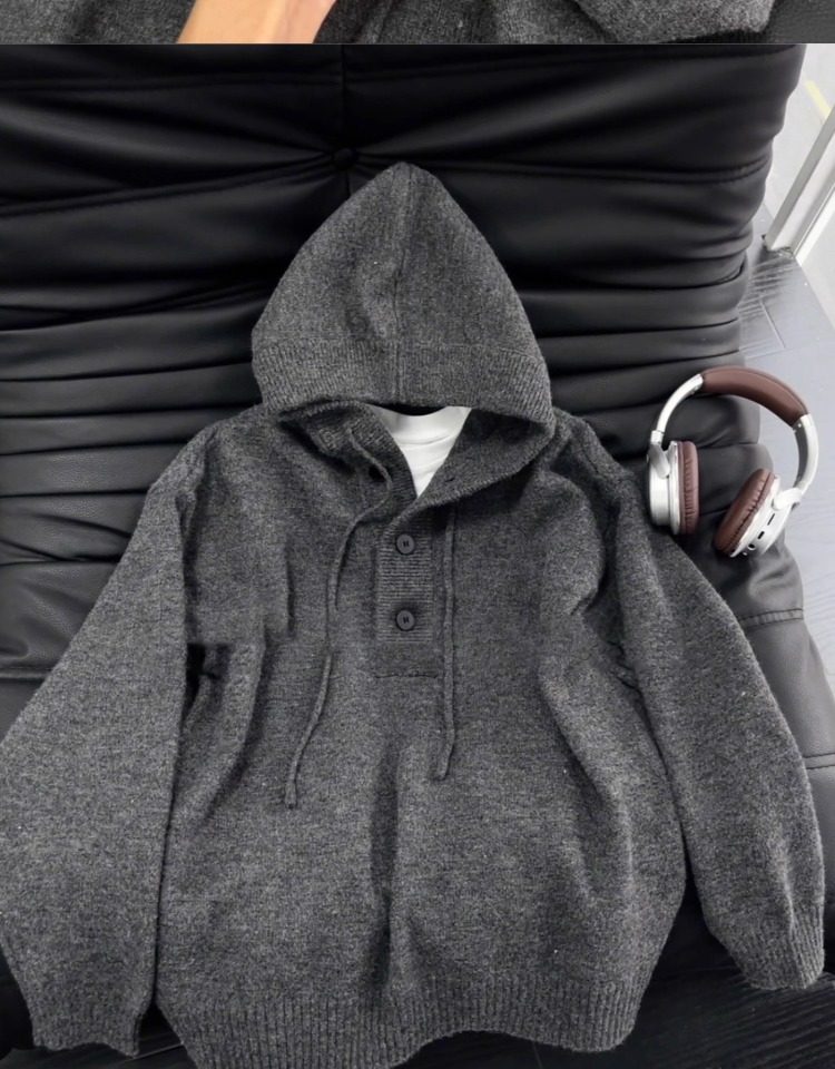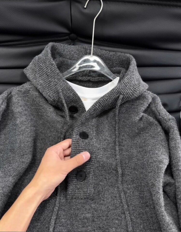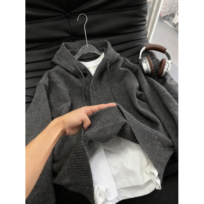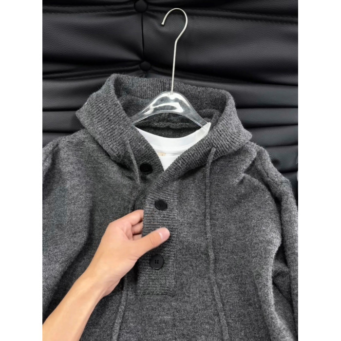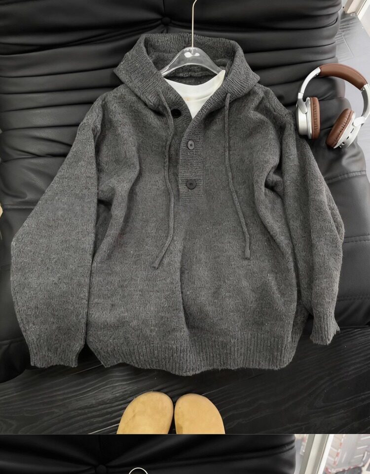 深灰色連帽亨利領毛衣男款秋冬季套頭針織衛衣慵懶高級感美式外套
