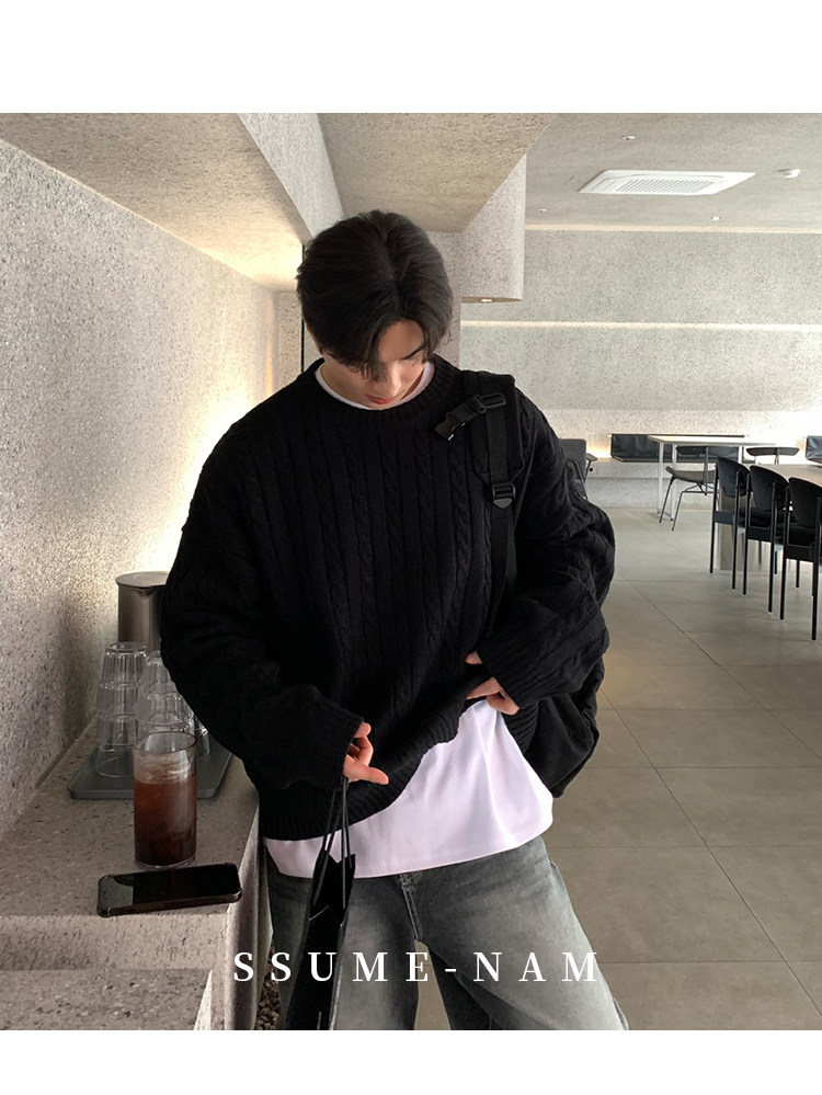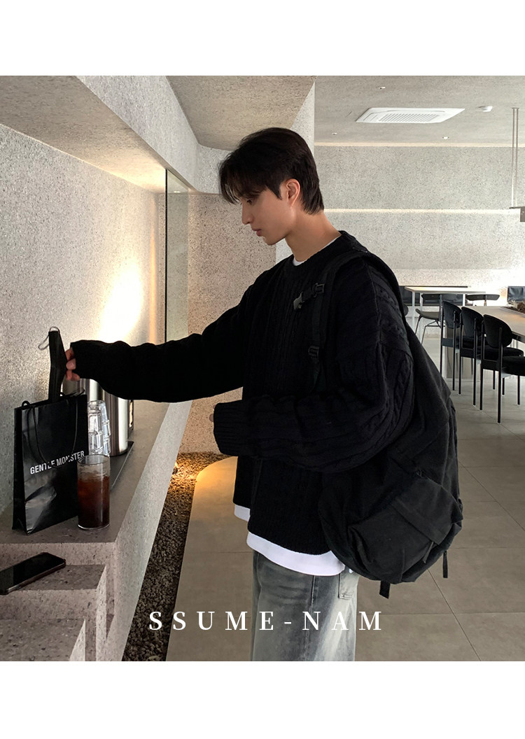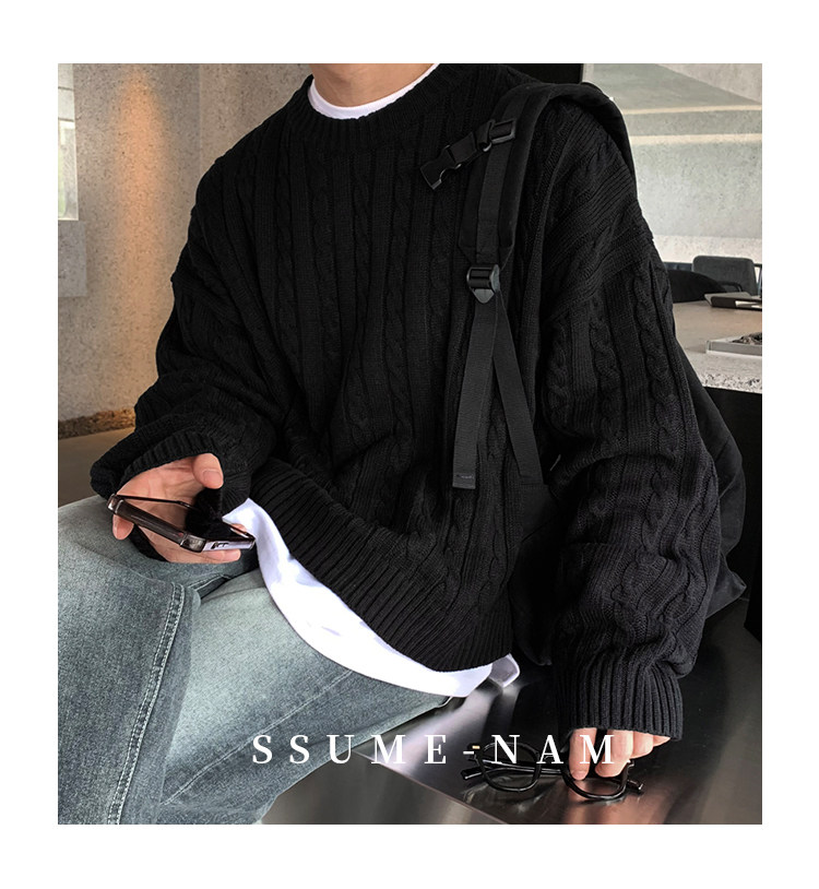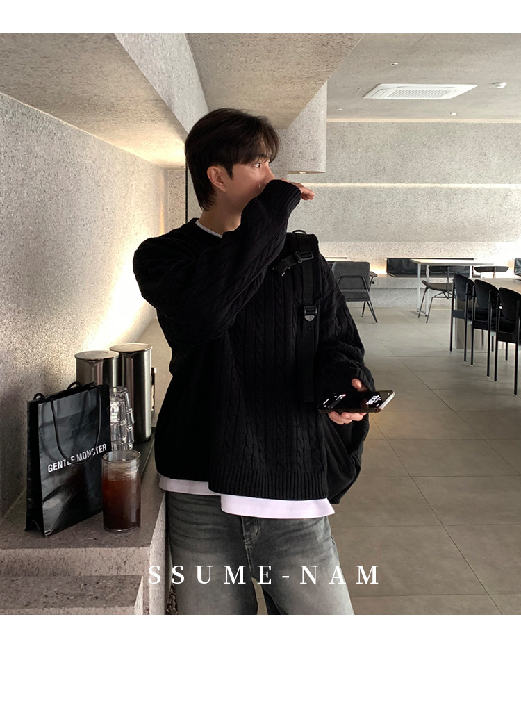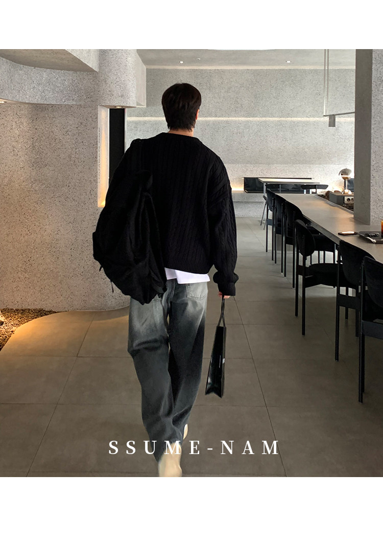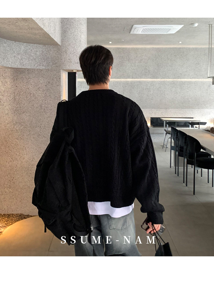 SSUMENAM「極簡風 麻花紋理」黑色毛衣男秋冬極簡內搭針織衫外套