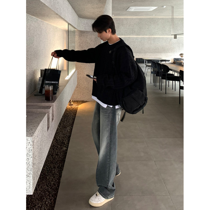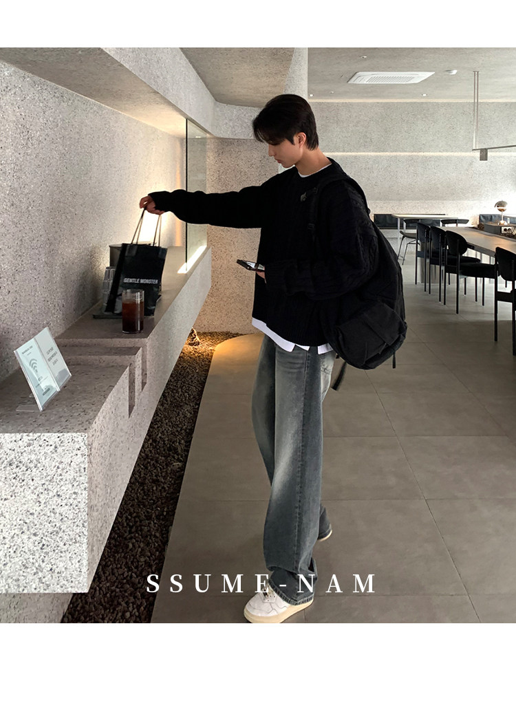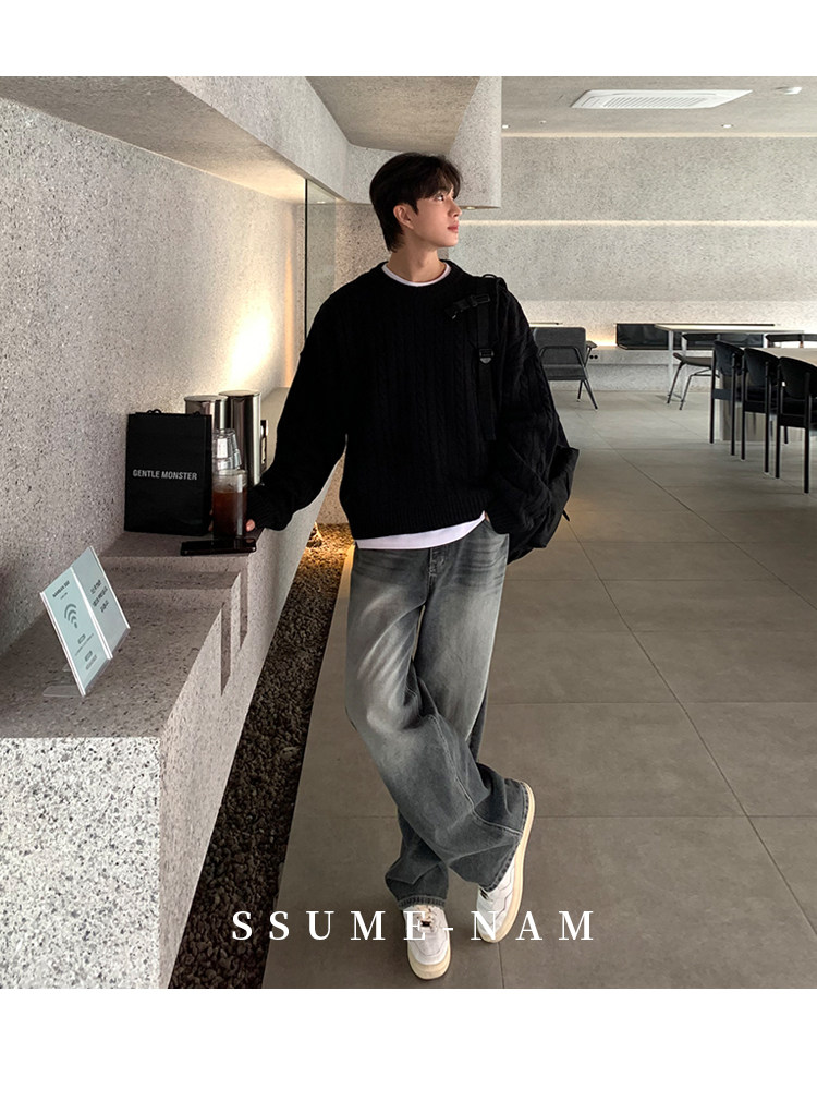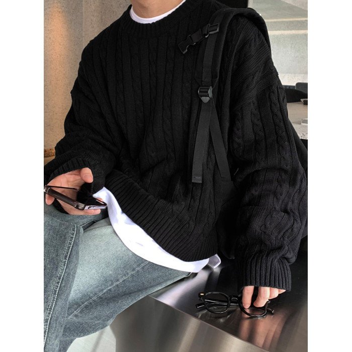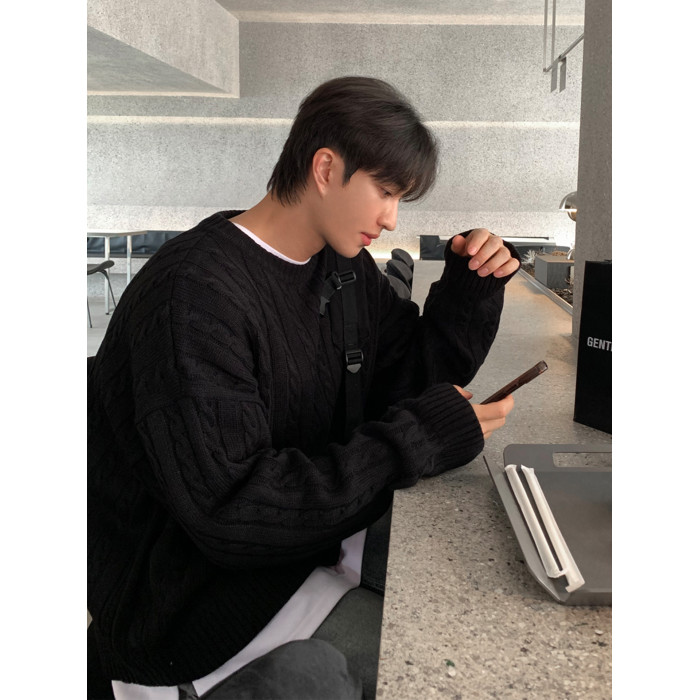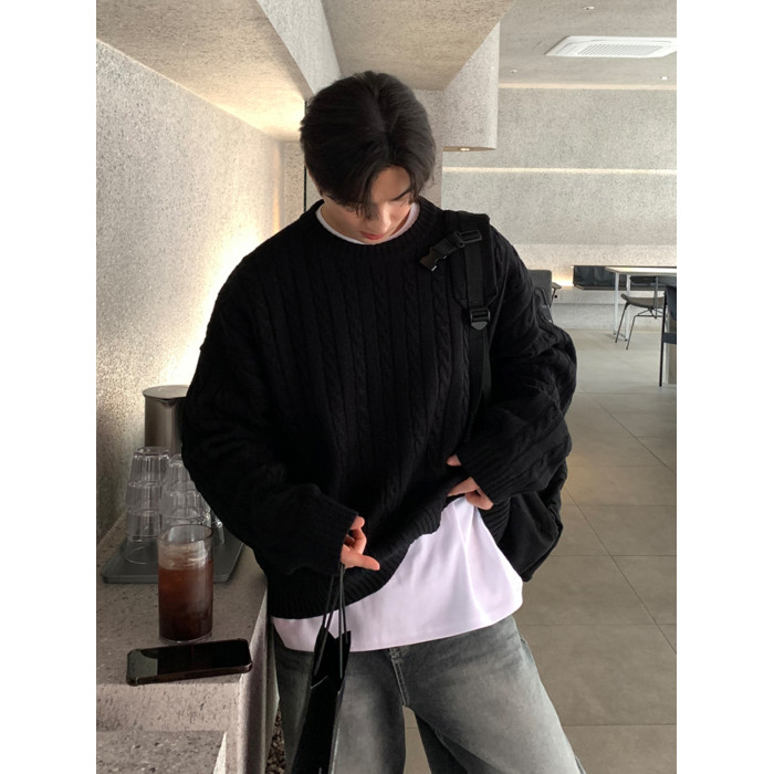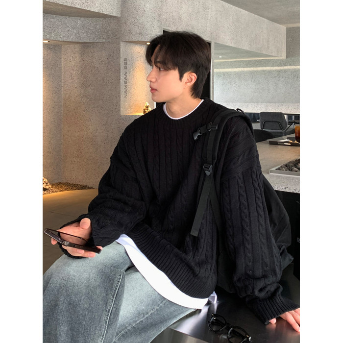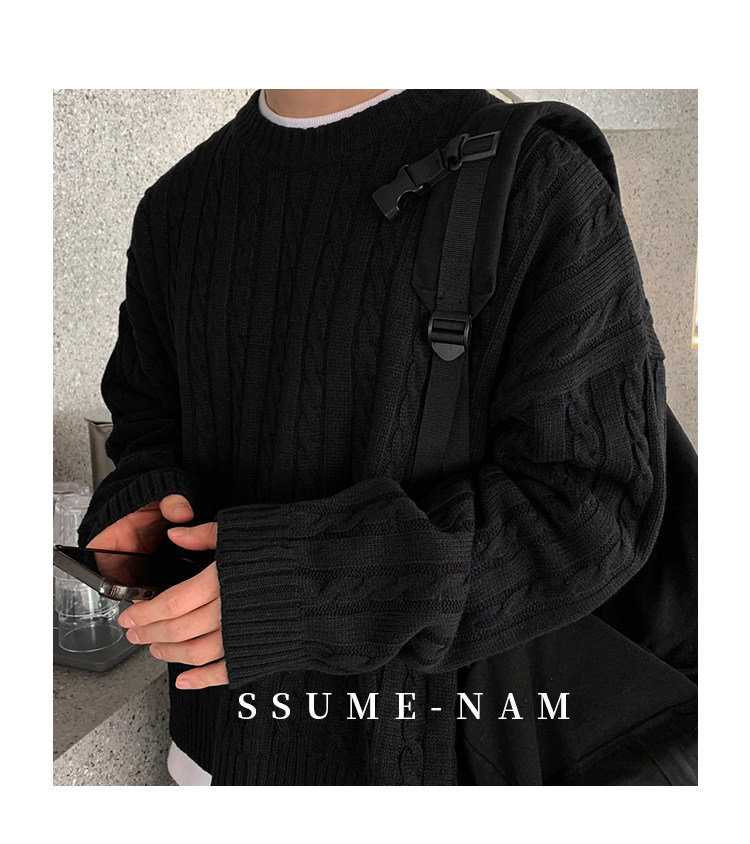 SSUMENAM「極簡風 麻花紋理」黑色毛衣男秋冬極簡內搭針織衫外套