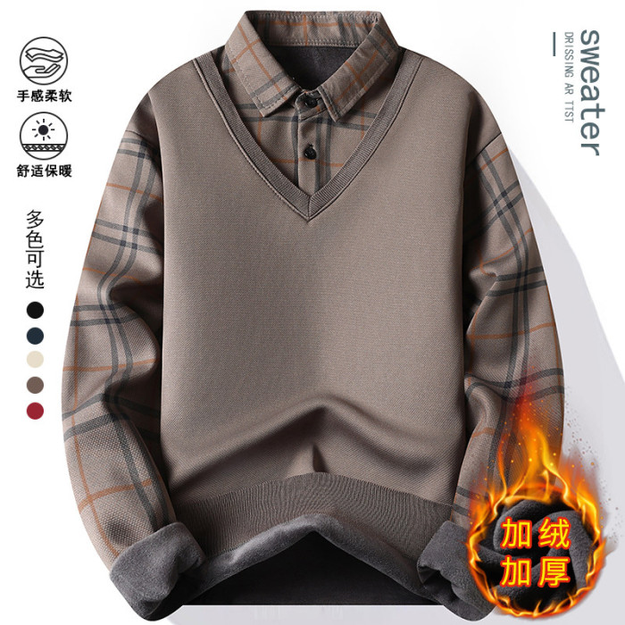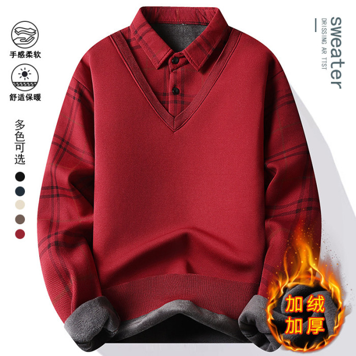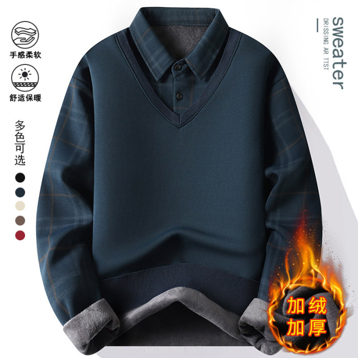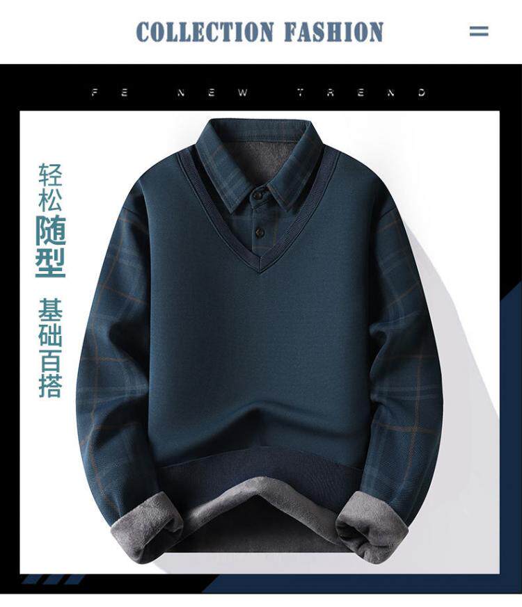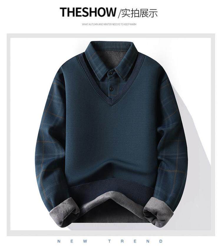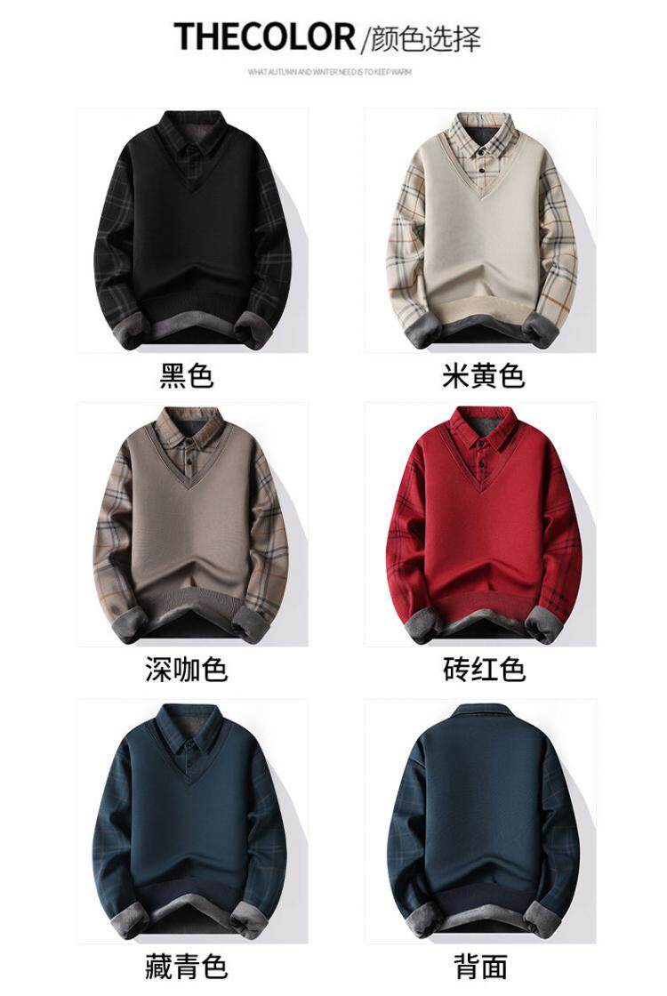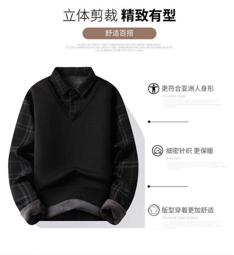假兩件針織衫男士秋冬季百搭外套內搭襯衣領加絨加厚襯衫領毛衣男