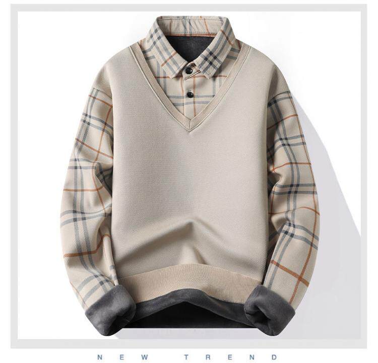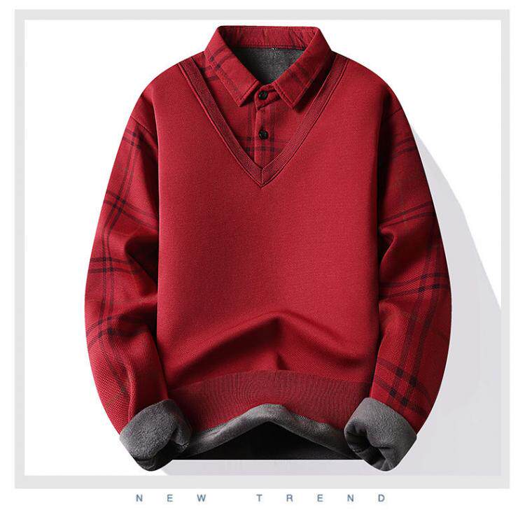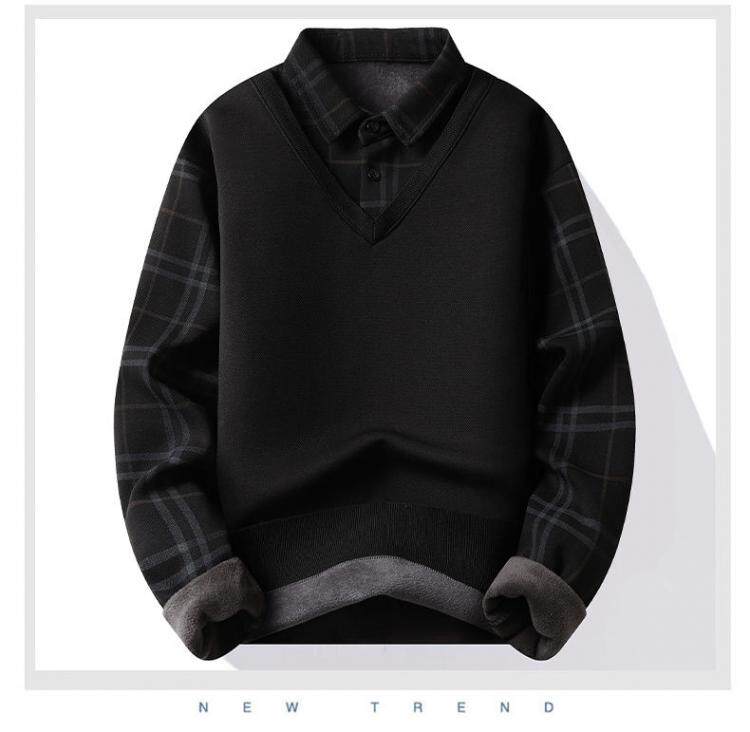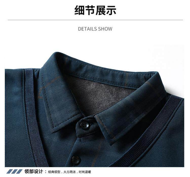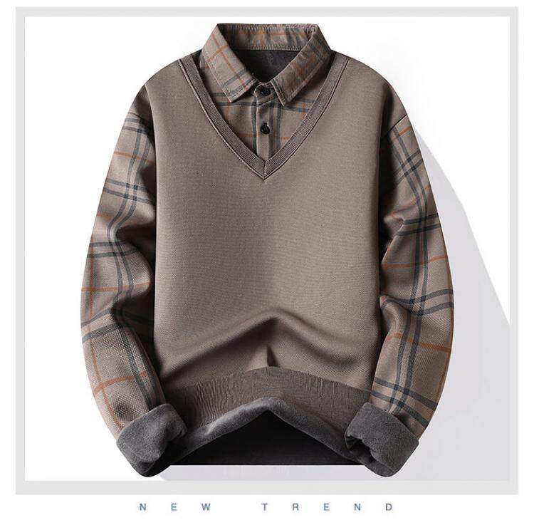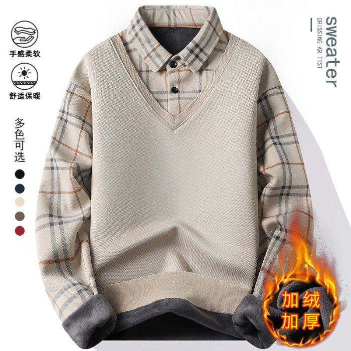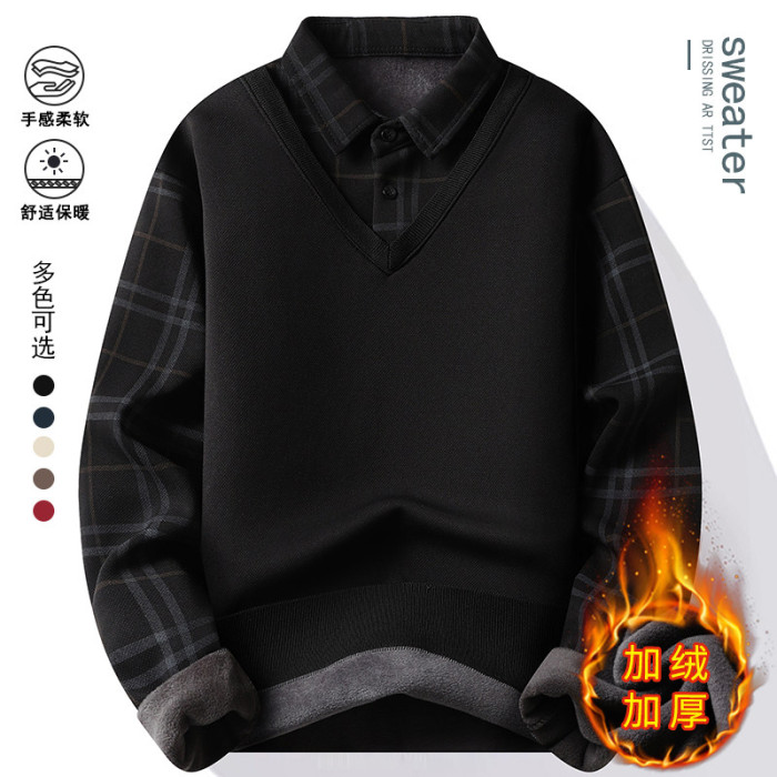 假兩件針織衫男士秋冬季百搭外套內搭襯衣領加絨加厚襯衫領毛衣男