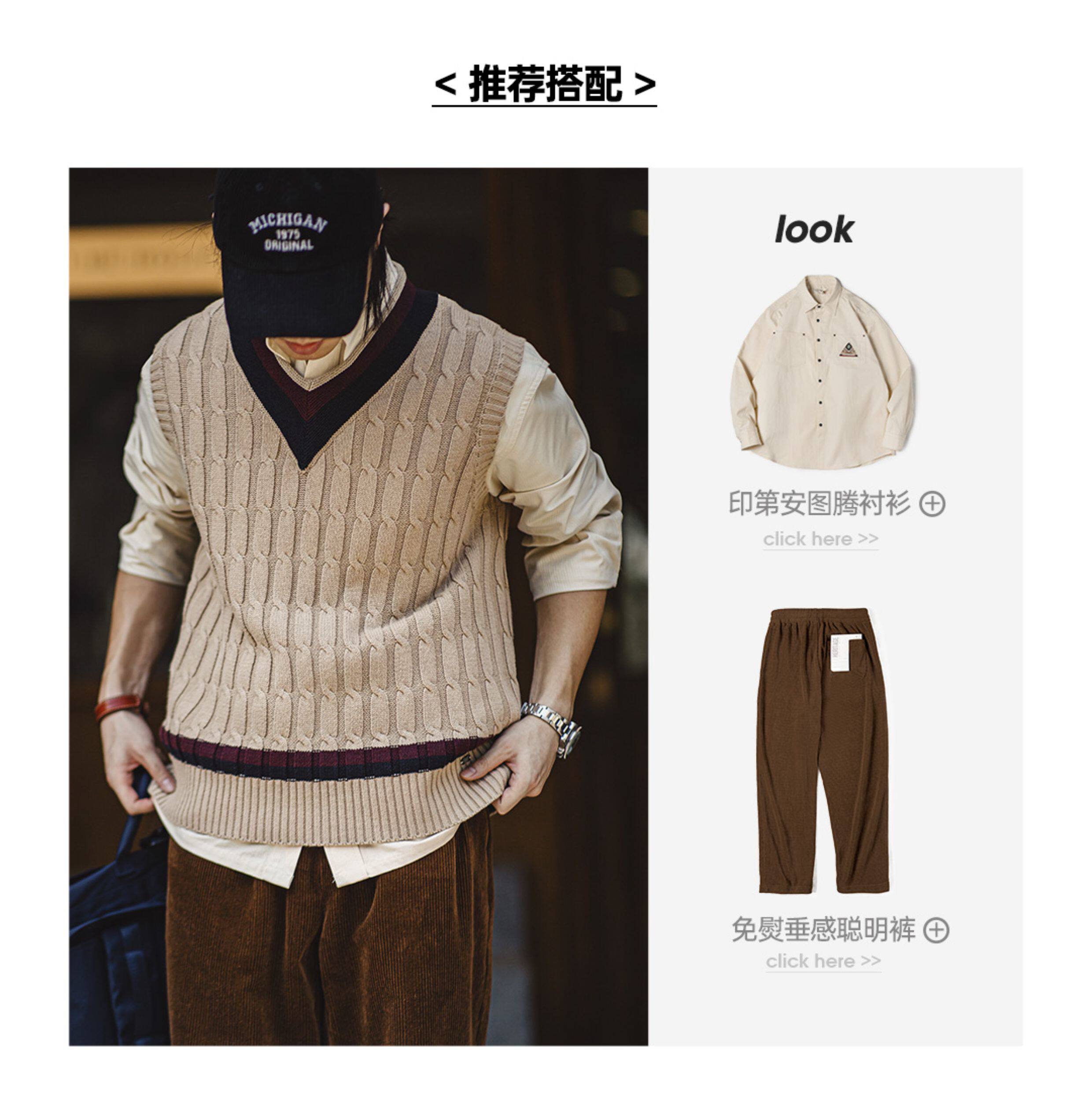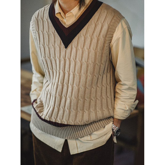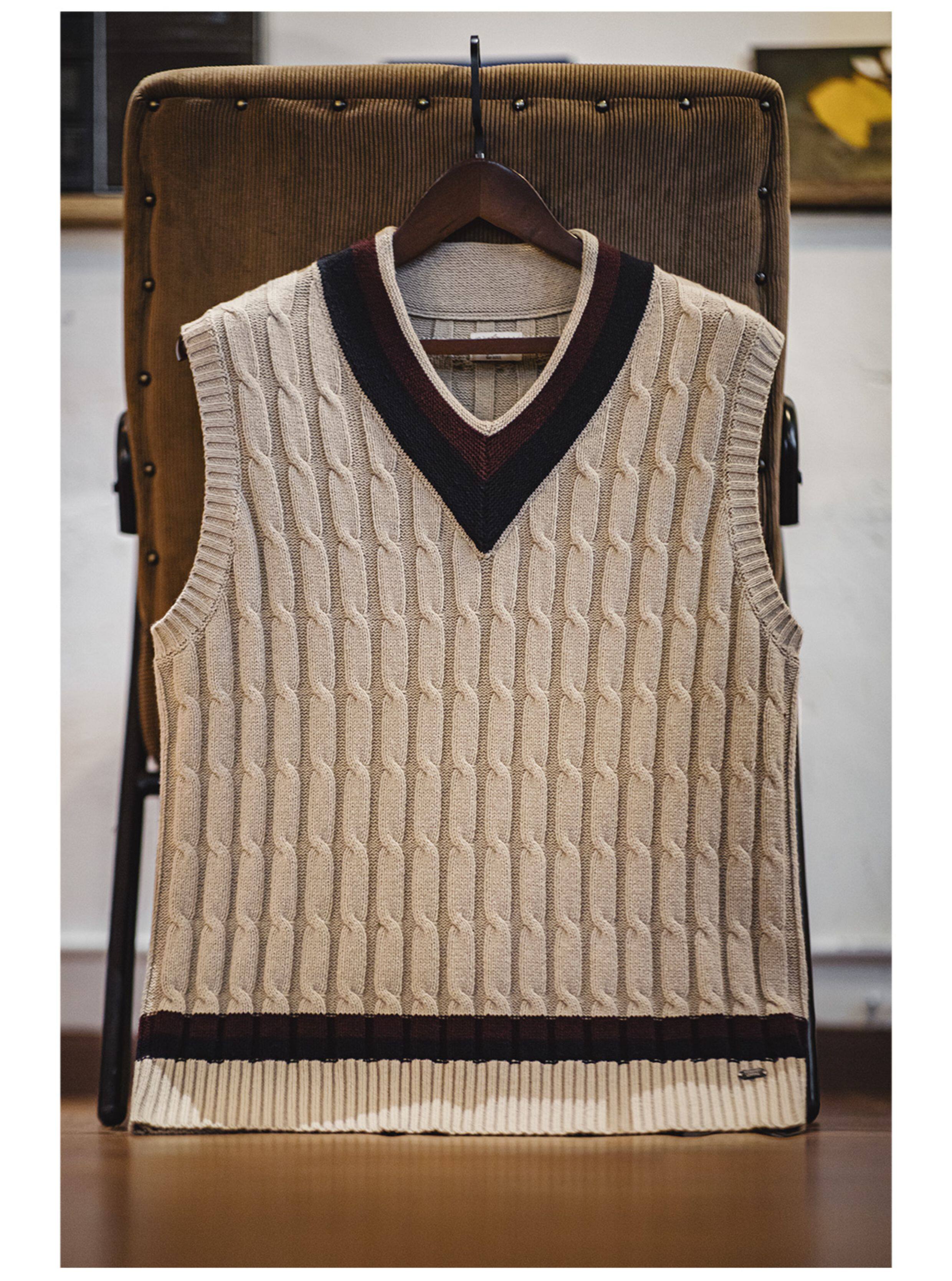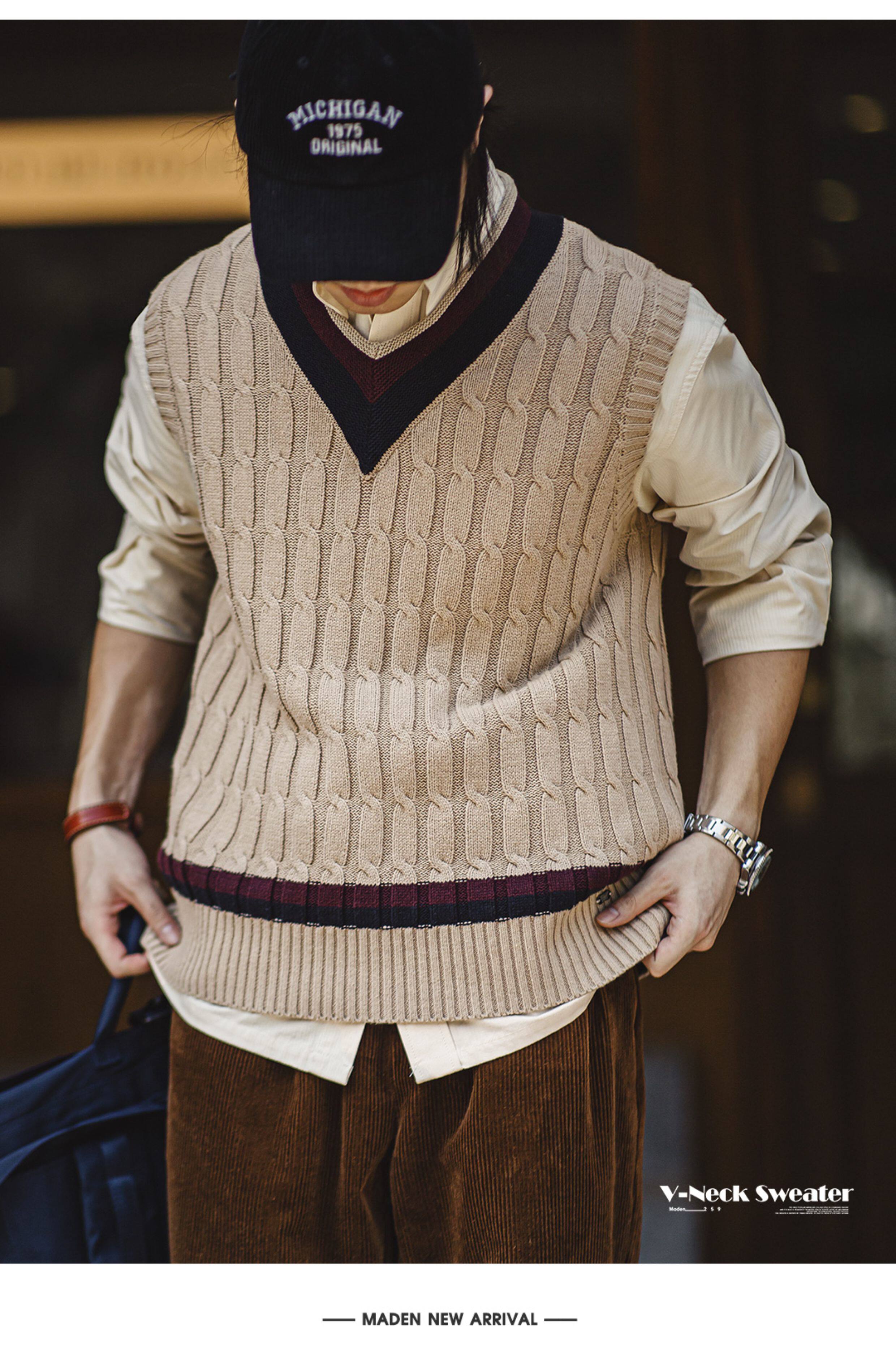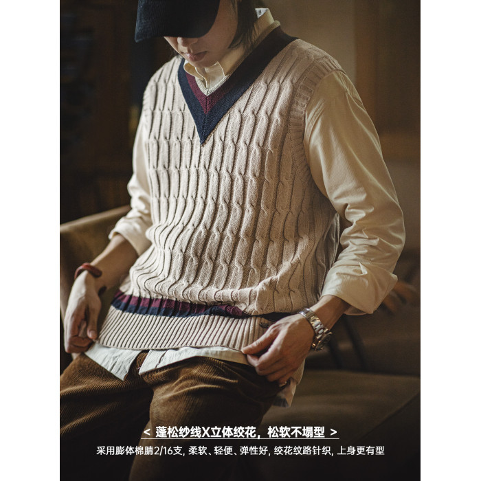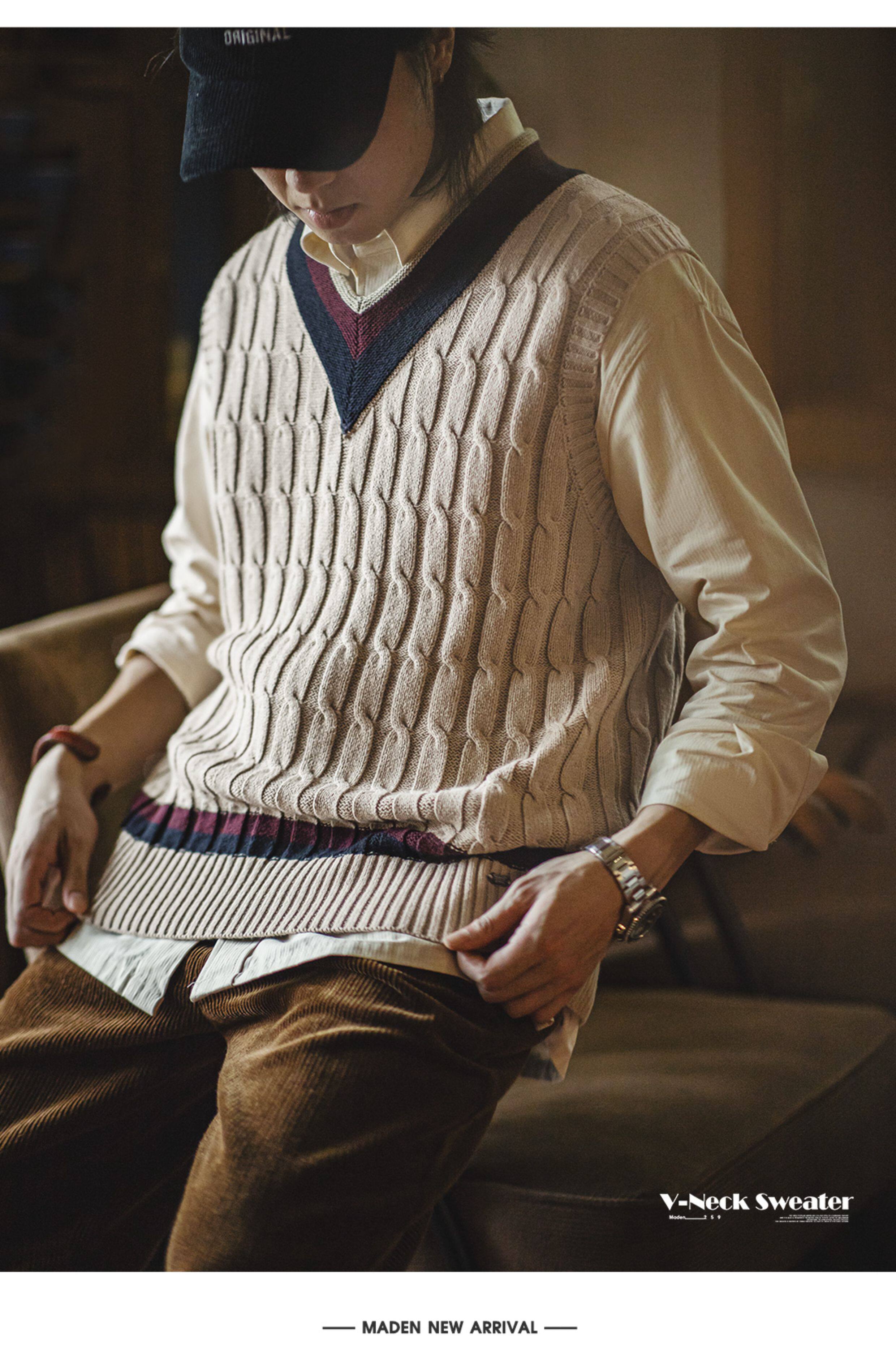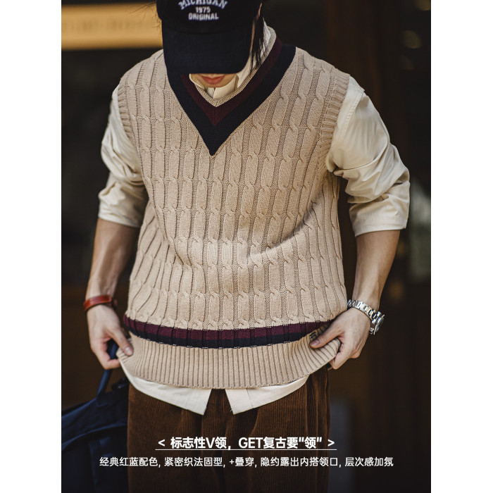 馬登工裝美式復古IVY針織V領毛衣背心學院風撞色絞花無袖馬甲男秋