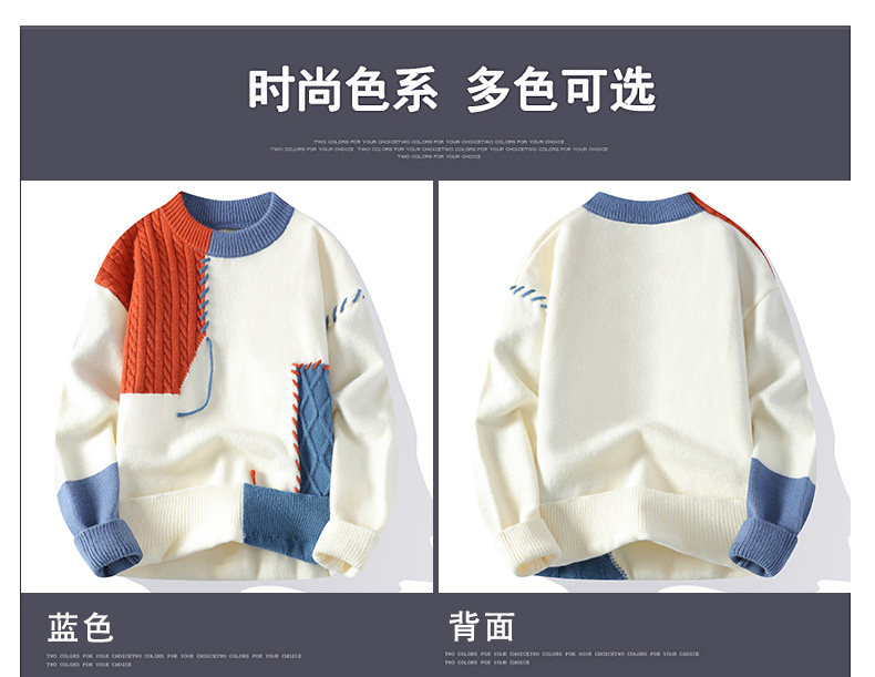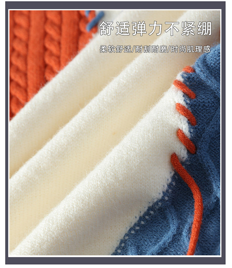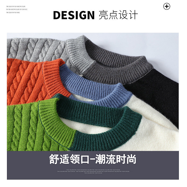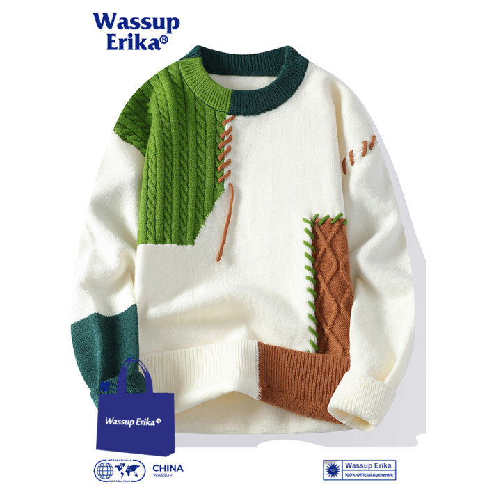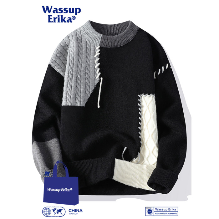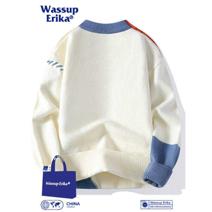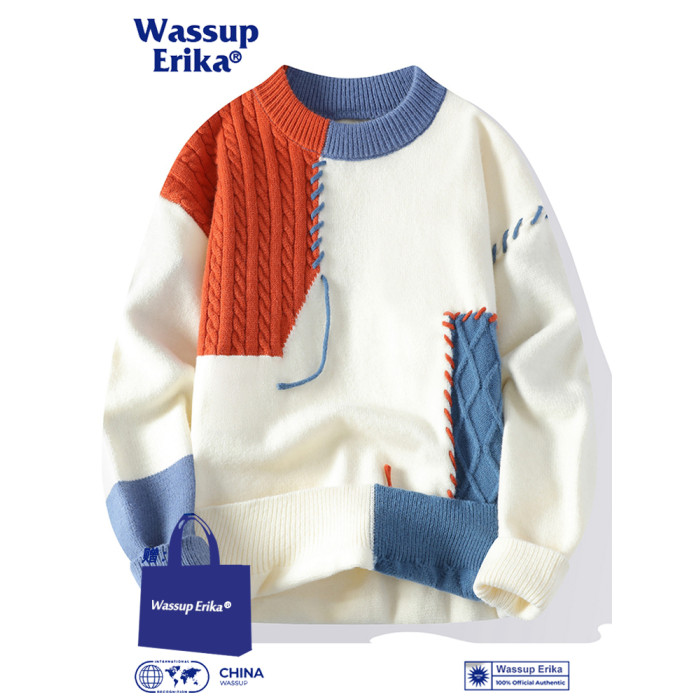 WASSUP ERIKA拼接圓領毛衣男秋冬季加絨情侶款撞色慵懶風針織衫