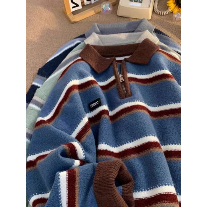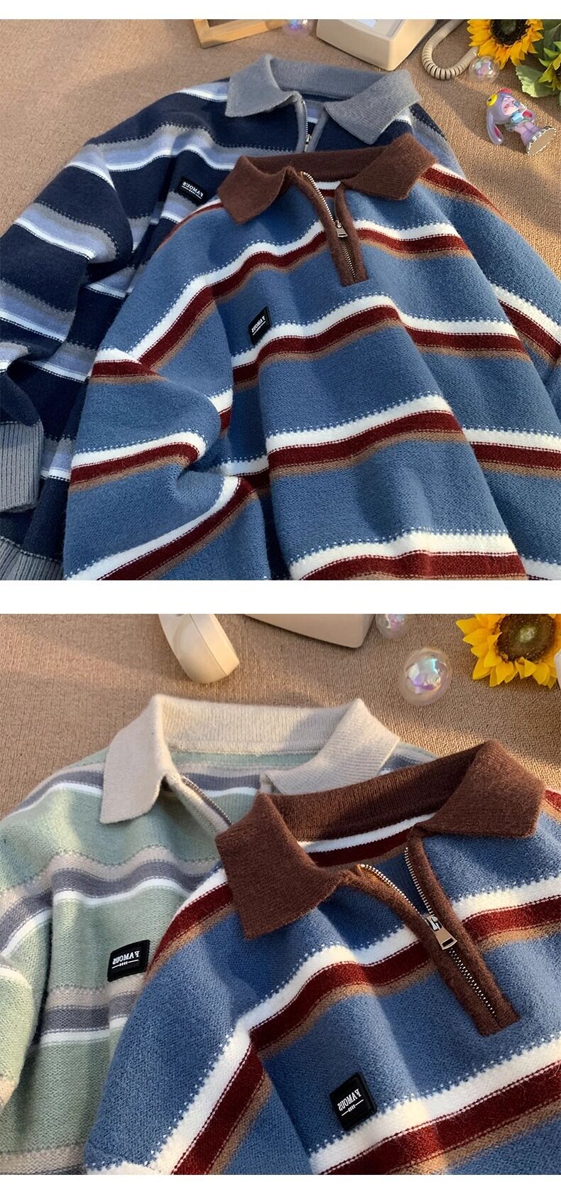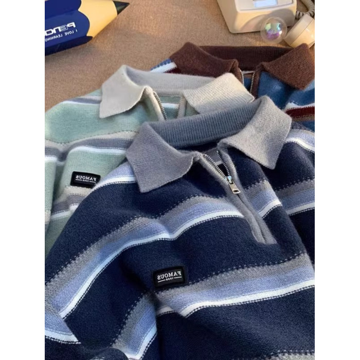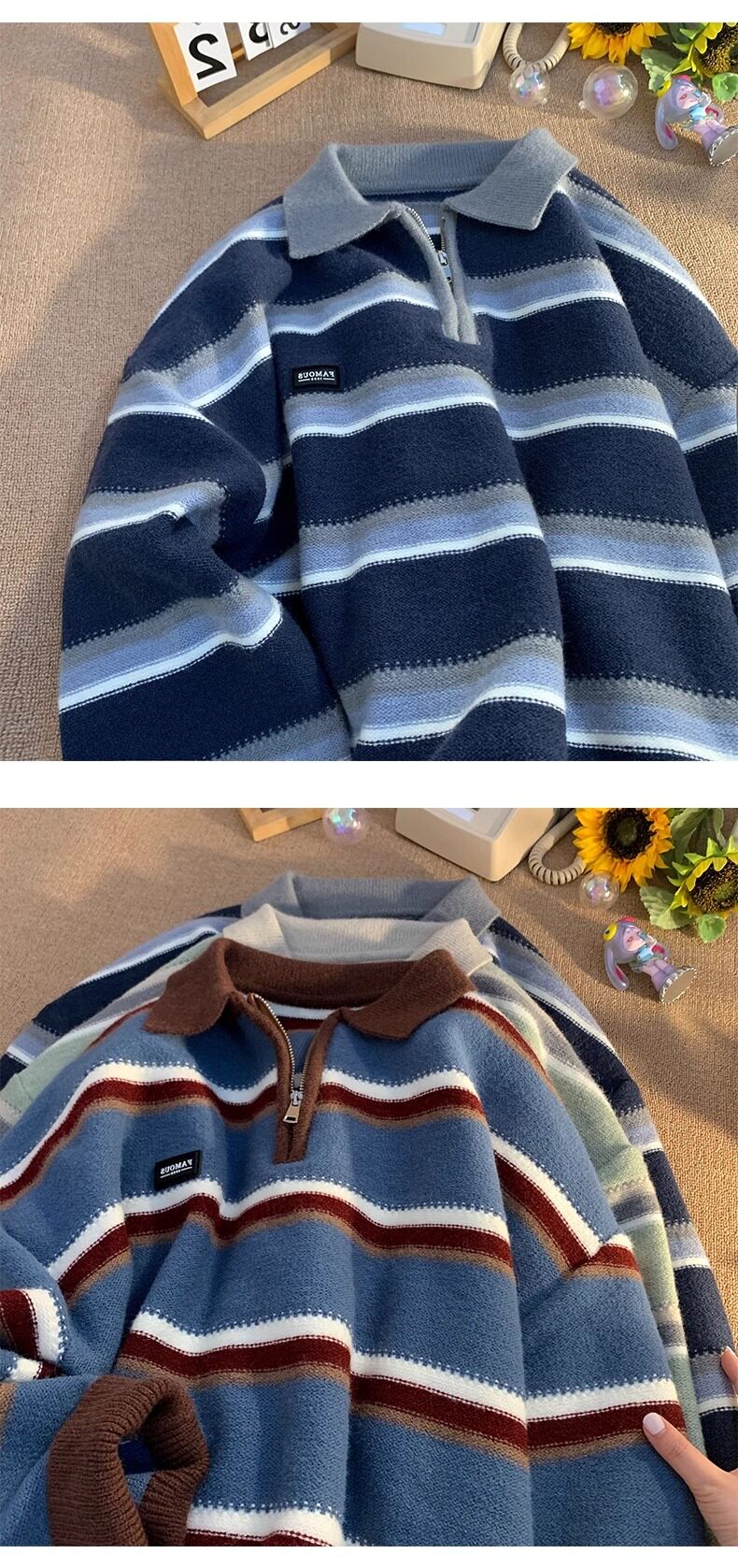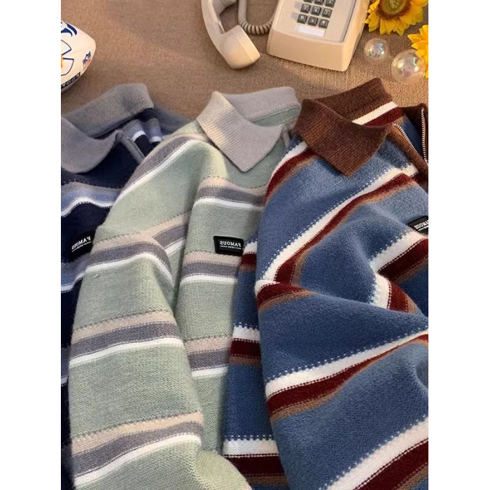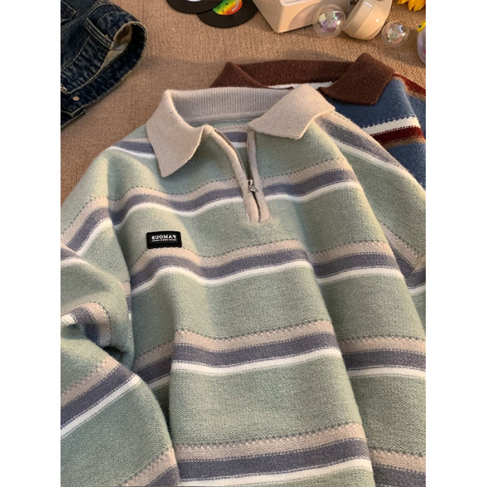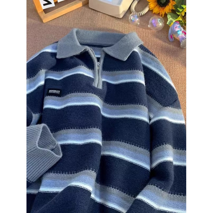 日系復古條紋半拉鍊polo領毛衣男女冬季寬松慵懶風小衆設計感上衣