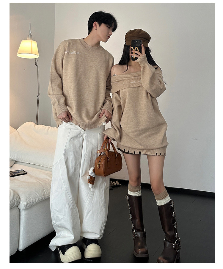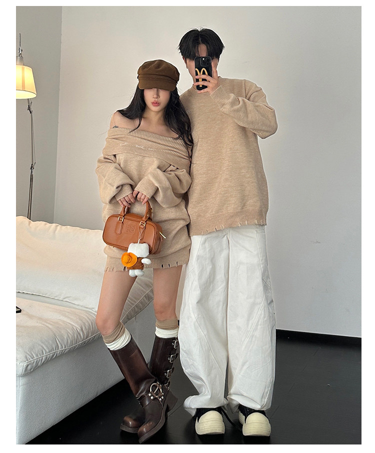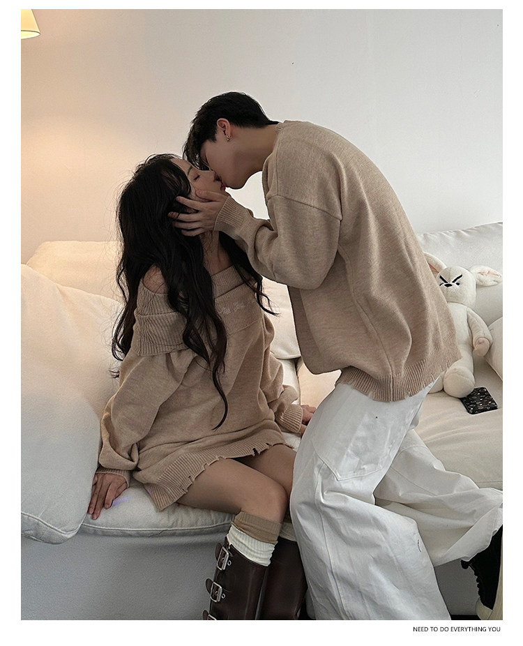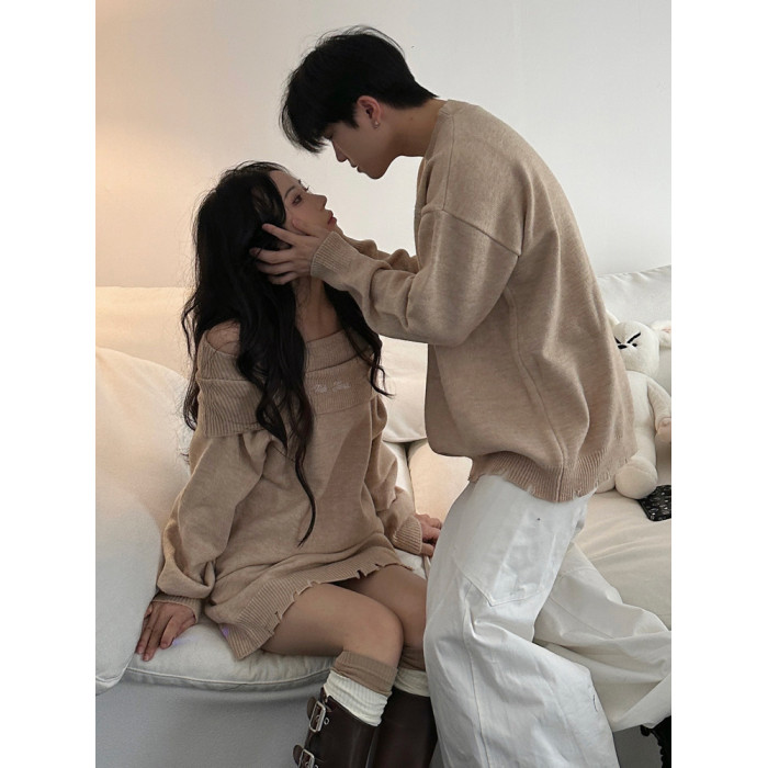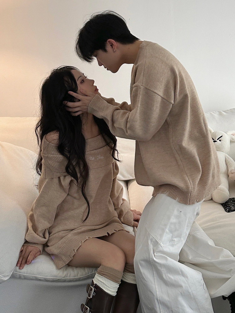 小衆設計感情侶裝秋冬INS超火毛衣一字肩露肩針織連衣裙一裙一衣