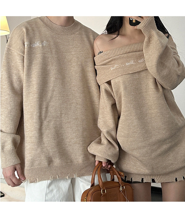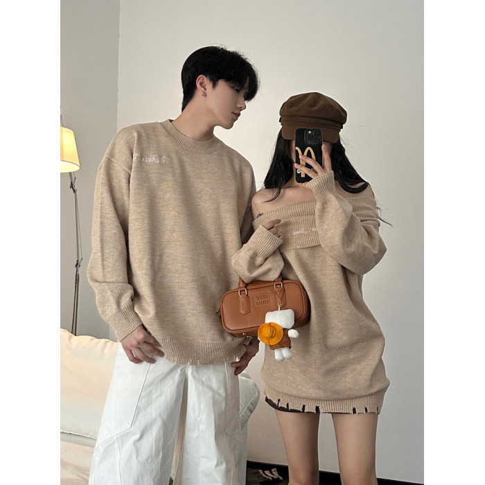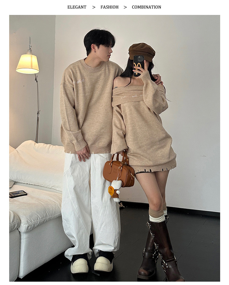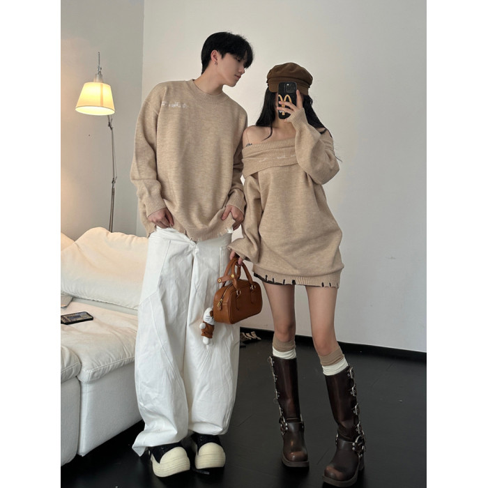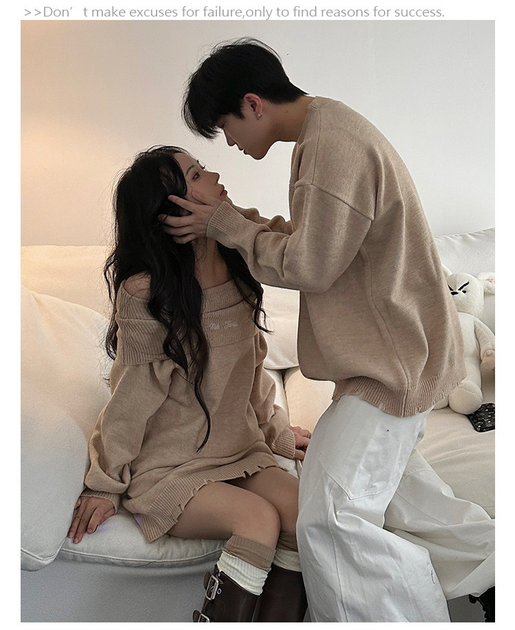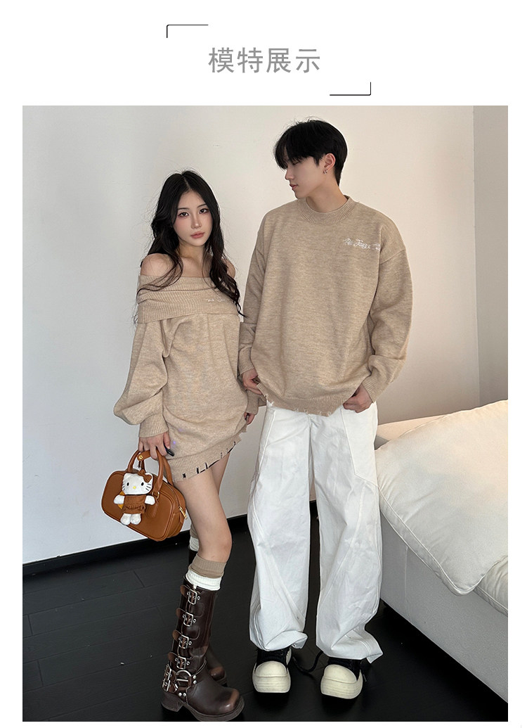 小衆設計感情侶裝秋冬INS超火毛衣一字肩露肩針織連衣裙一裙一衣
