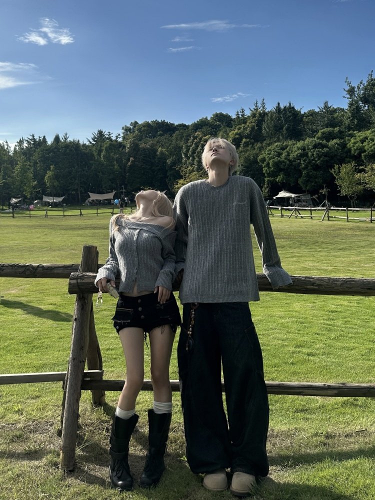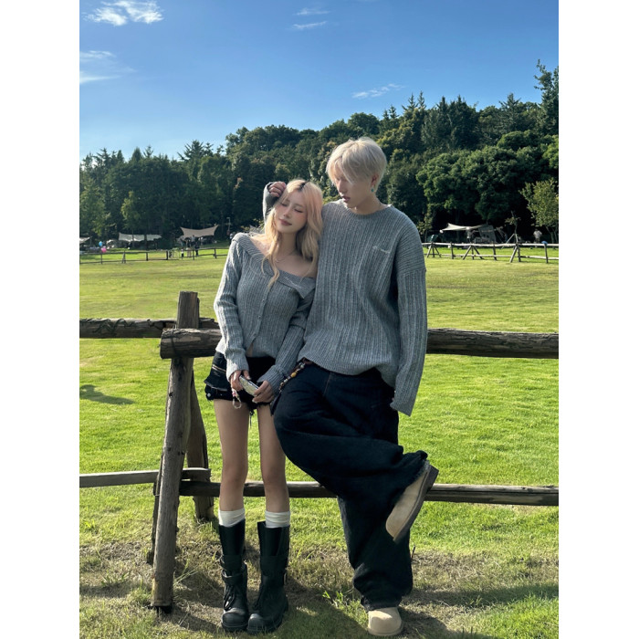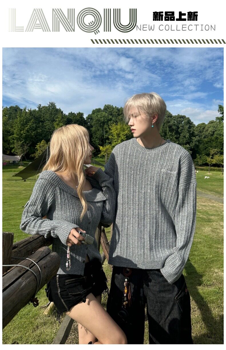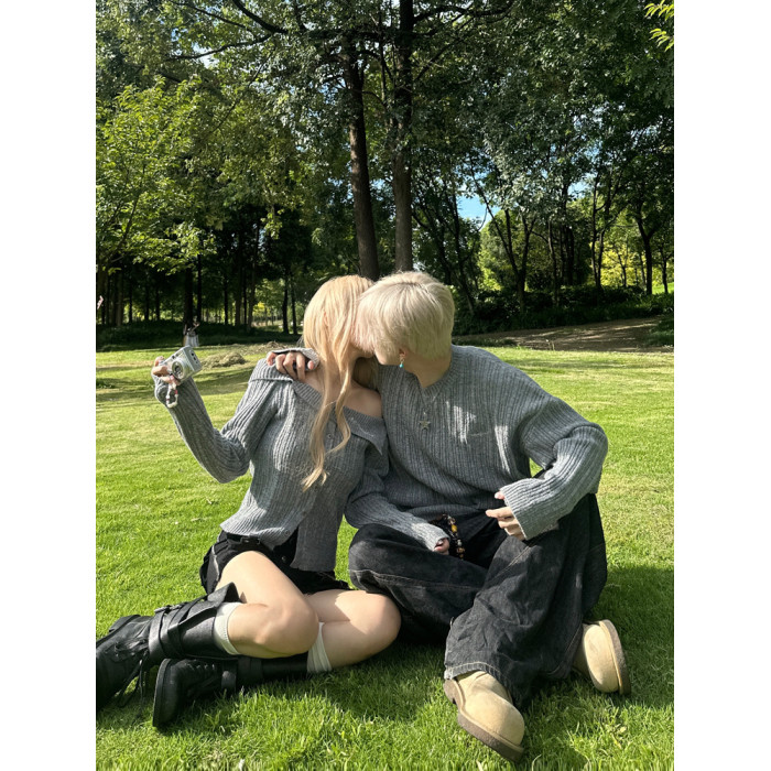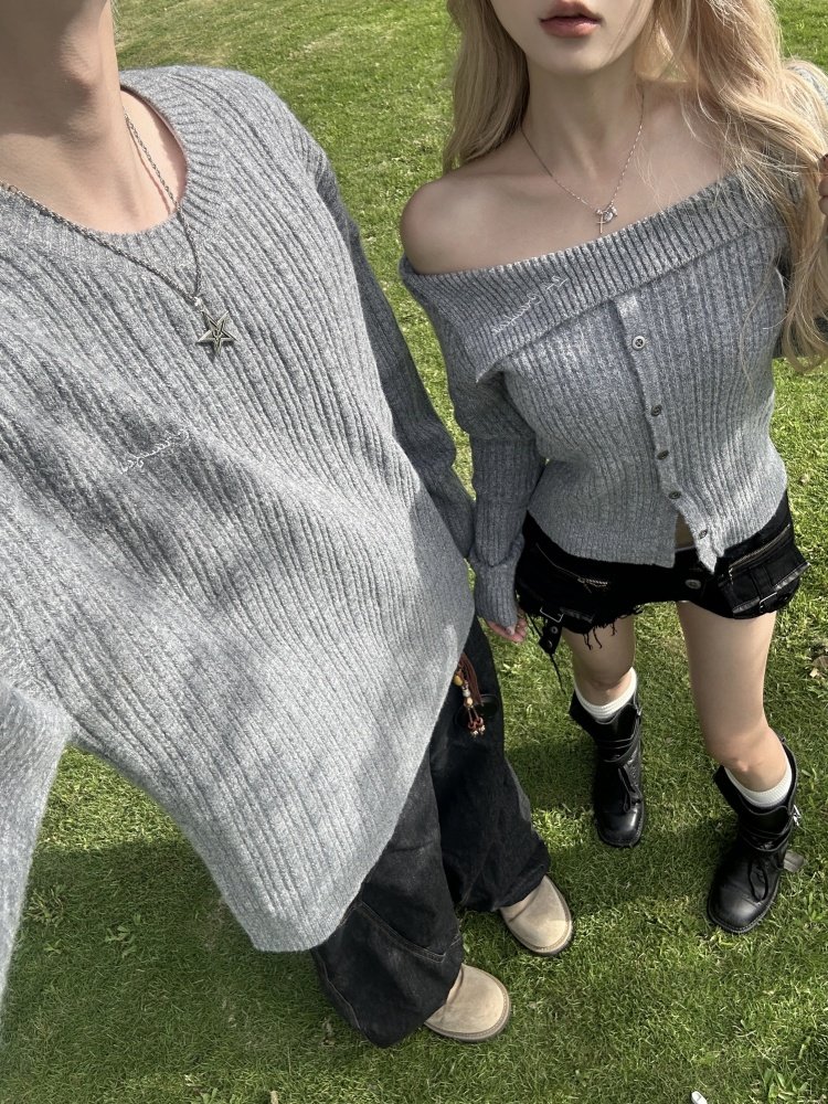 情侶裝2025秋冬新款純欲一字肩毛衣圓領軟糯綿韓系計感針織衫上衣
