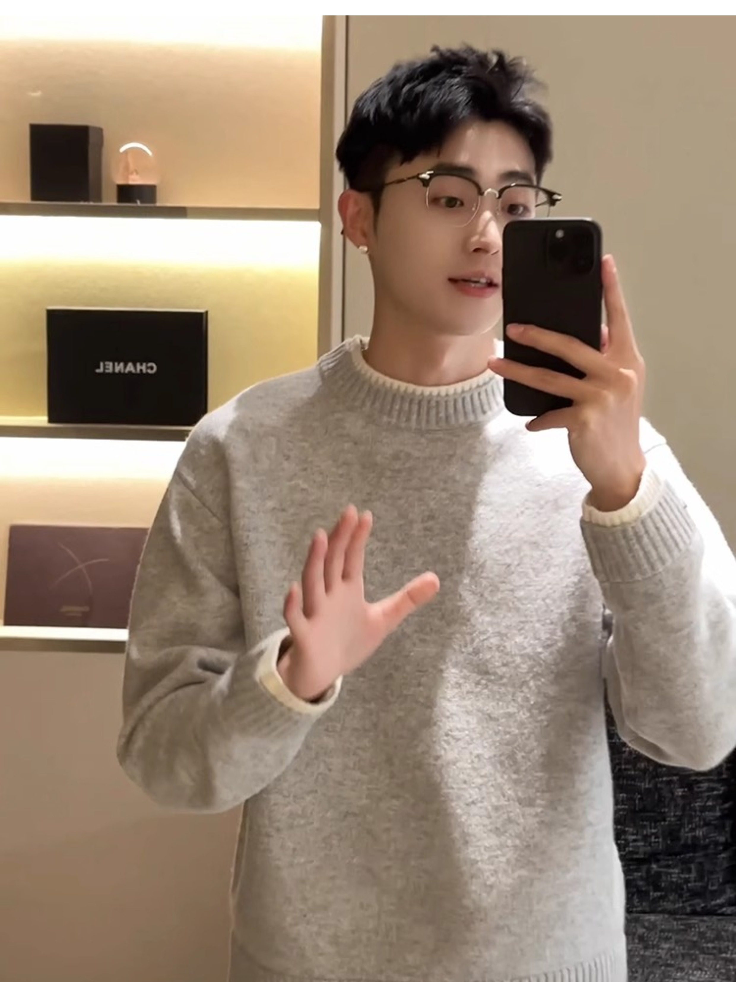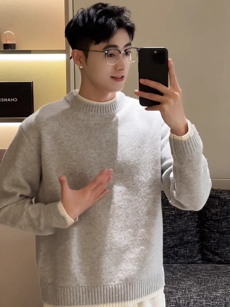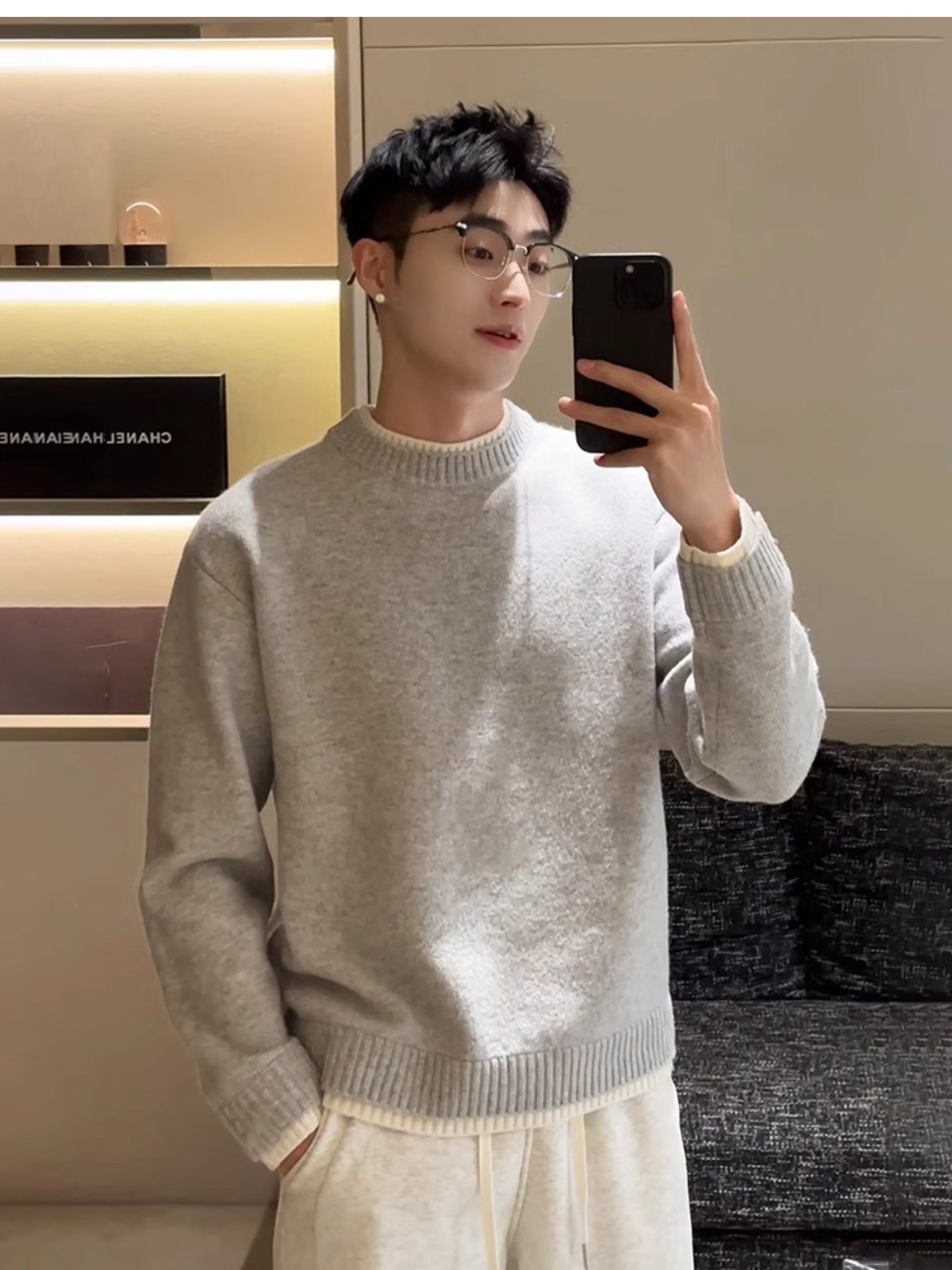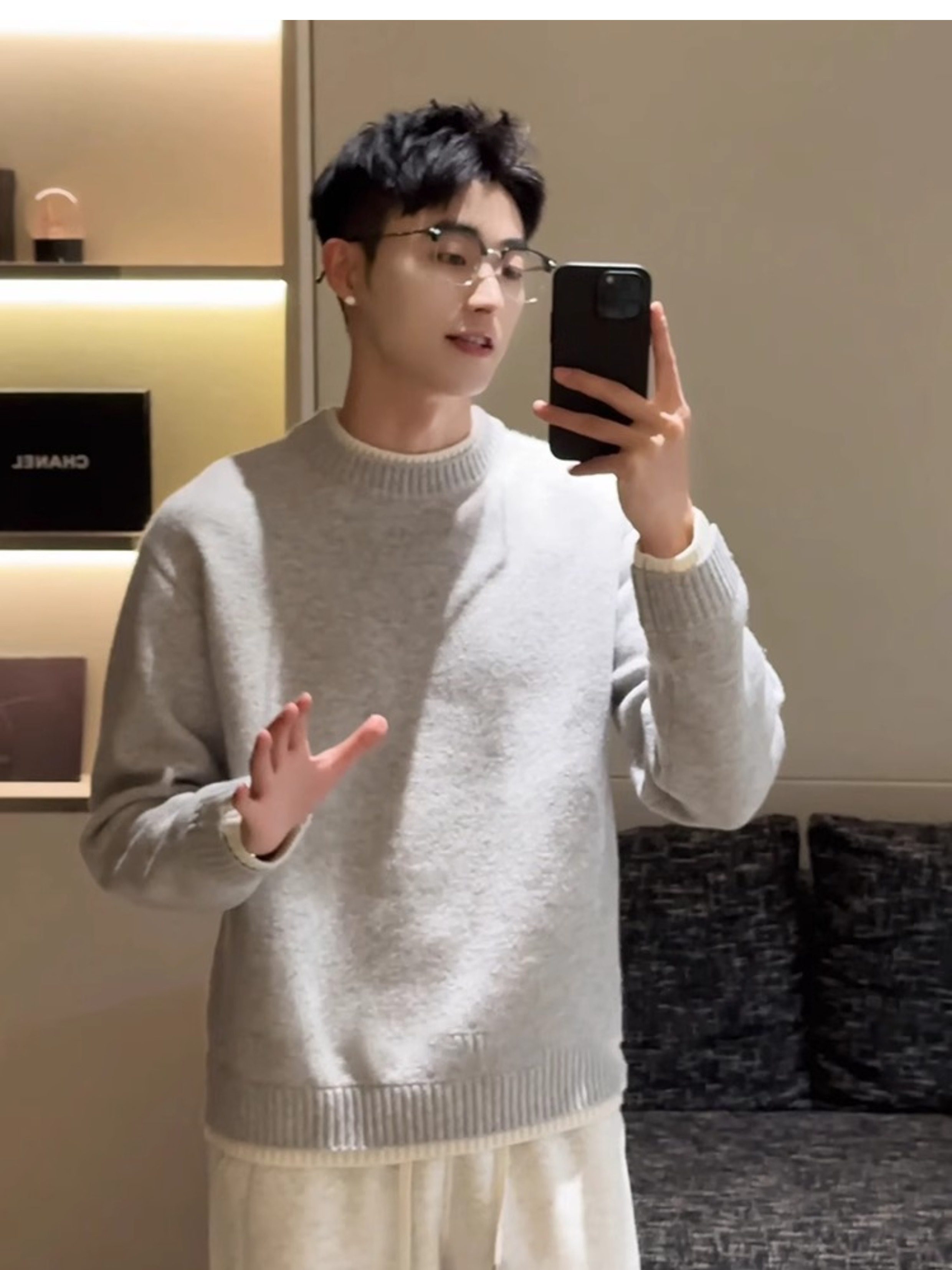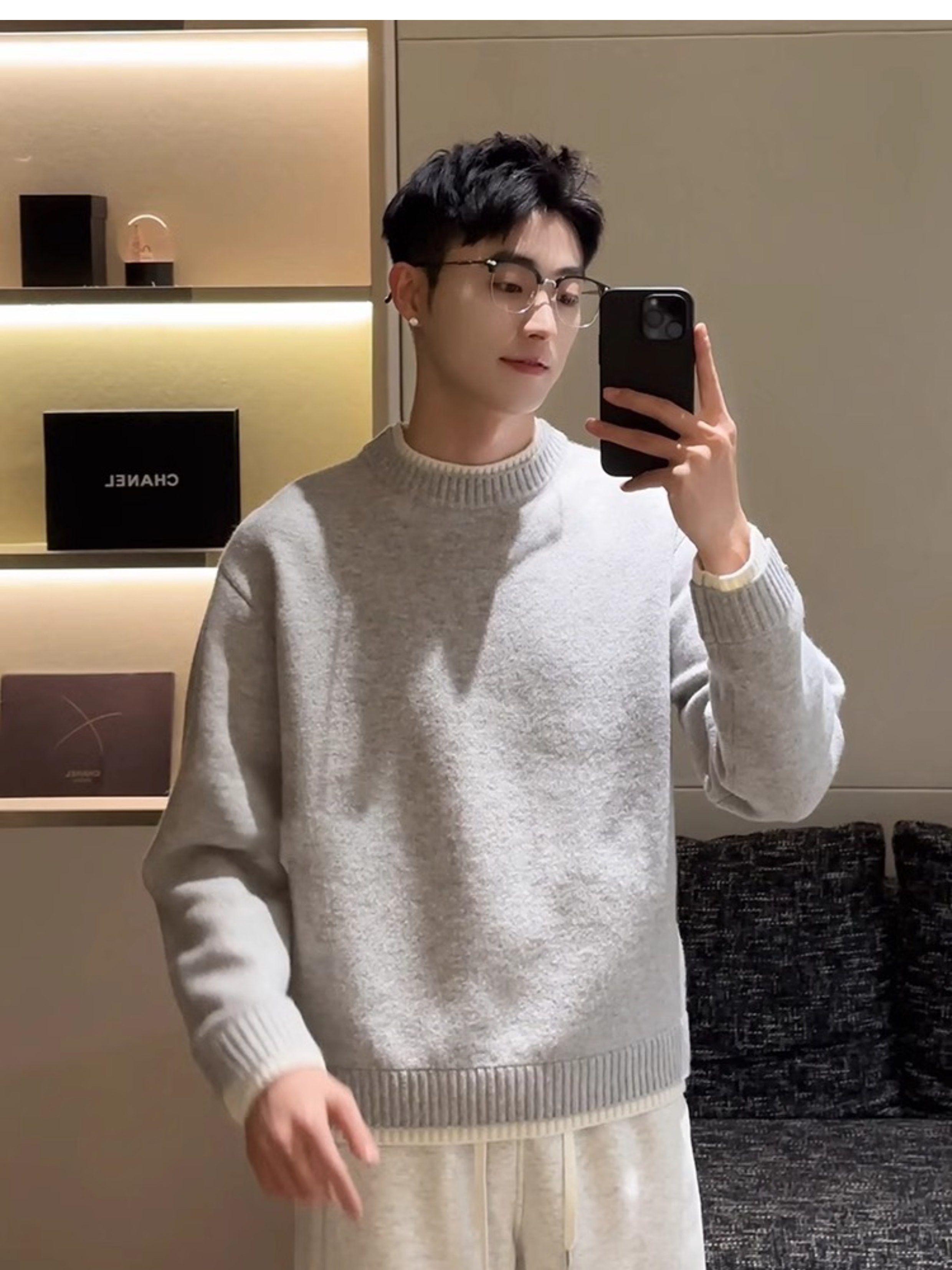 美利奴綿羊毛混紡假兩件圓領毛衣男士羊毛衫秋冬新款內搭針織衫男