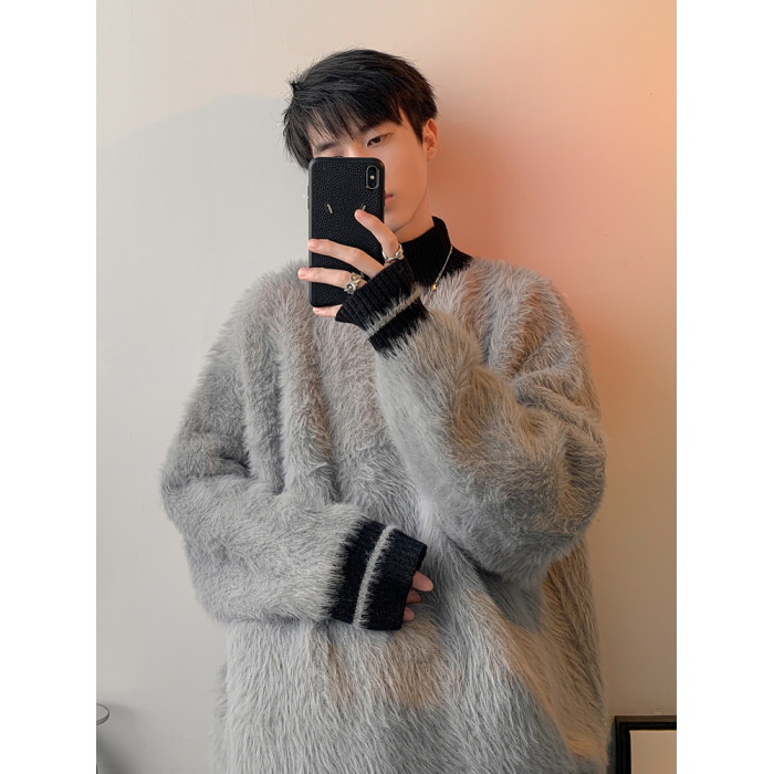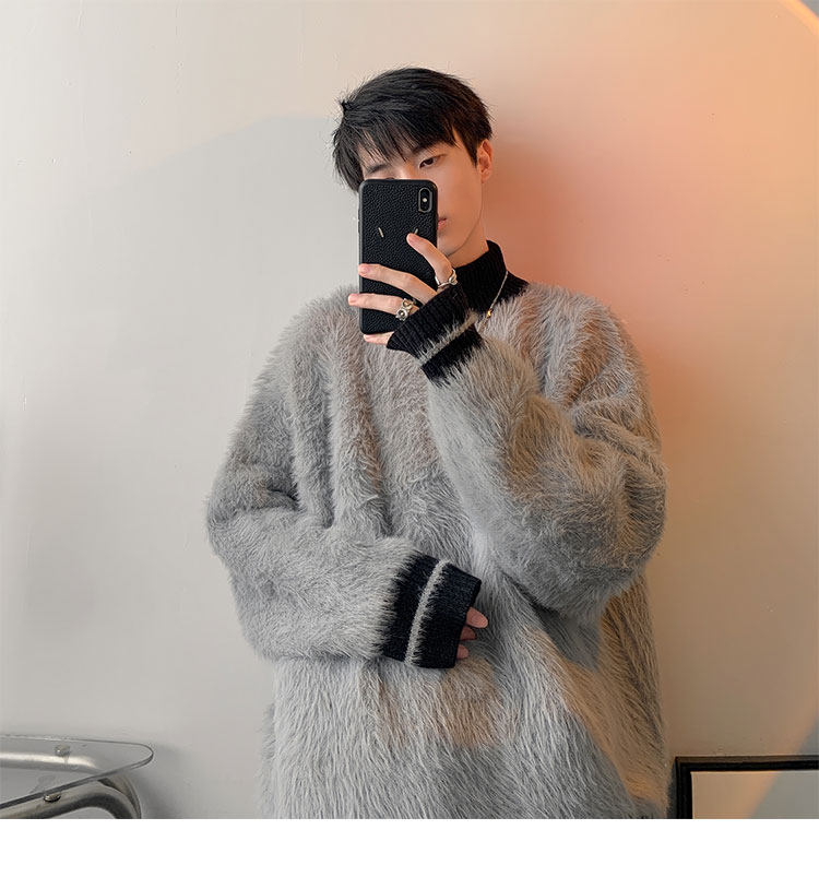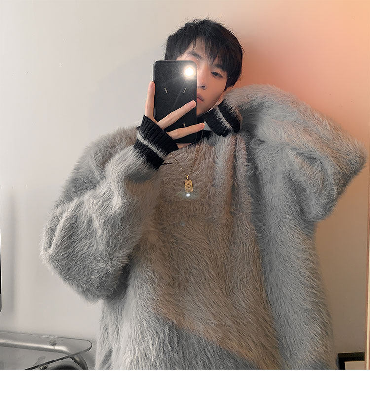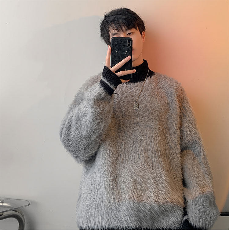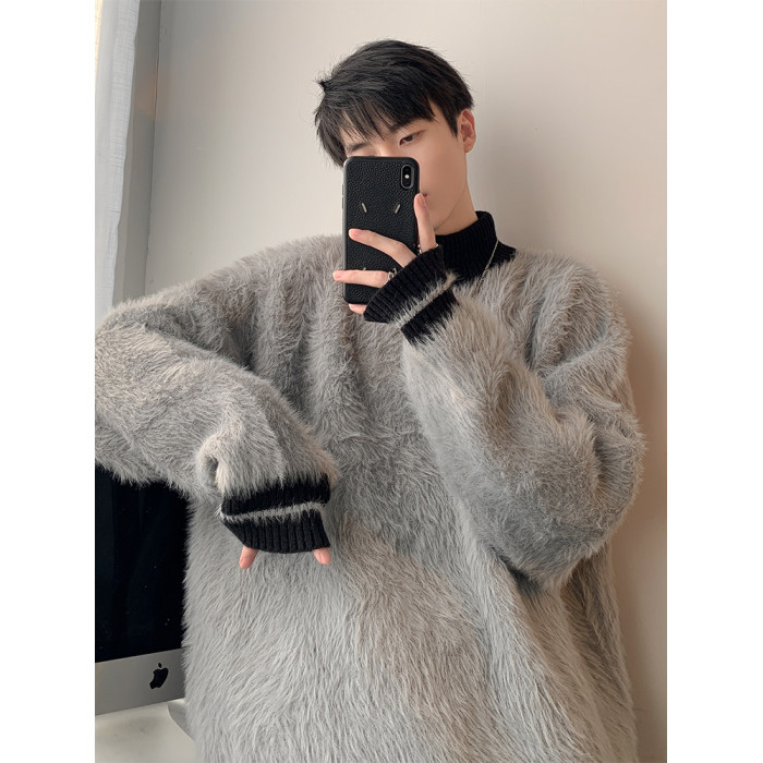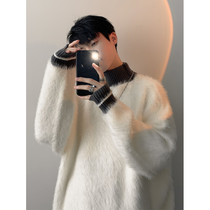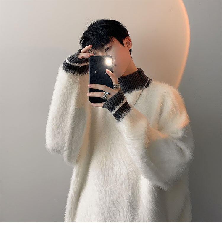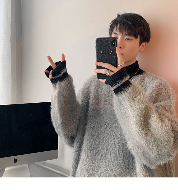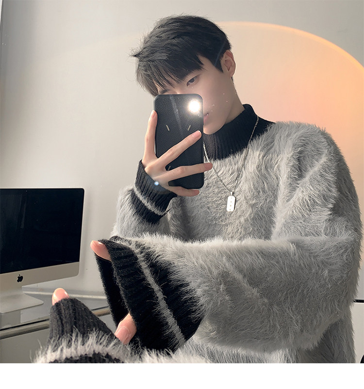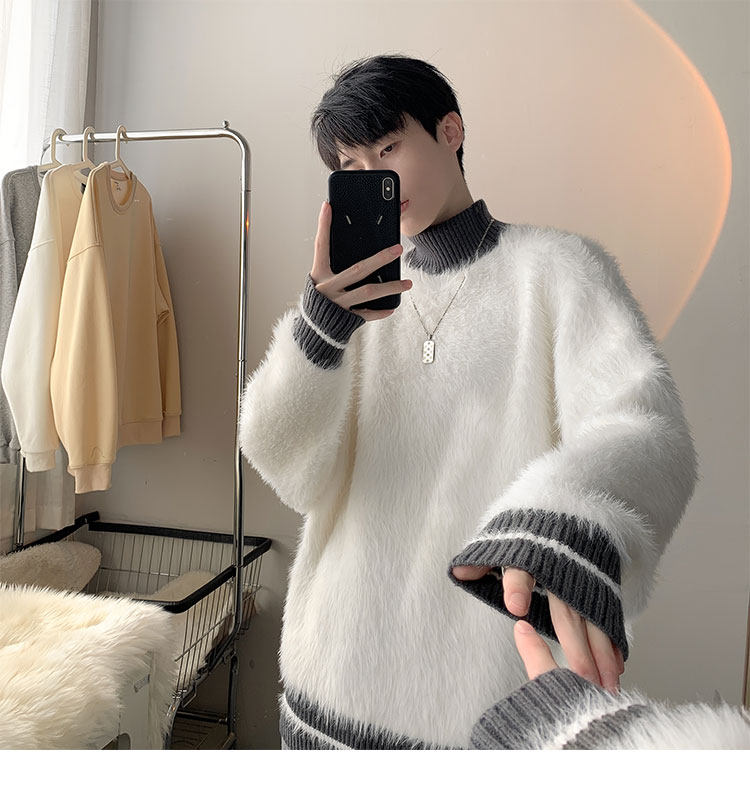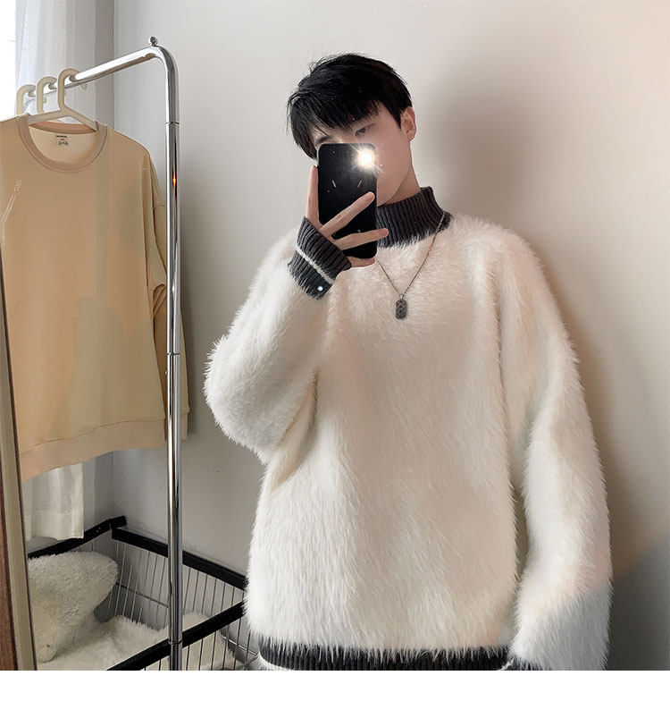 高級感水貂絨高領毛衣男秋冬季新款加厚慵嬾風針織內搭男生打底衫
