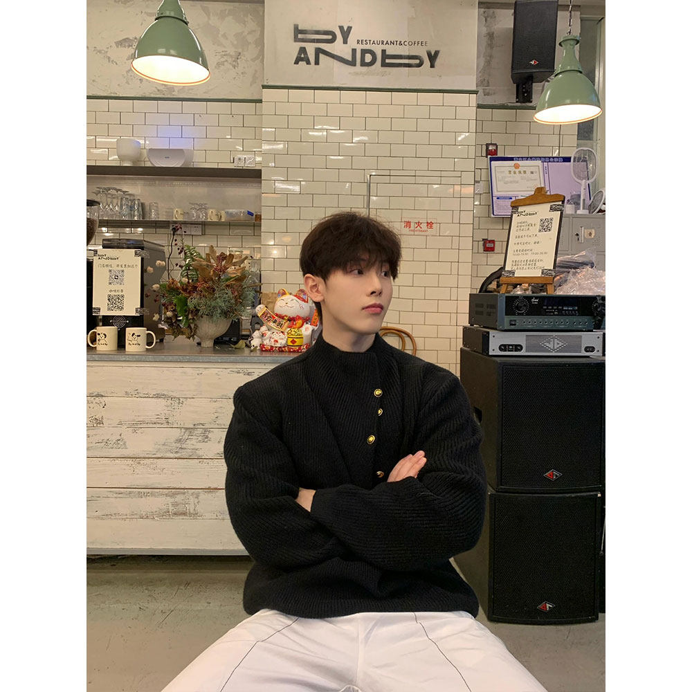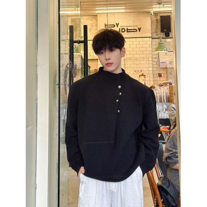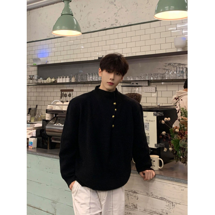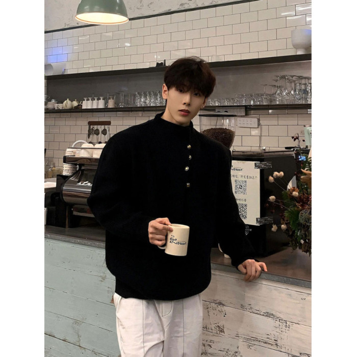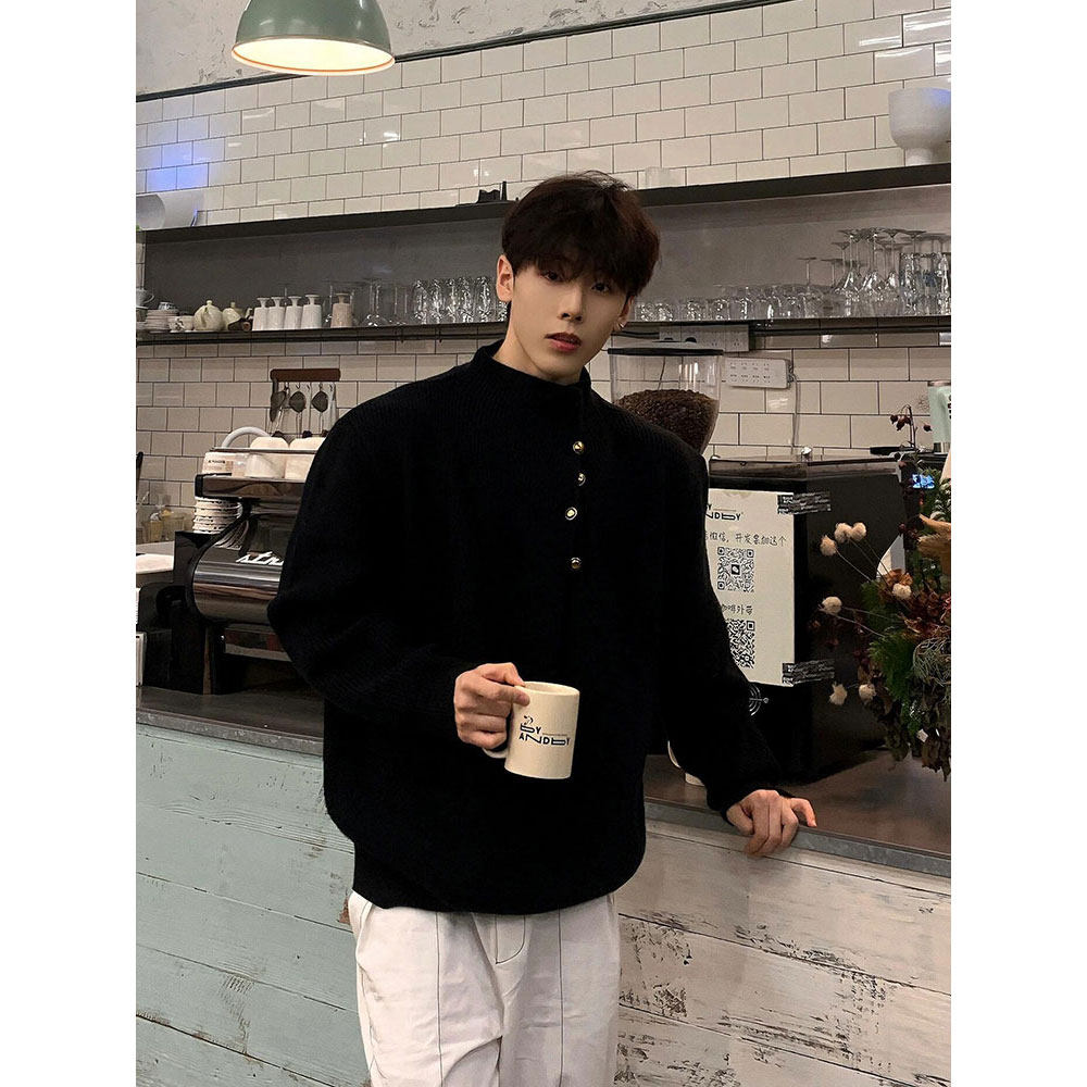 韓版側紐釦設計感半高領毛衣男款冬季休閒寬松百搭cleanfit針織衫