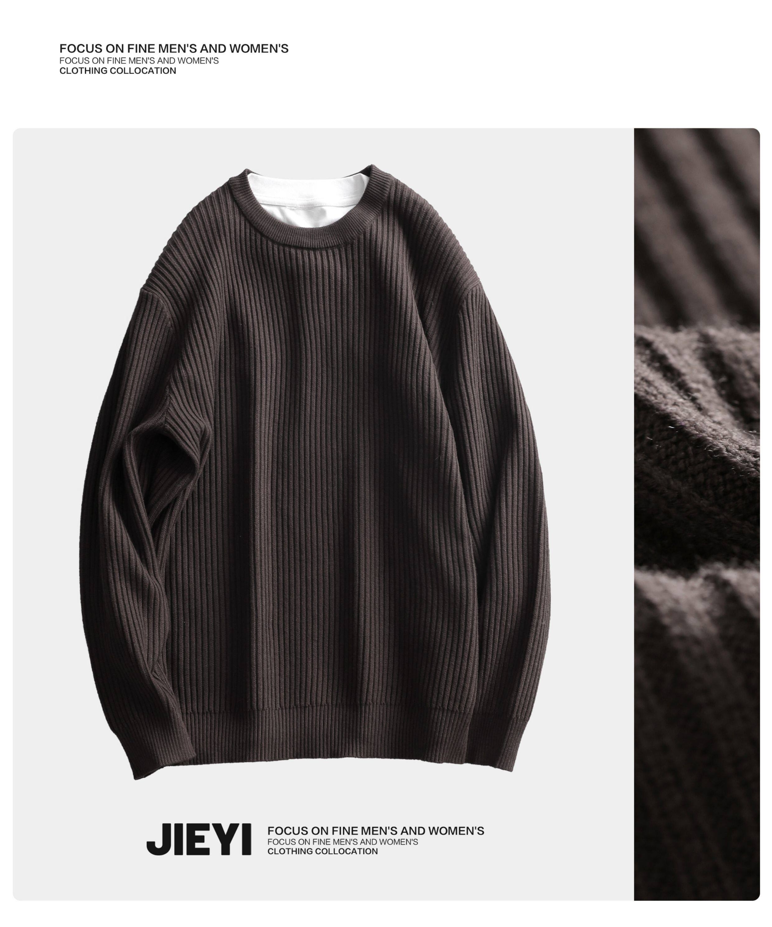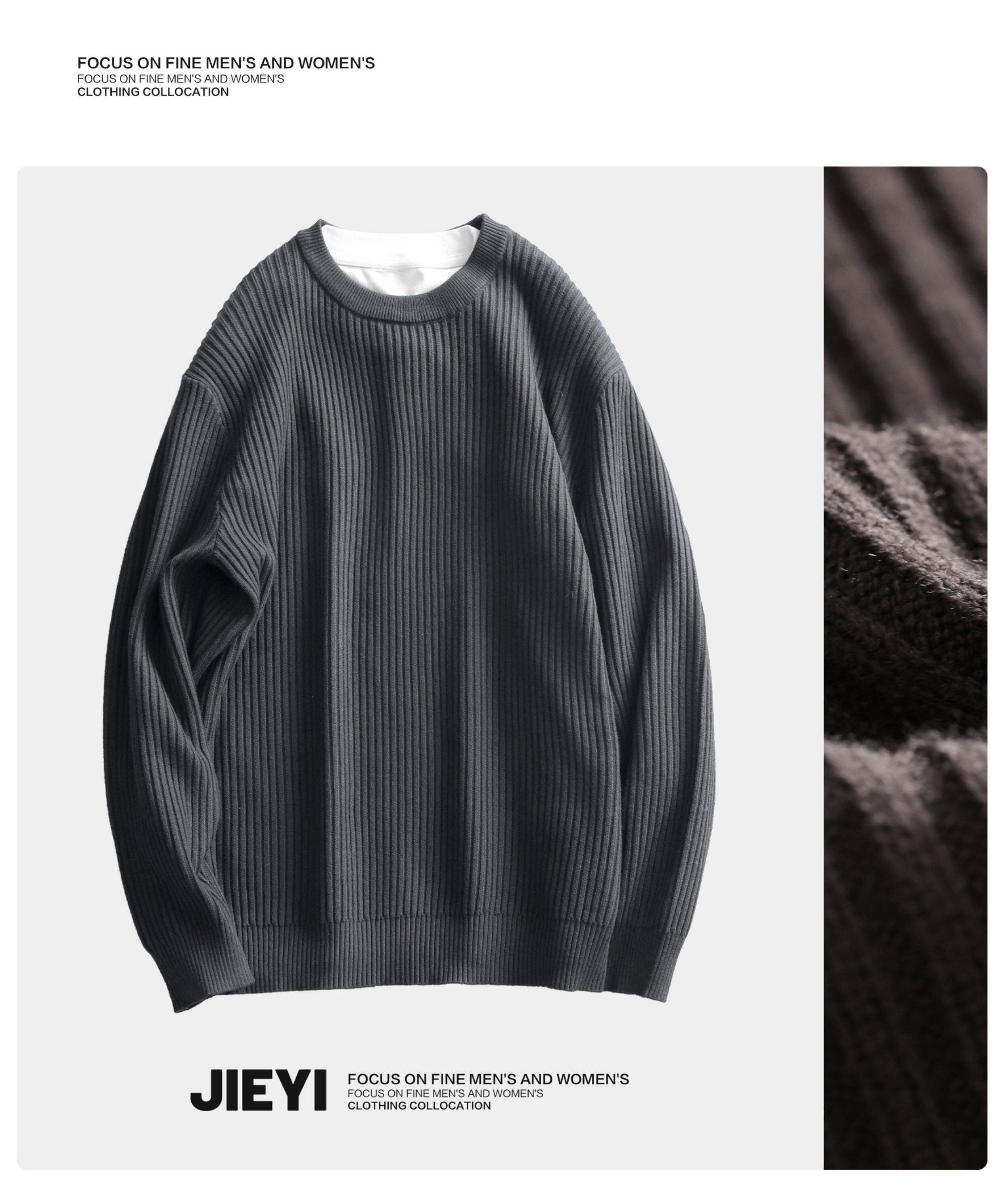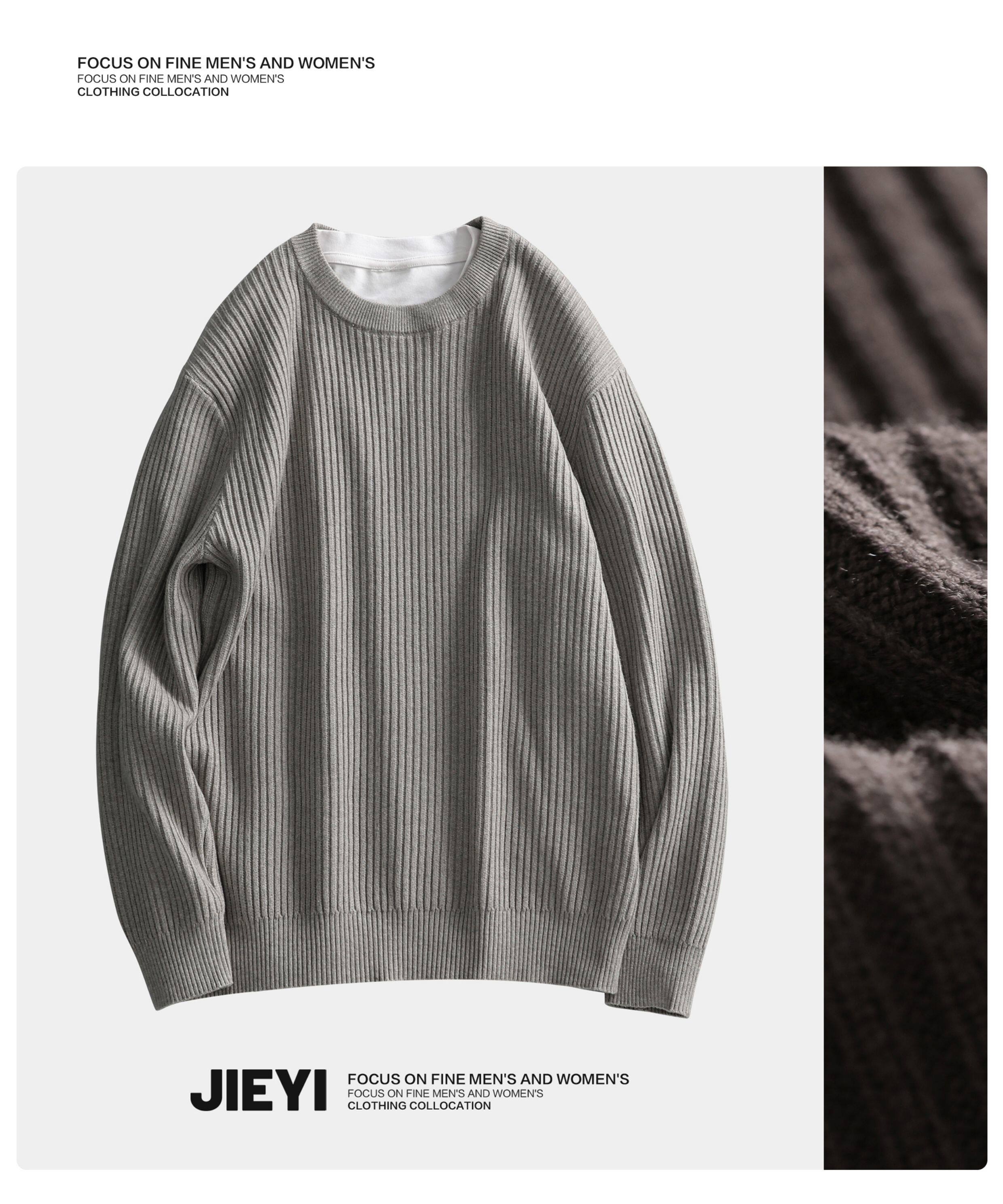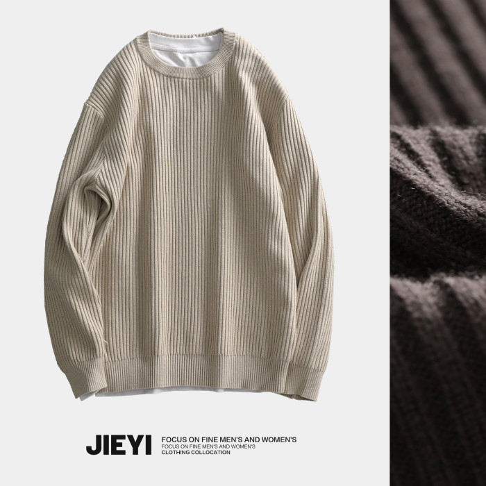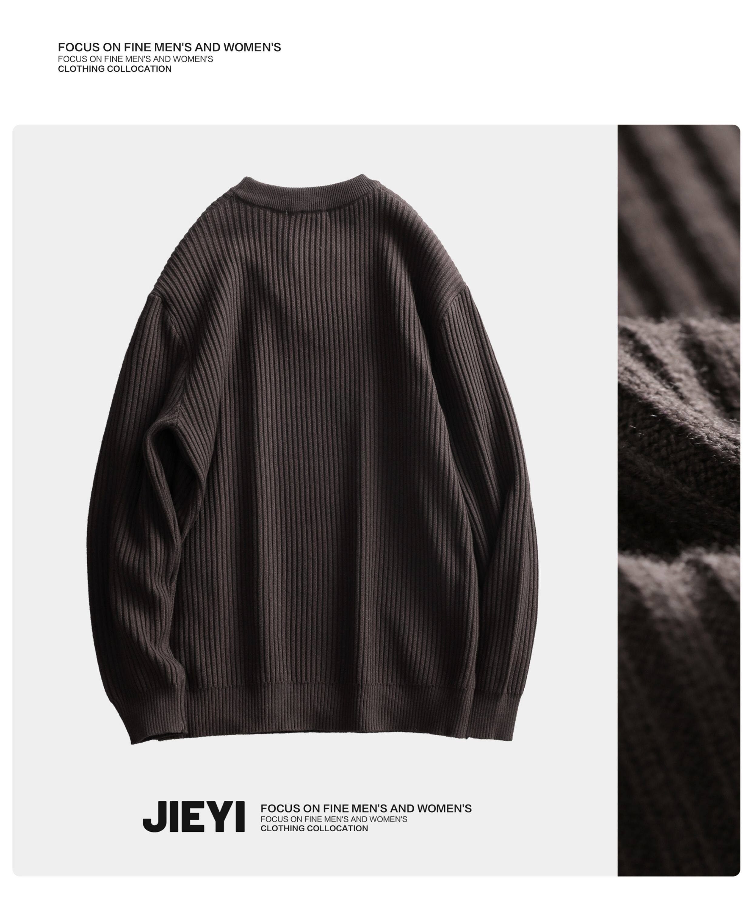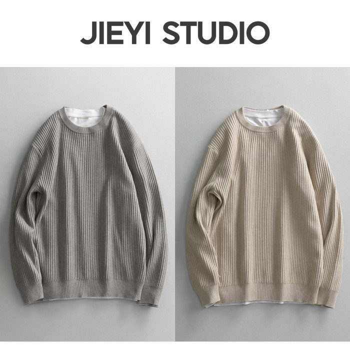 介乙 坑條紋理圓領毛衣男慵懶風潮流韓系提花針織衫保暖單穿上衣