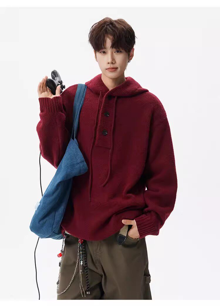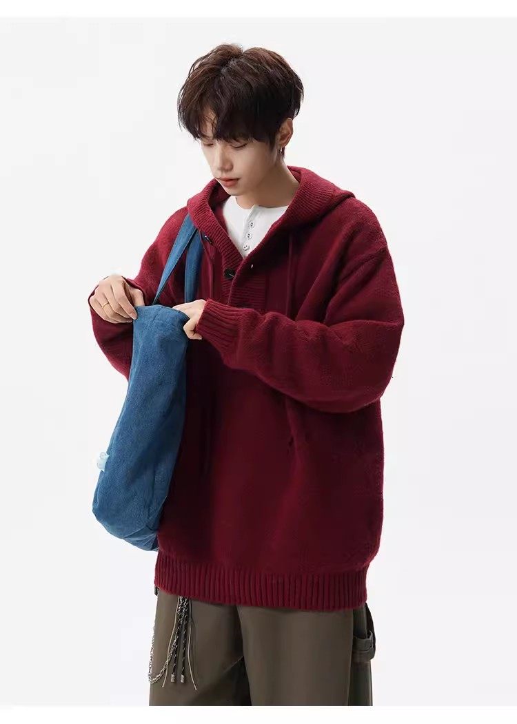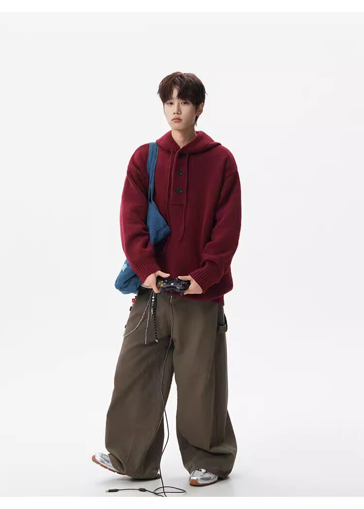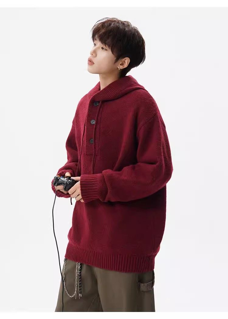 美式安可拉紅半開衫連帽毛衣男秋季潮牌慵嬾風針織衫寬鬆情侶外套