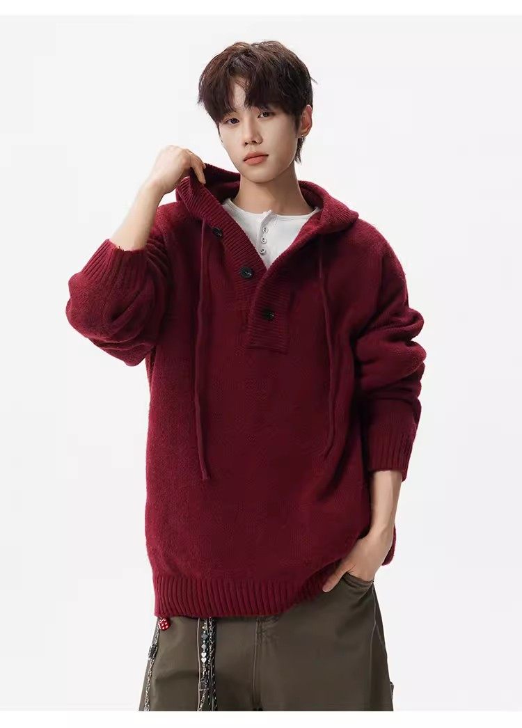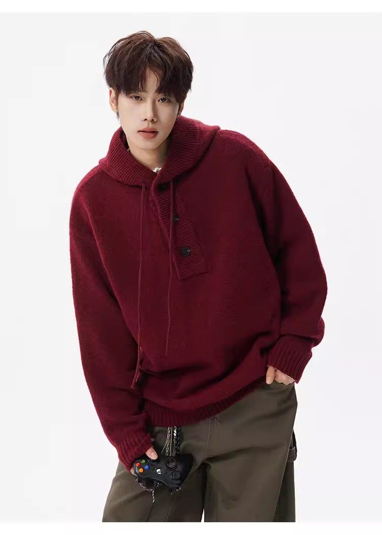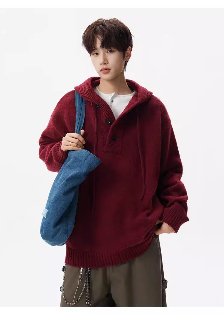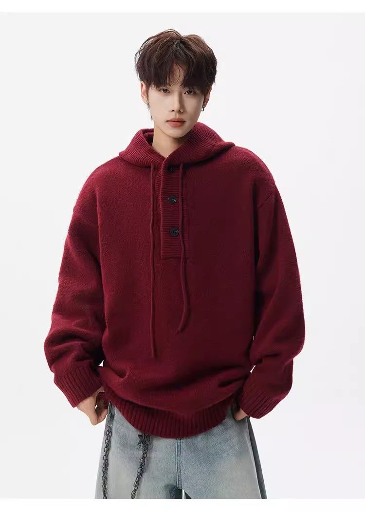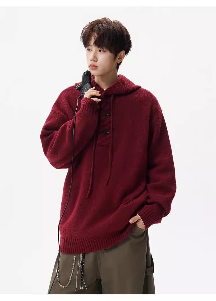美式安可拉紅半開衫連帽毛衣男秋季潮牌慵嬾風針織衫寬鬆情侶外套
