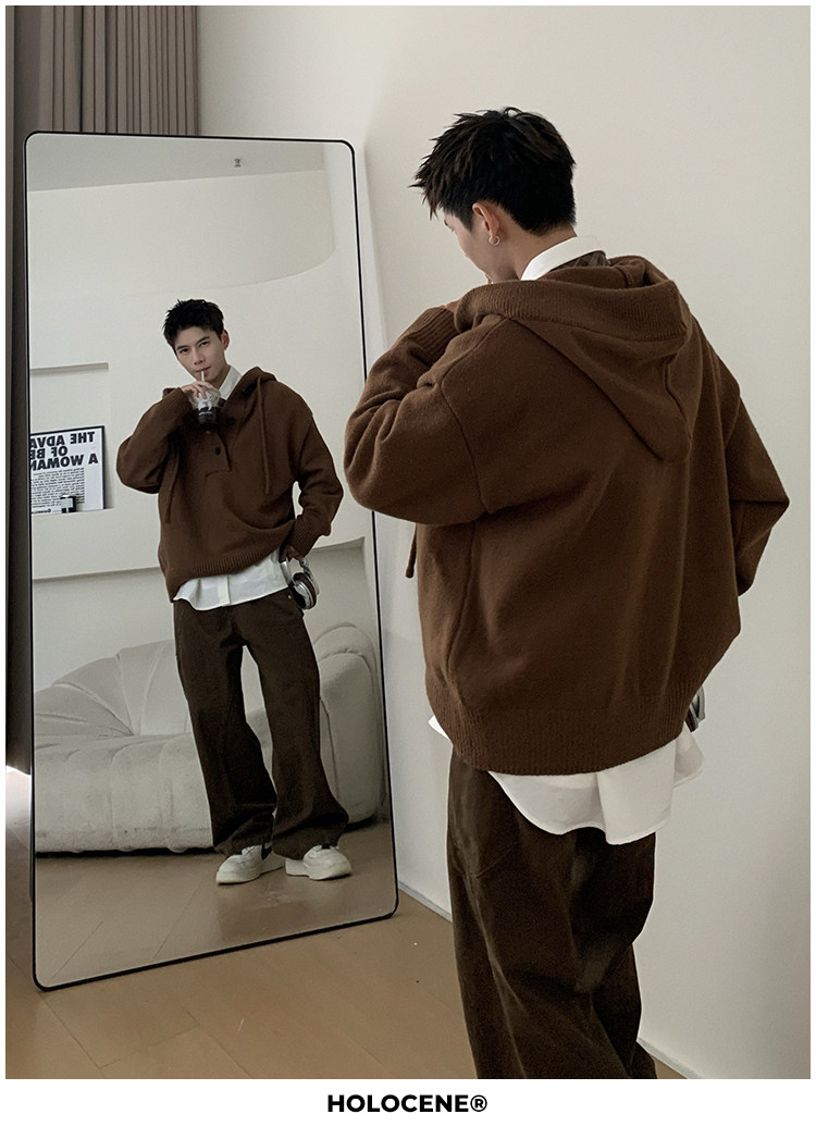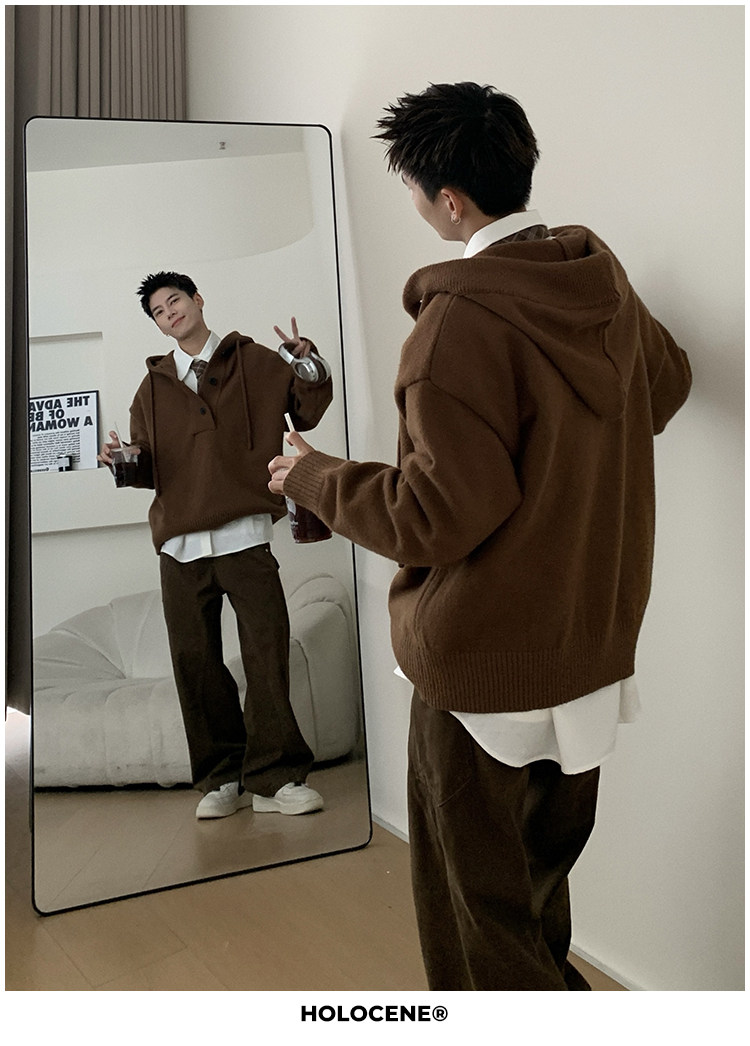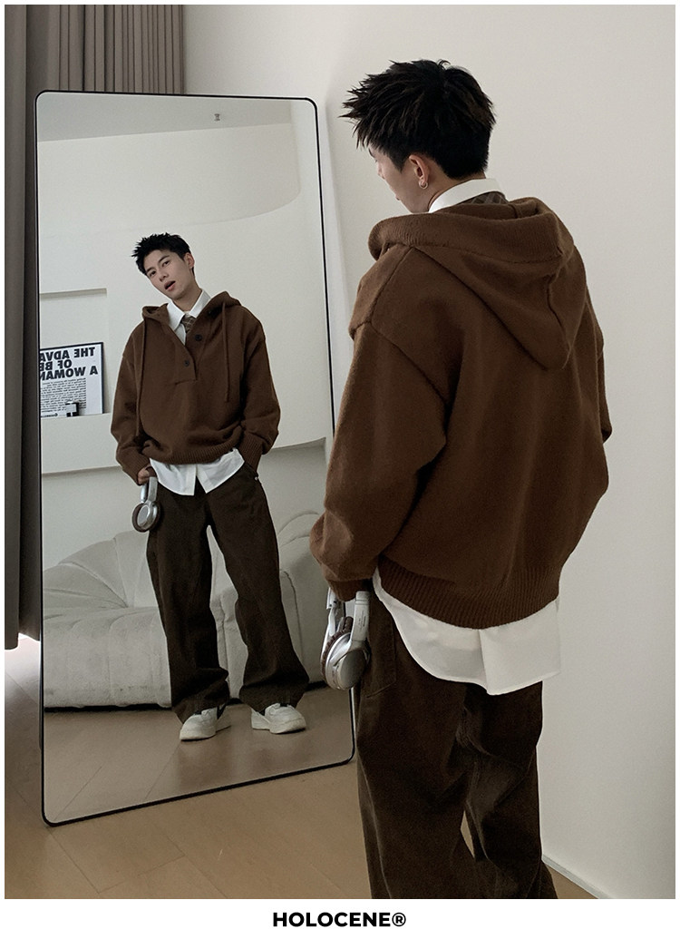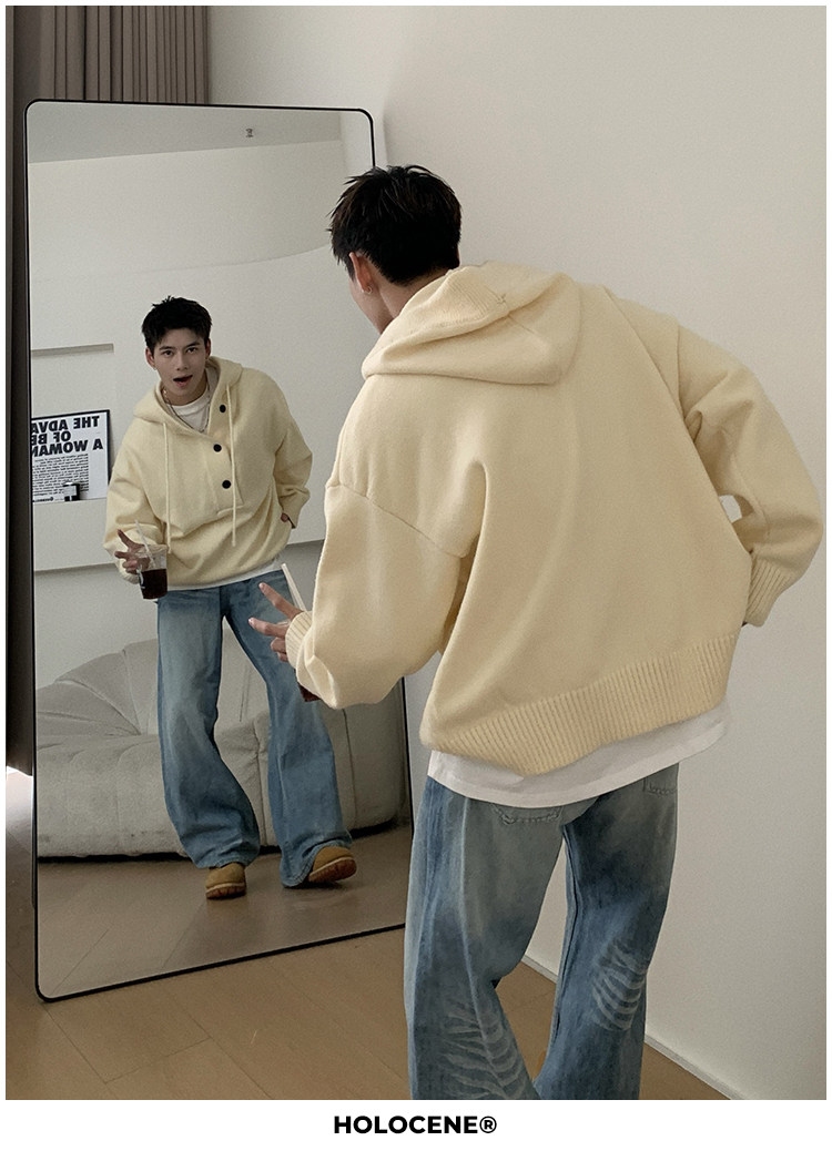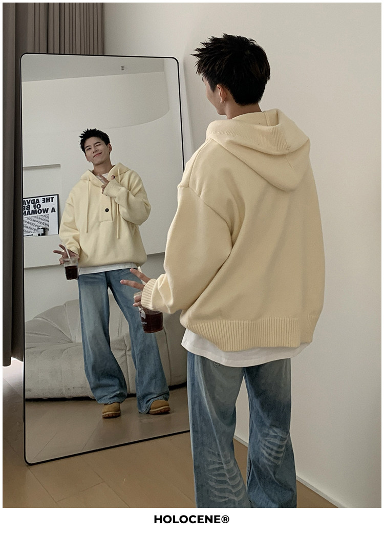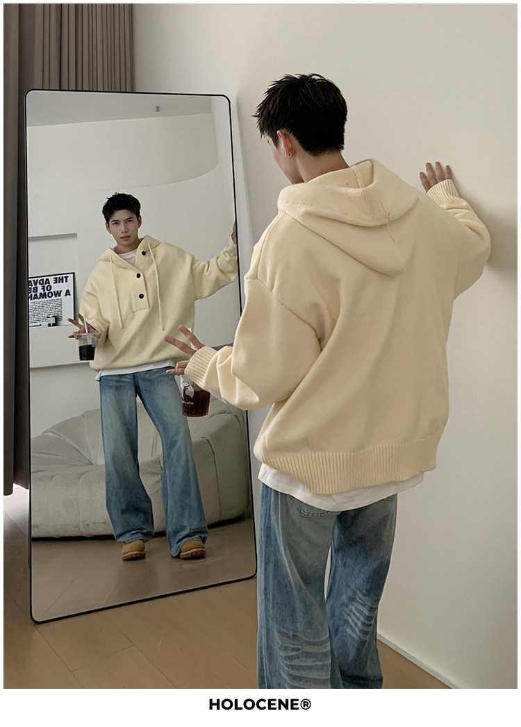 Holocene美式潮牌超好看秋冬連帽毛衣半開衫紐釦情侶套頭針織衫男