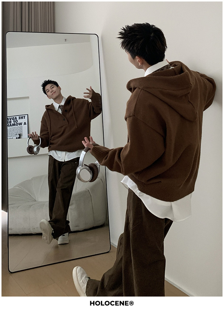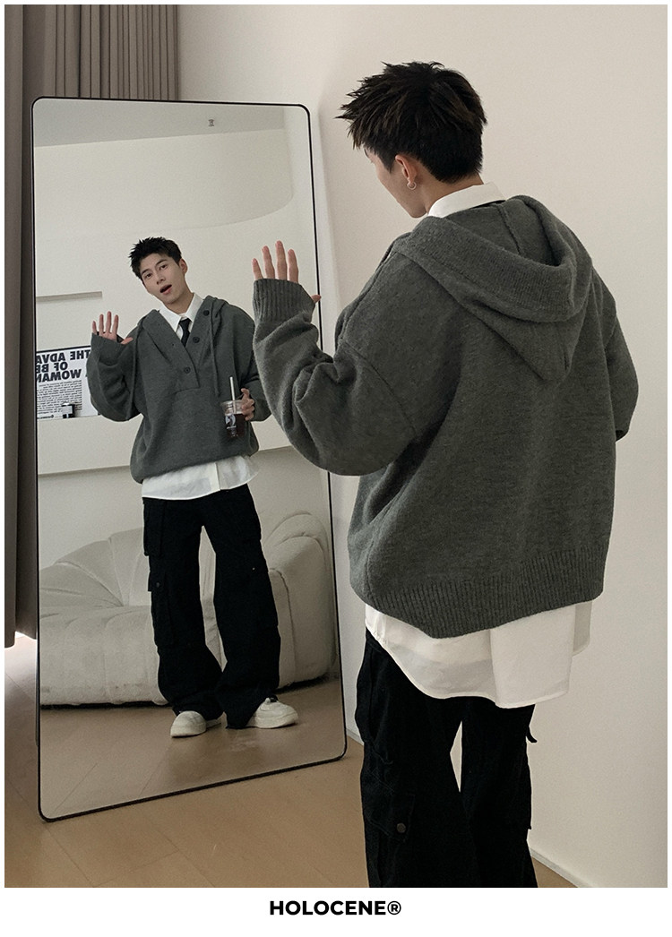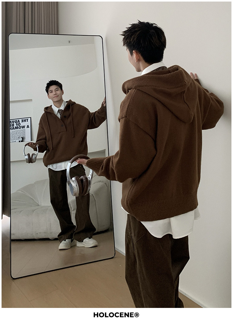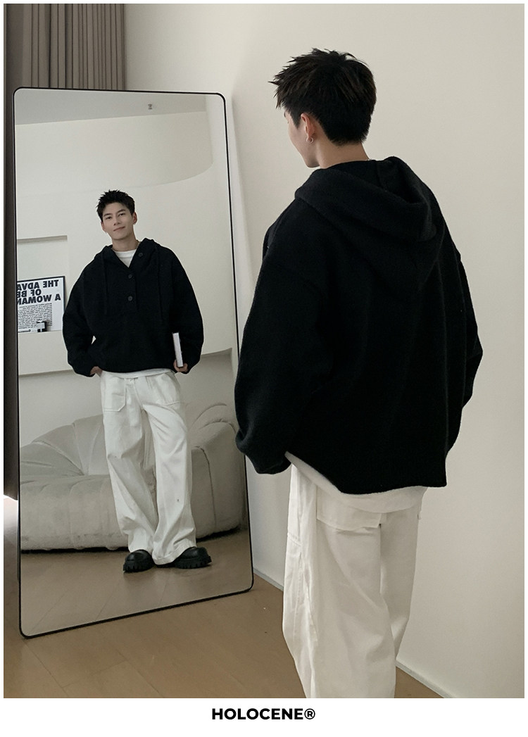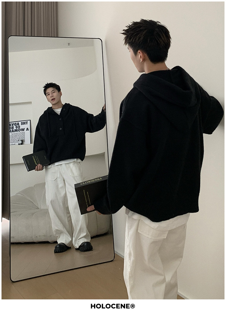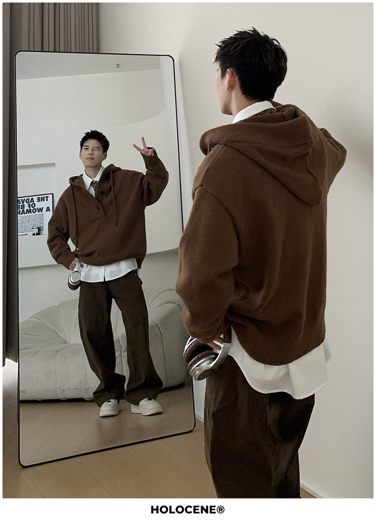 Holocene美式潮牌超好看秋冬連帽毛衣半開衫紐釦情侶套頭針織衫男