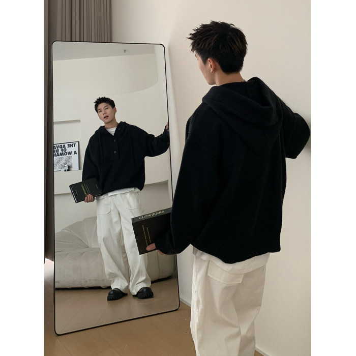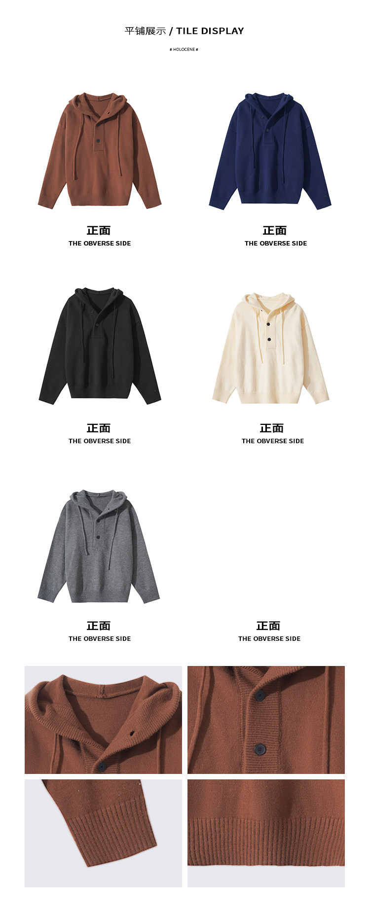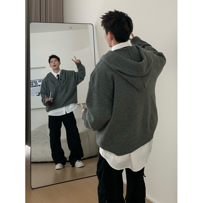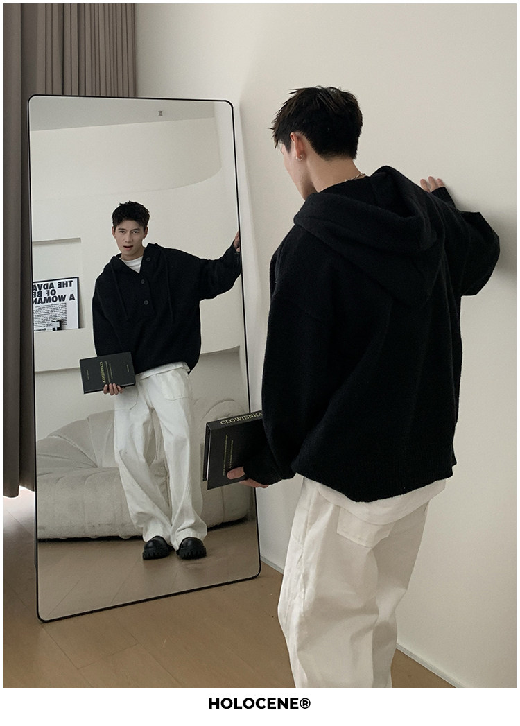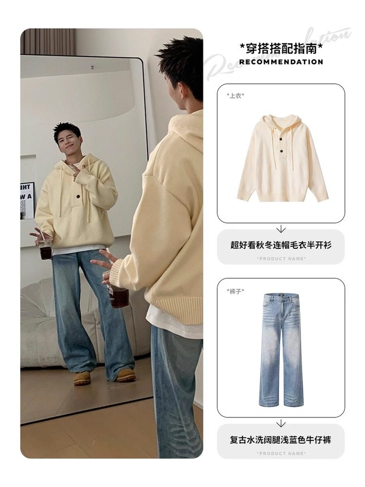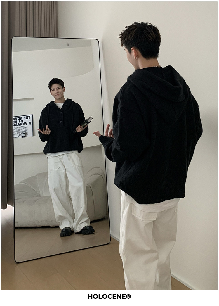 Holocene美式潮牌超好看秋冬連帽毛衣半開衫紐釦情侶套頭針織衫男