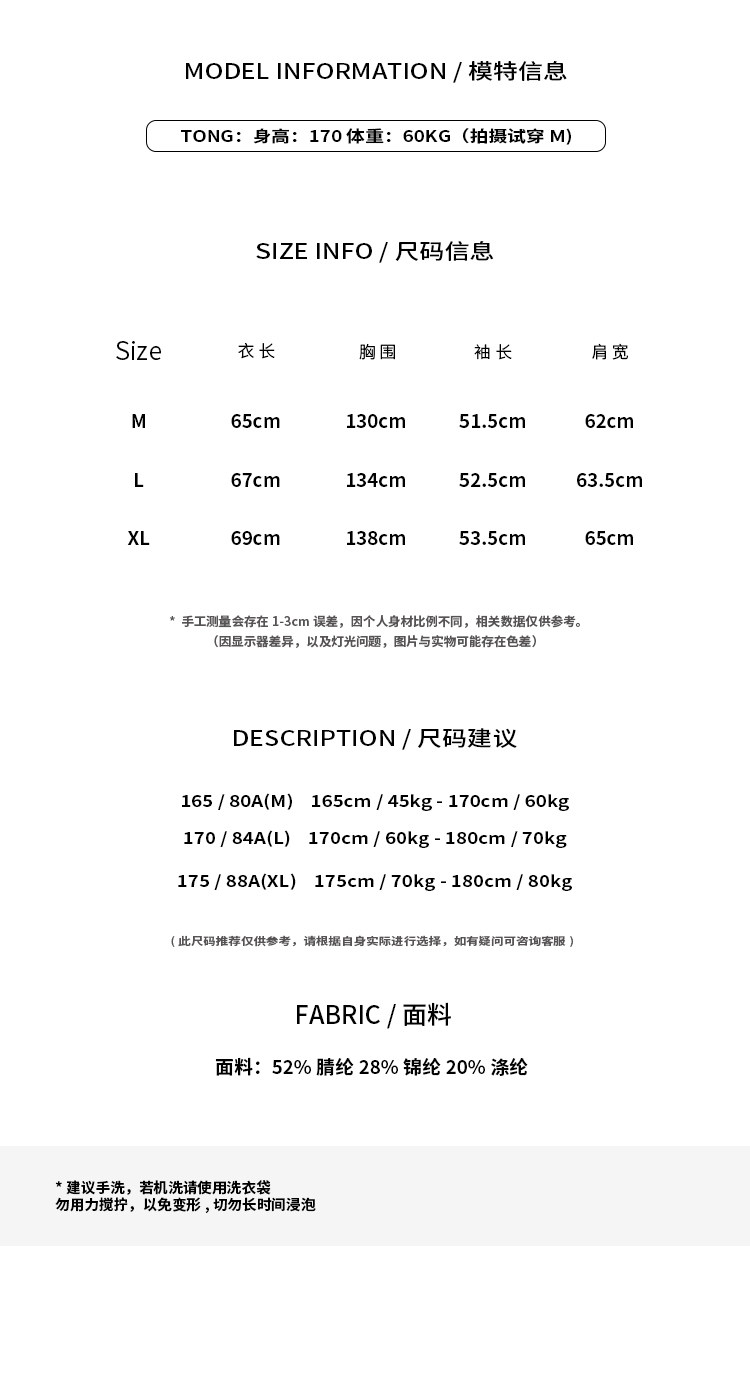材質成分 聚丙烯腈纖維(腈綸)52% 聚醯胺纖維(錦綸)28% 聚對苯二甲酸乙二酯(滌綸)20%