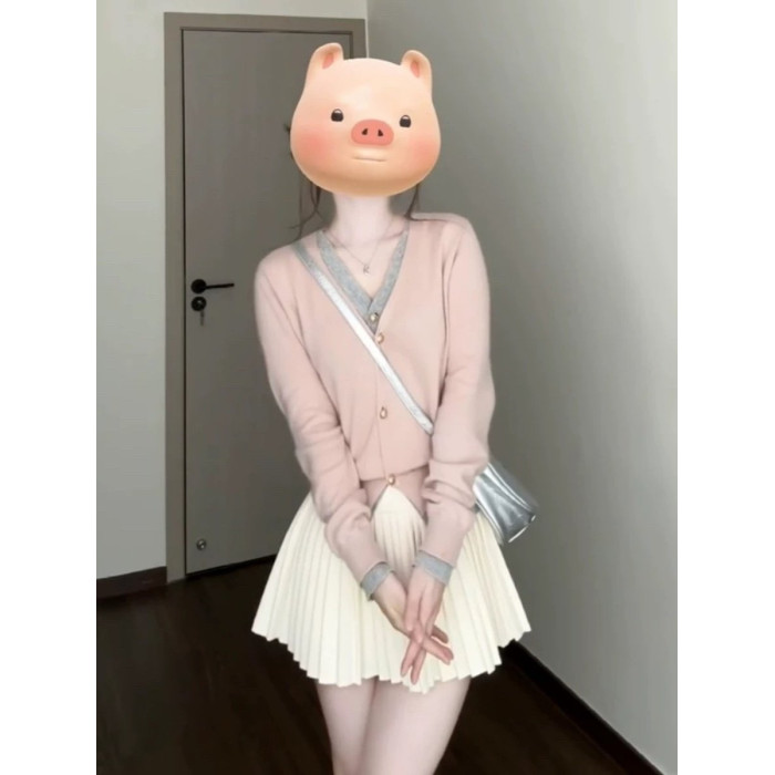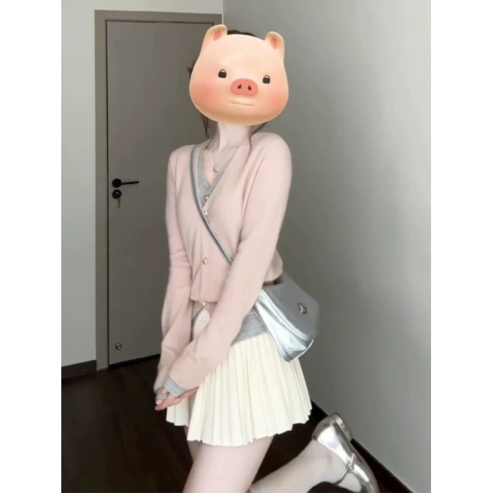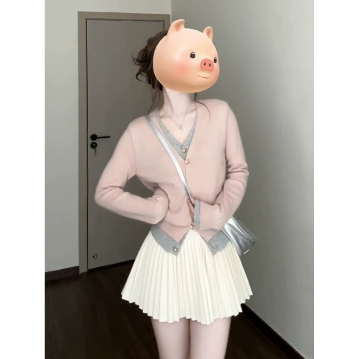 早秋新款韓系穿搭假兩件粉色針織開衫女設計感長袖上衣短款外套潮