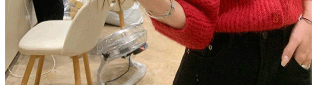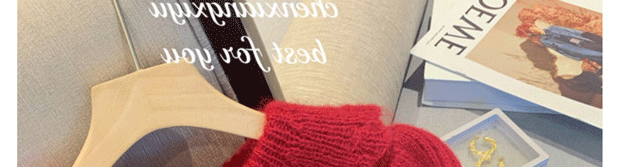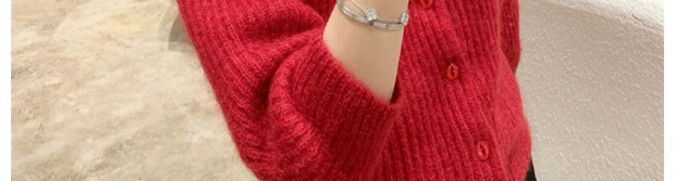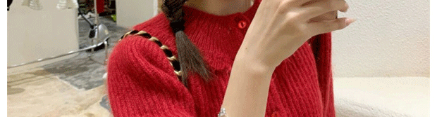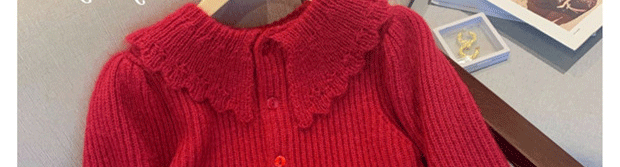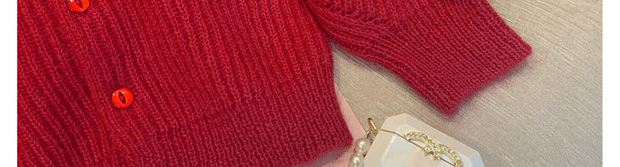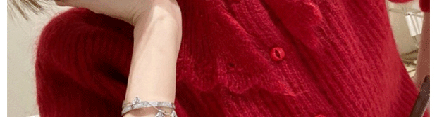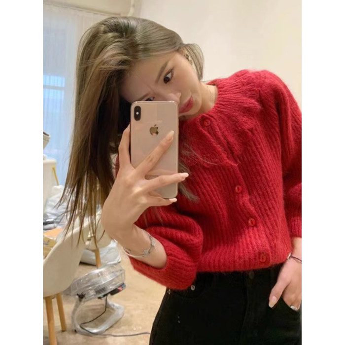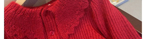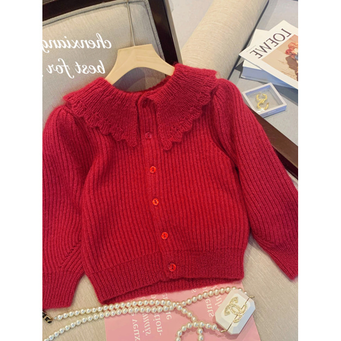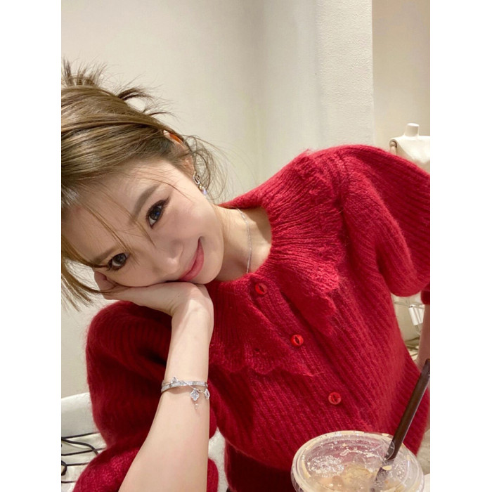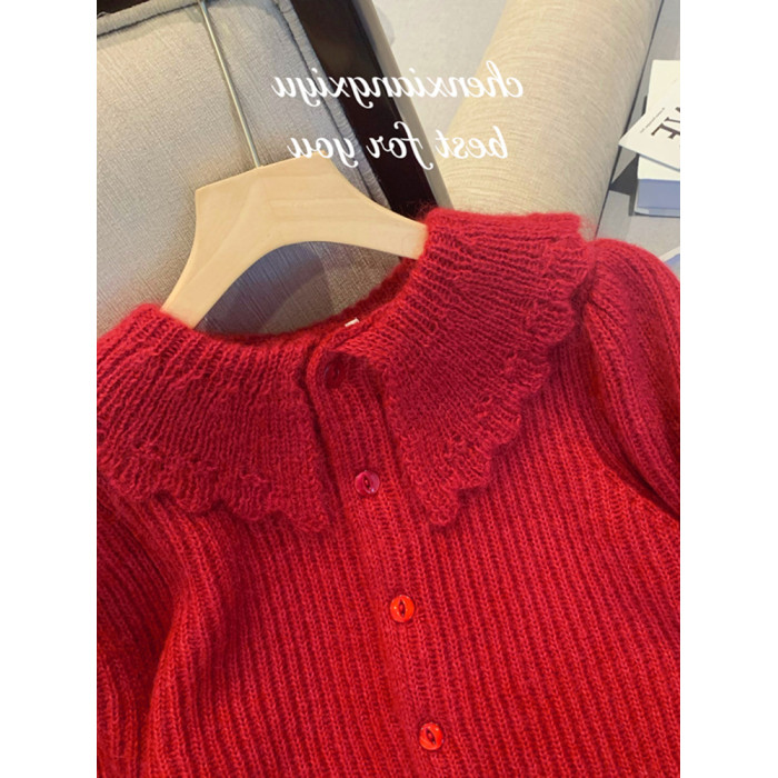 別致漂亮新年紅色娃娃領針織開衫女秋冬高級感馬海毛毛衣外套上衣