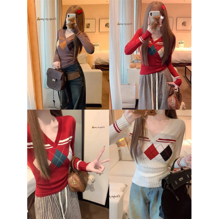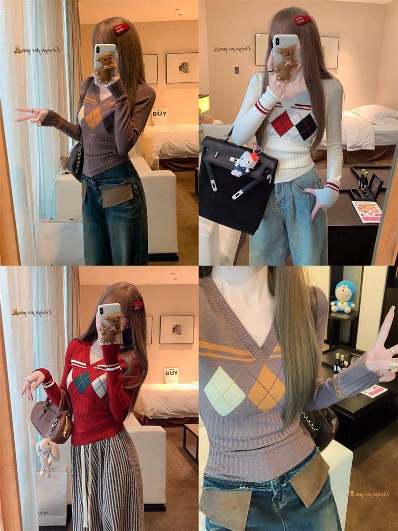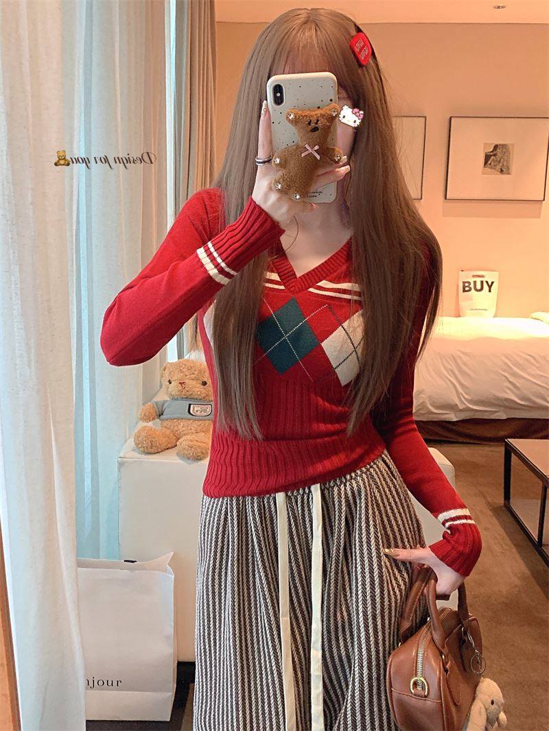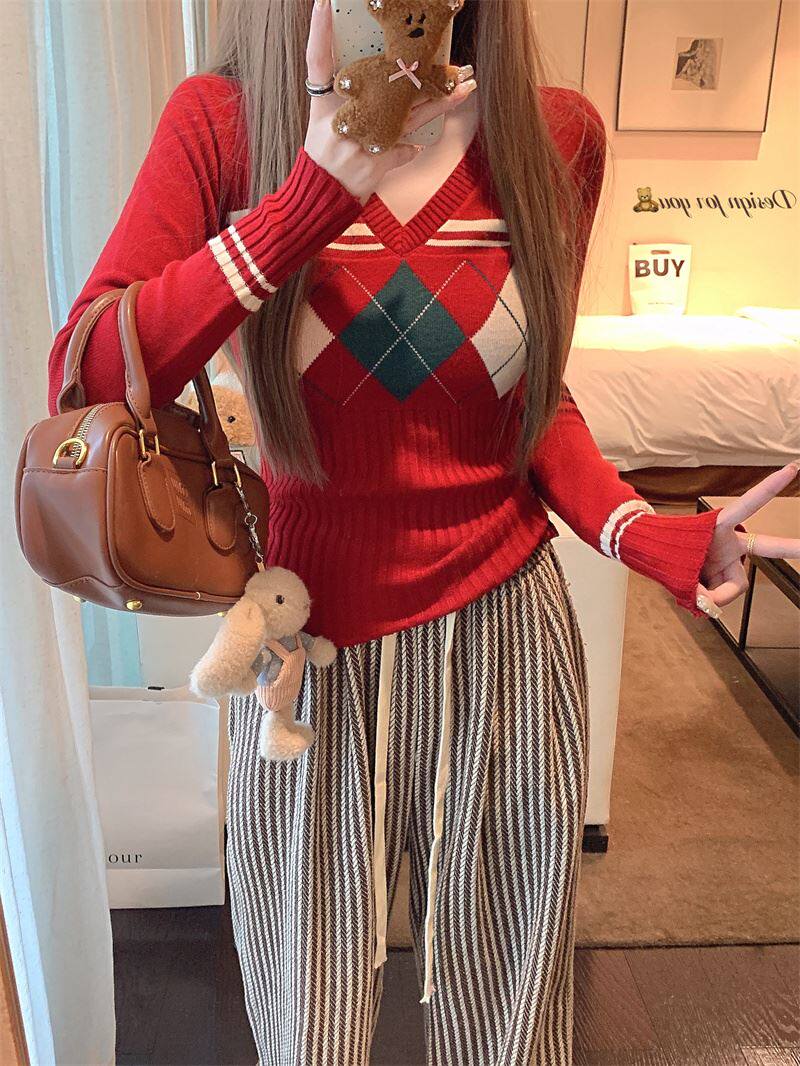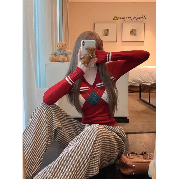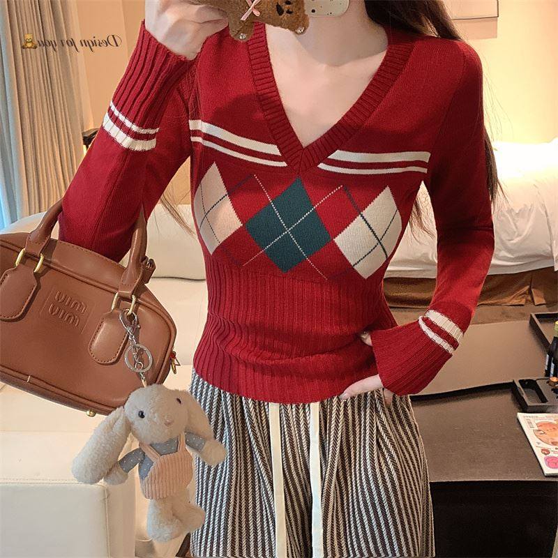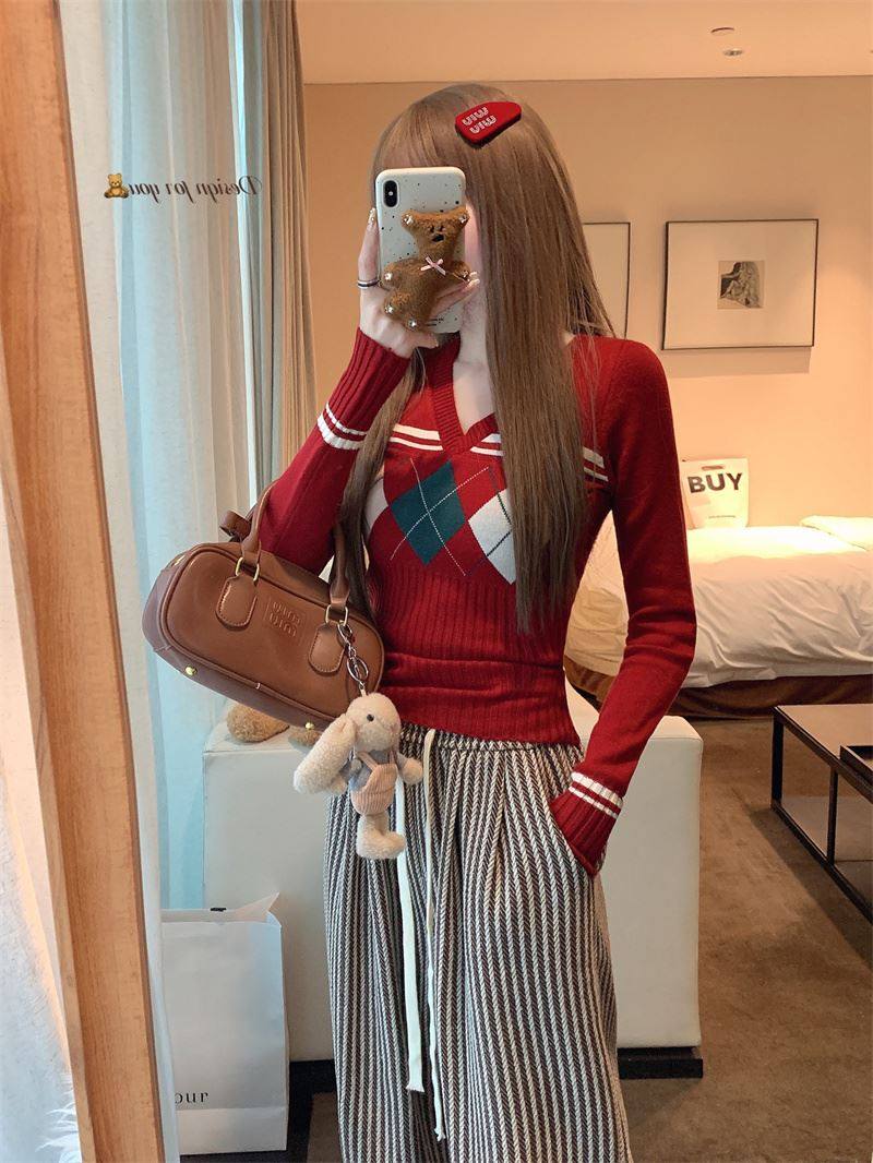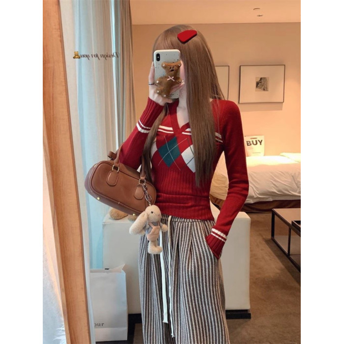 菱格紅色針織打底衫女款秋冬新款韓版修身設計感小衆氣質內搭毛衣