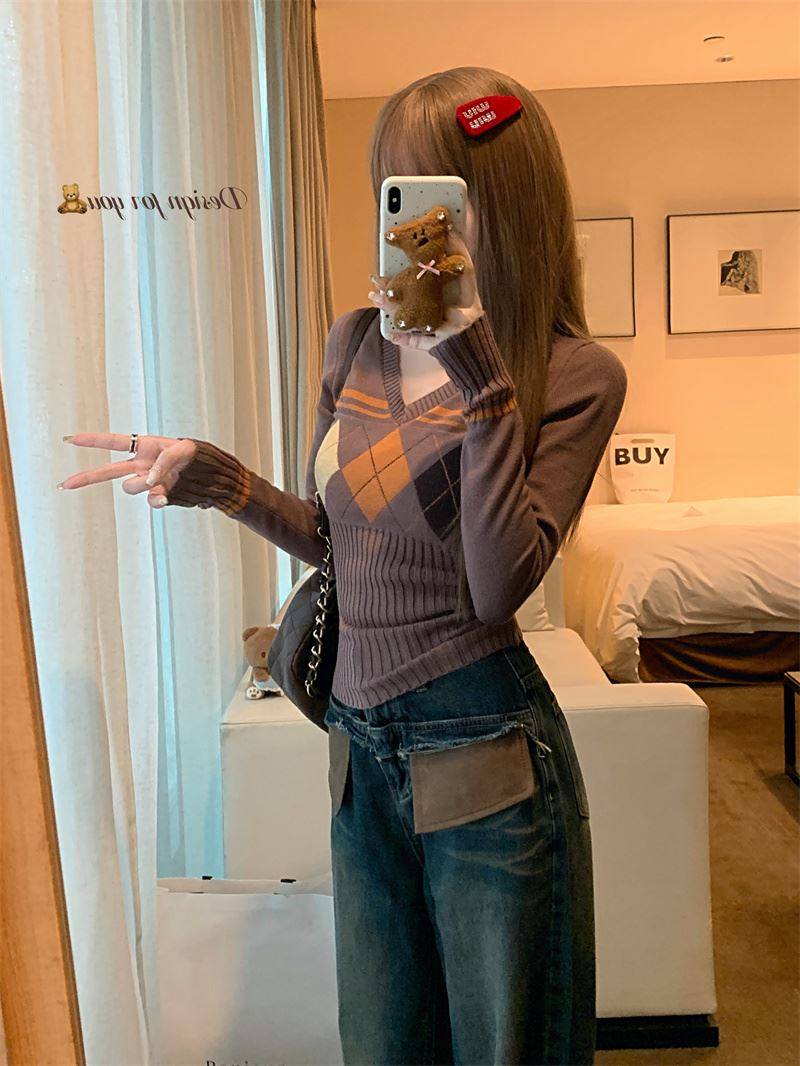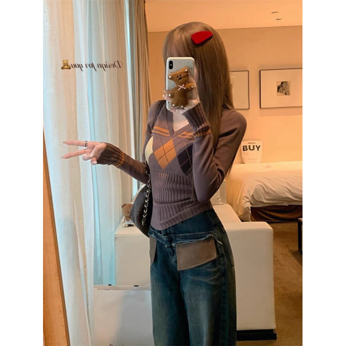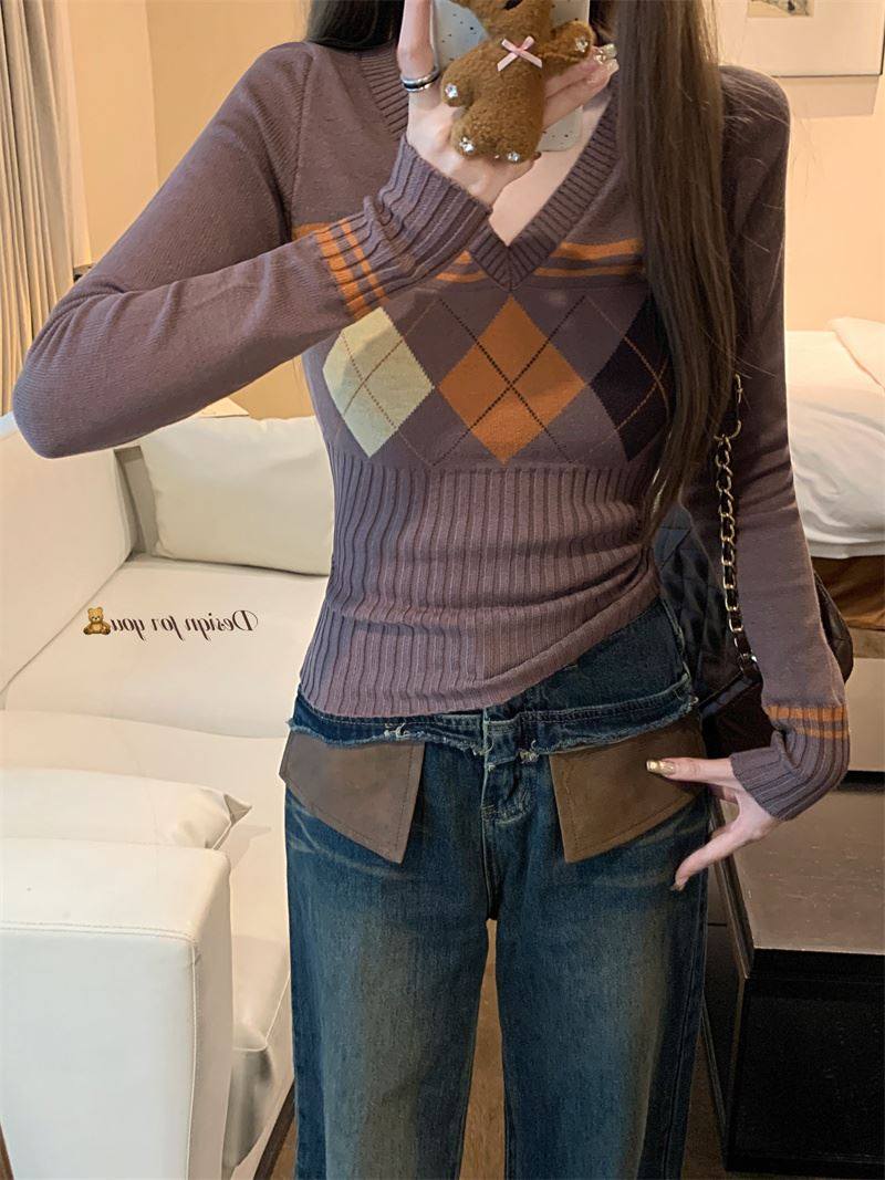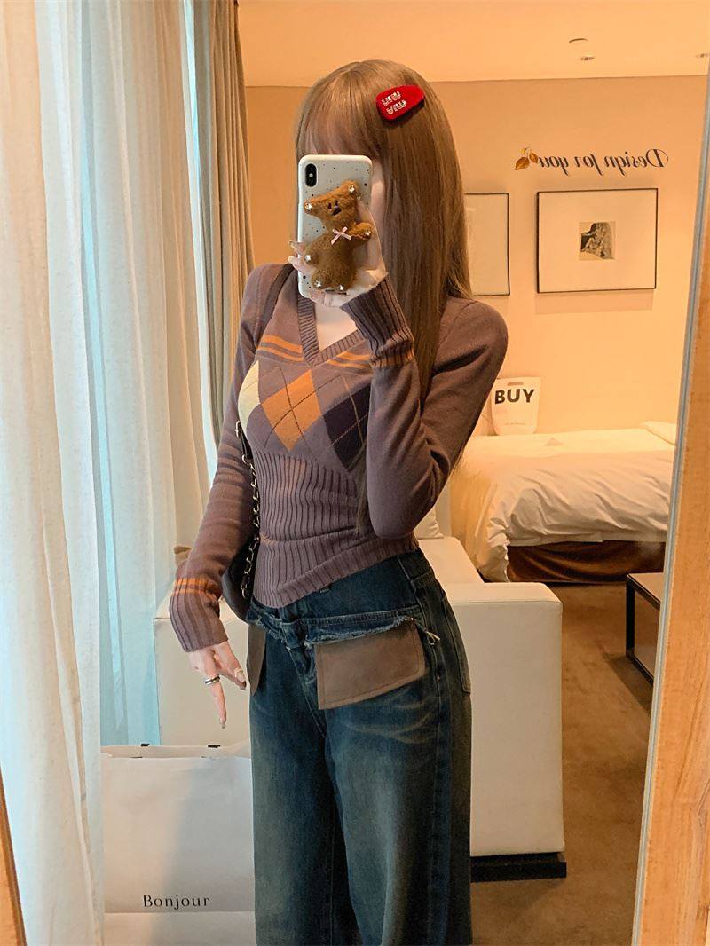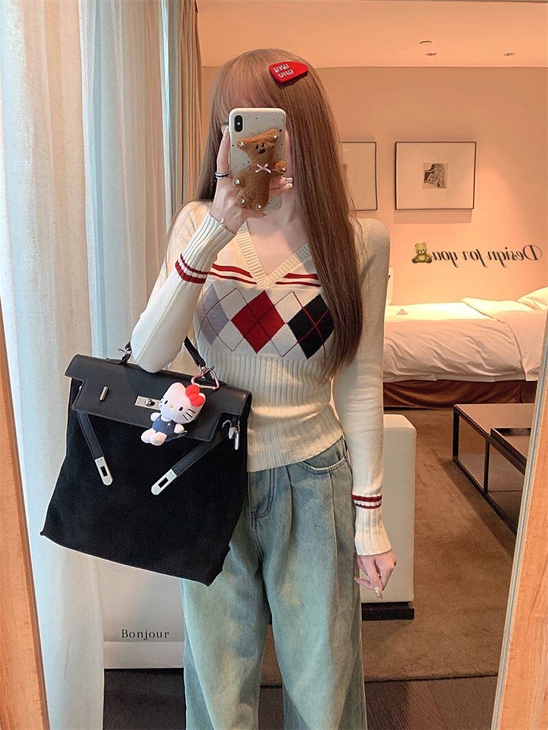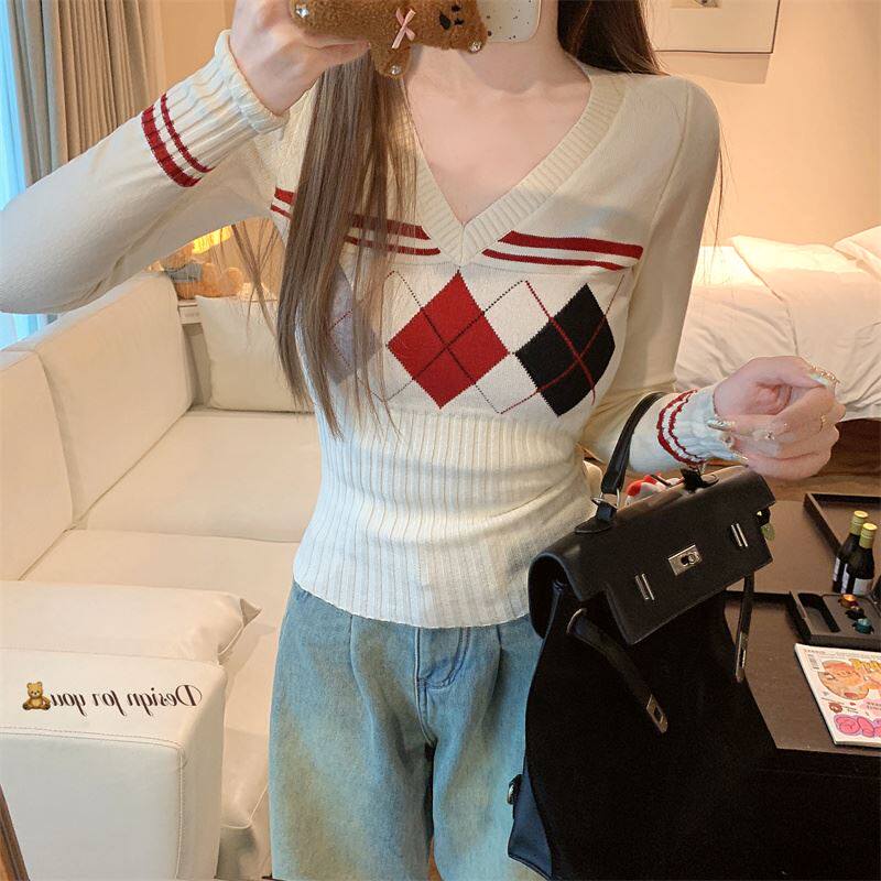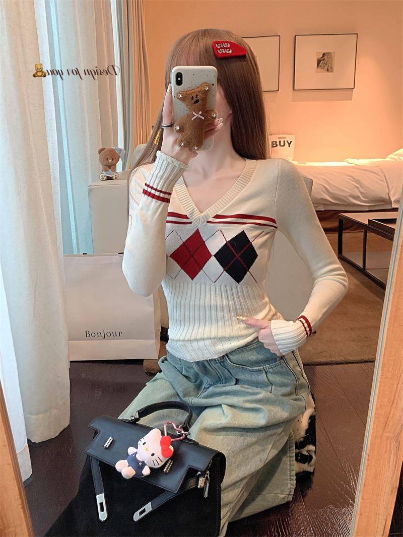 菱格紅色針織打底衫女款秋冬新款韓版修身設計感小衆氣質內搭毛衣