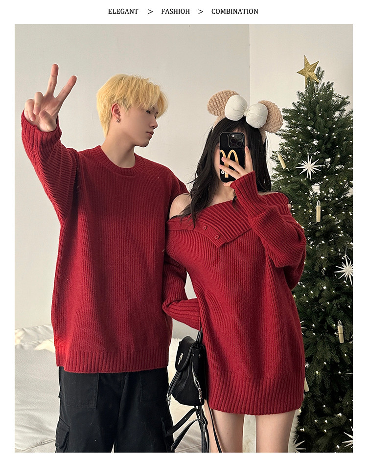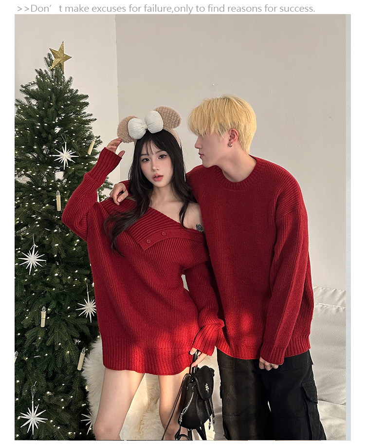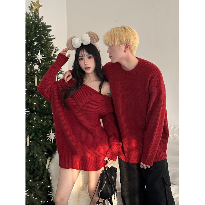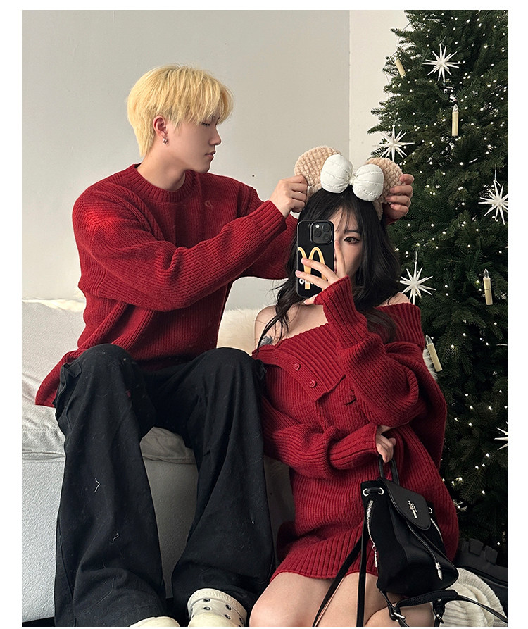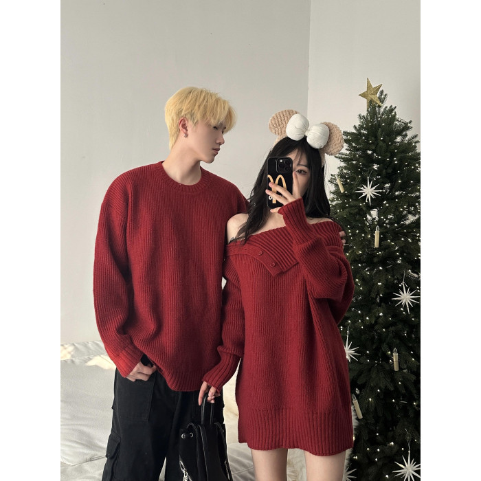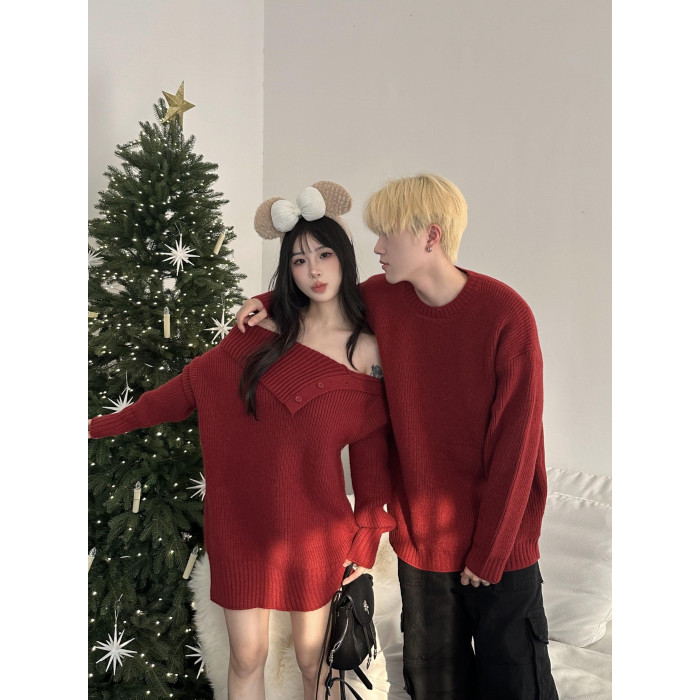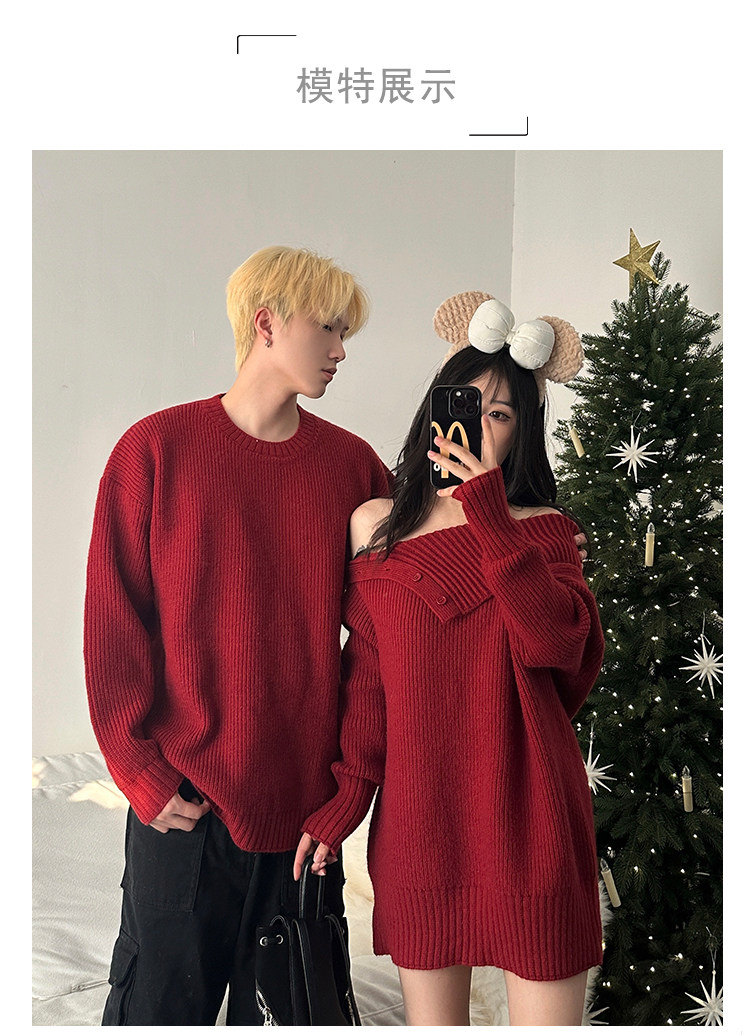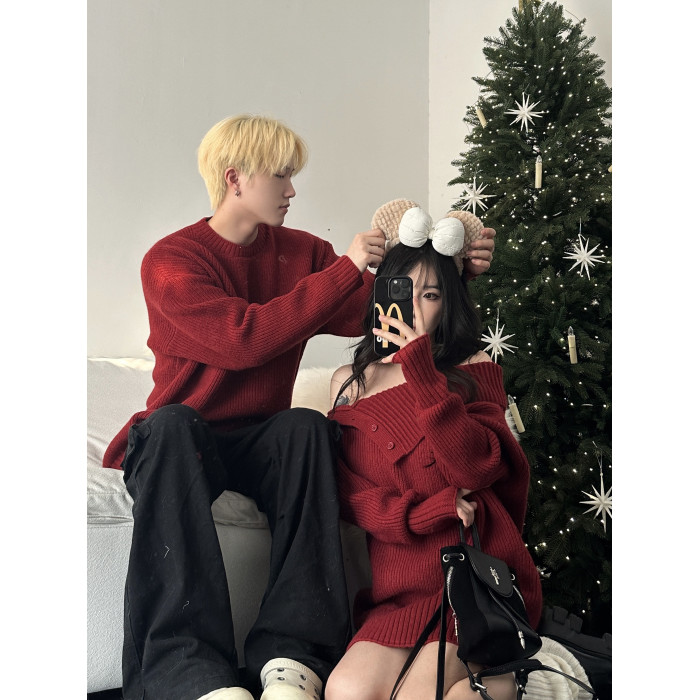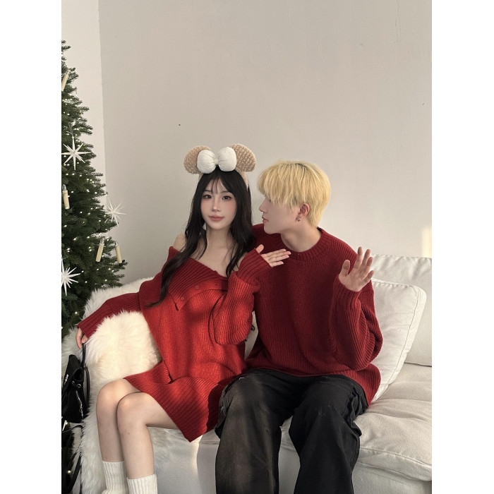 情侶裝秋冬款你衣我裙聖誕新年紅色一字肩中長款針織裙圓領毛衣男