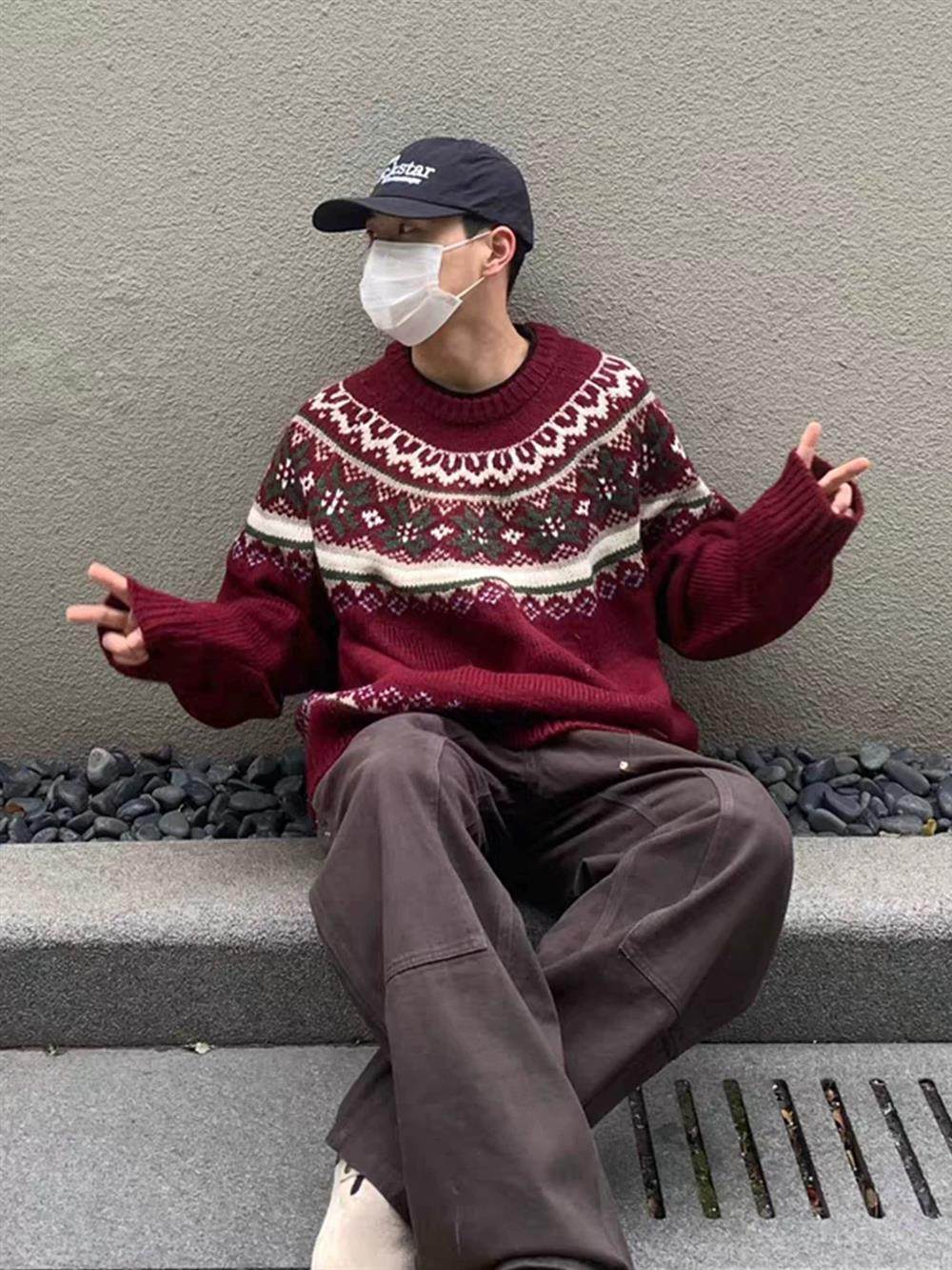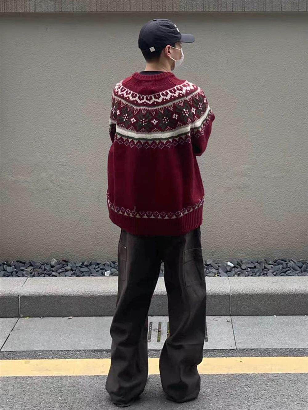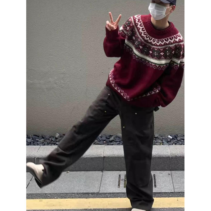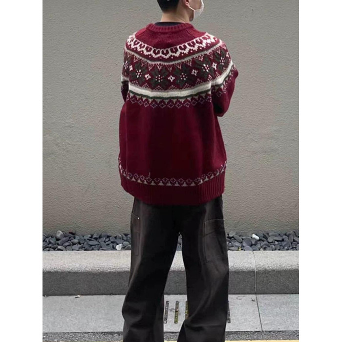 美式慵嬾復古費爾島新年紅色圓領毛衣秋冬男女情侶寬鬆提花針織衫