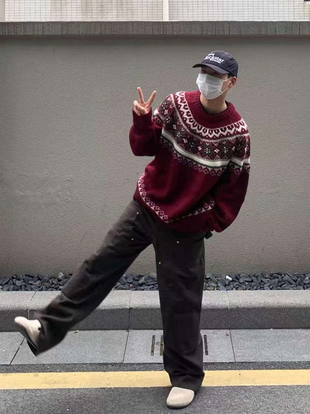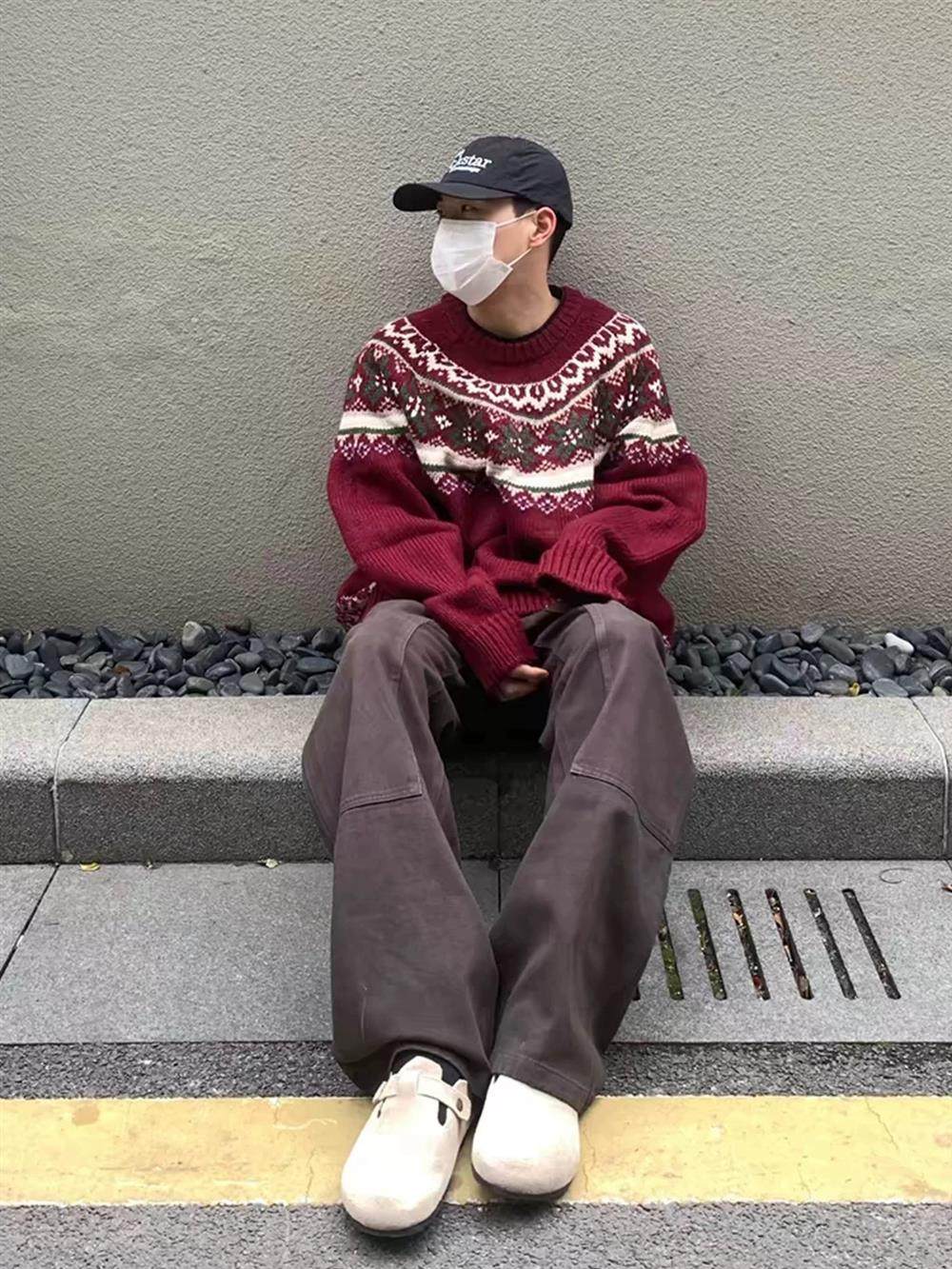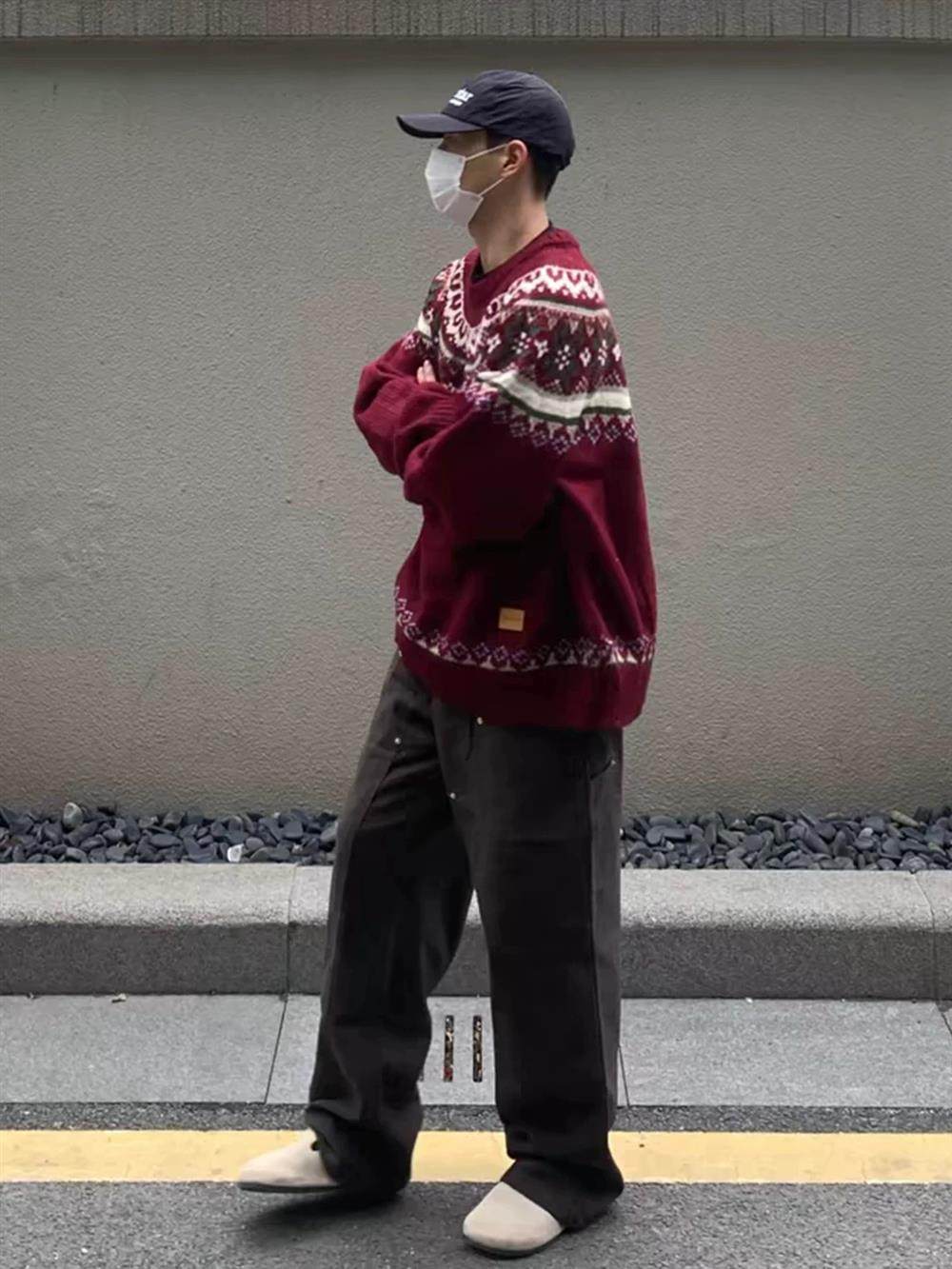 美式慵嬾復古費爾島新年紅色圓領毛衣秋冬男女情侶寬鬆提花針織衫