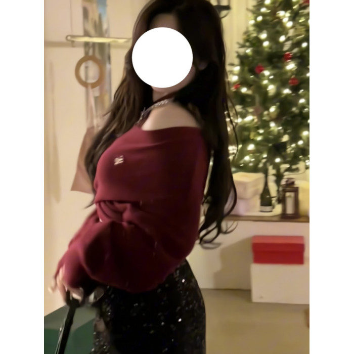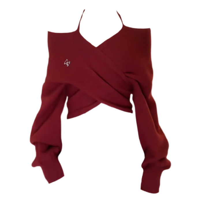 大碼胖妹妹新年紅復古一字肩掛脖針織衫女秋冬交叉設計甜辣妹上衣