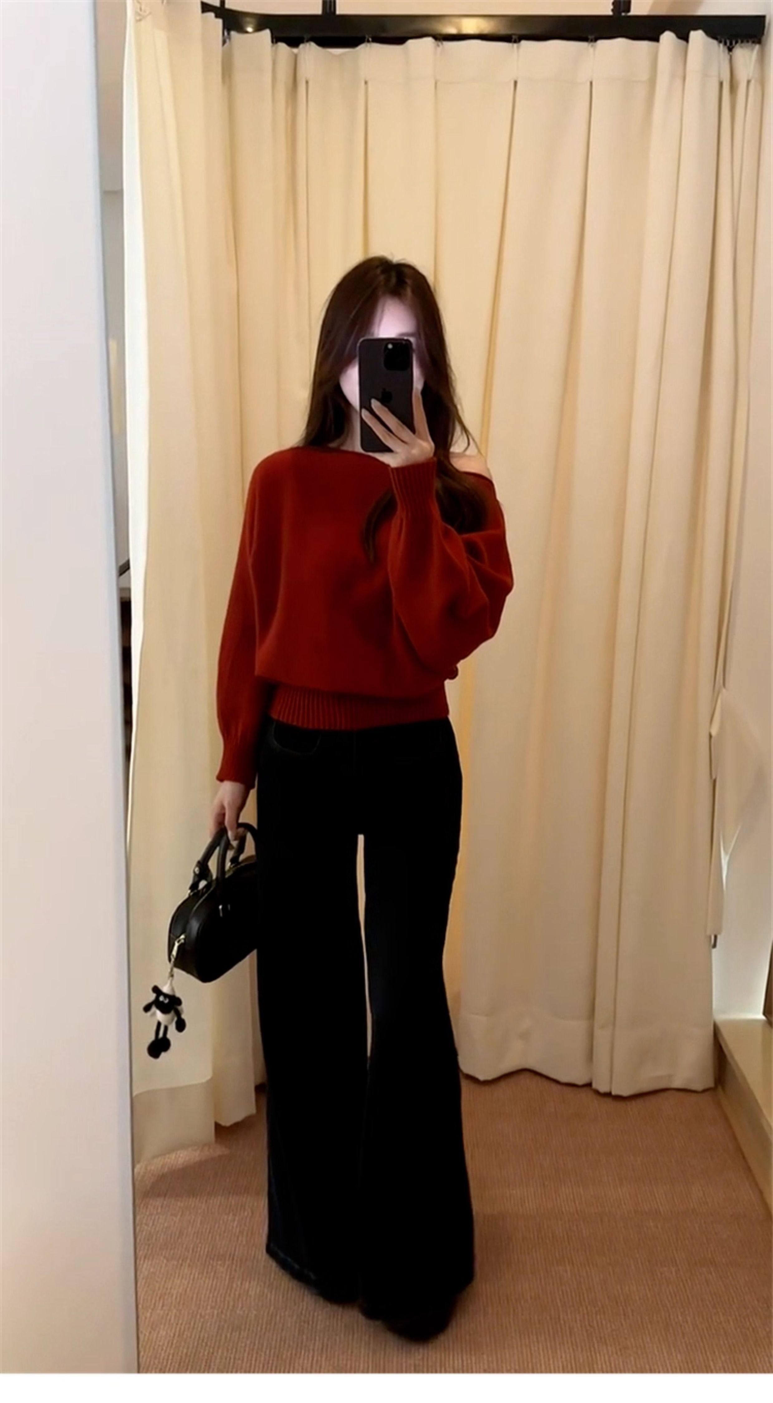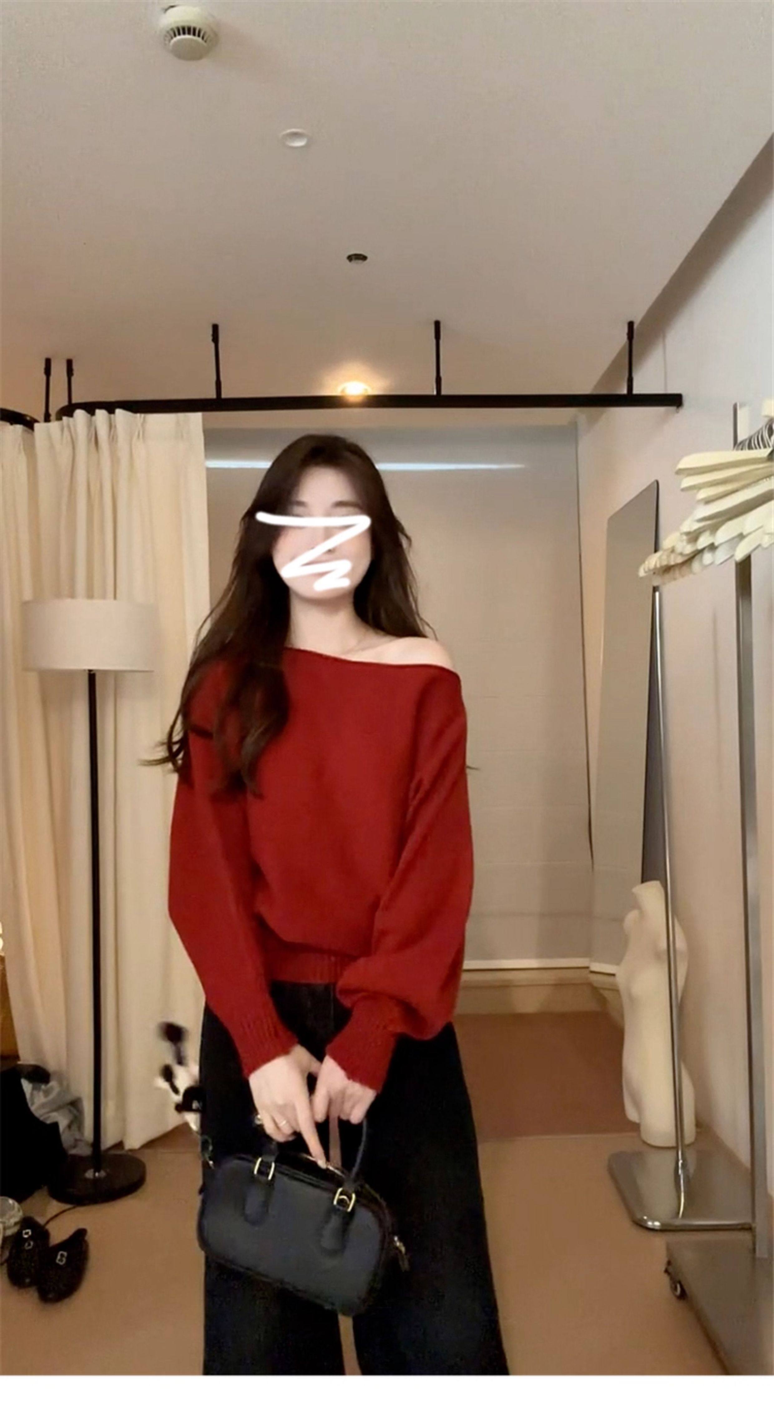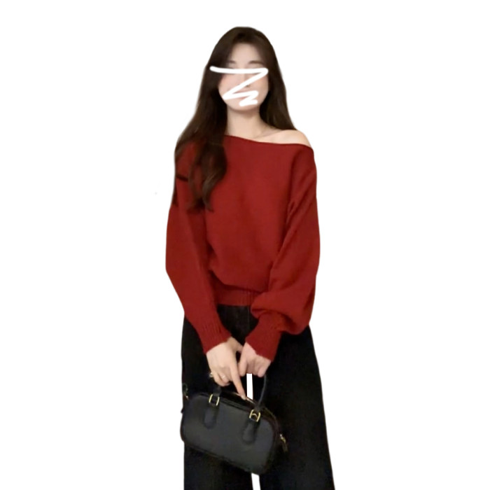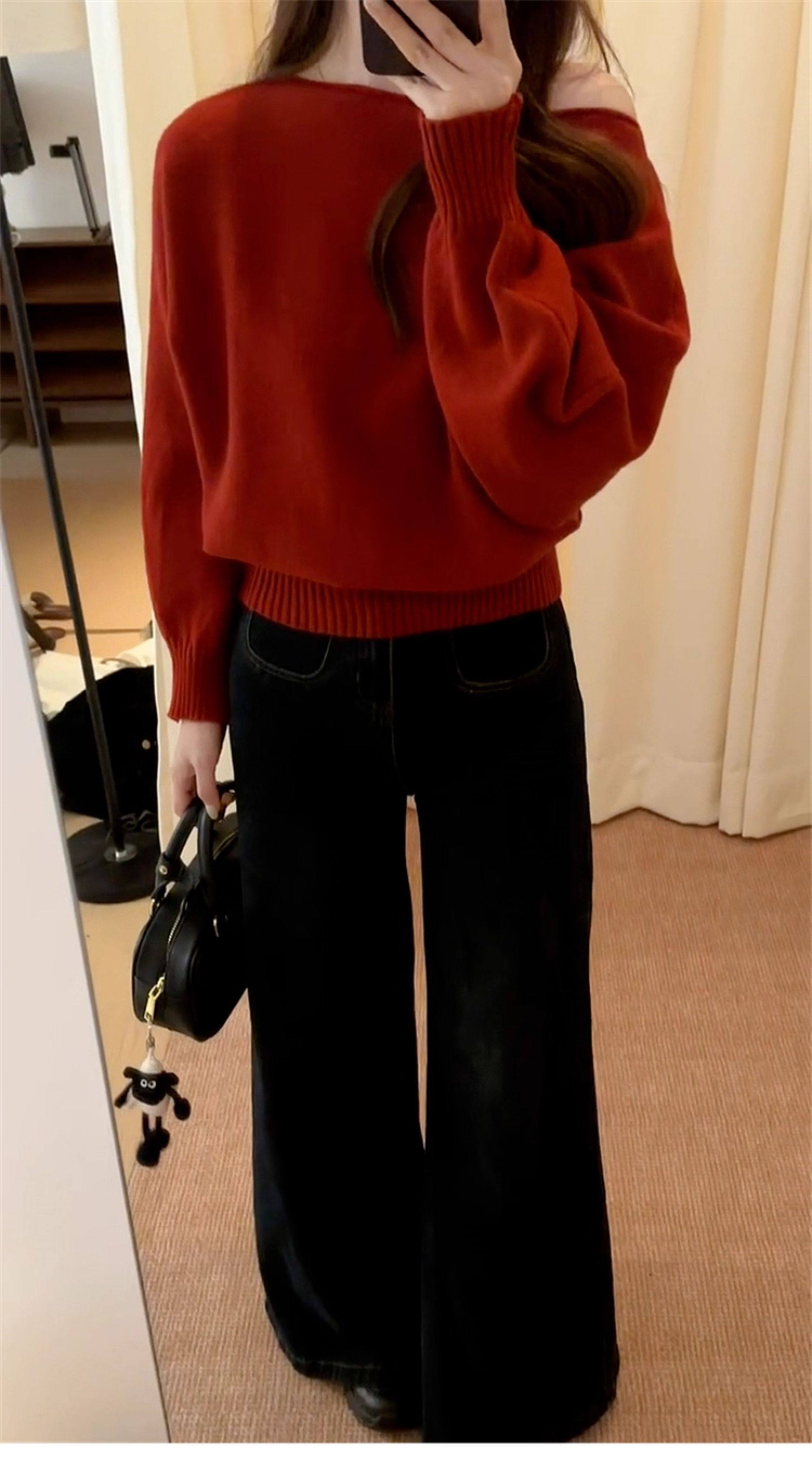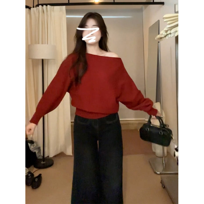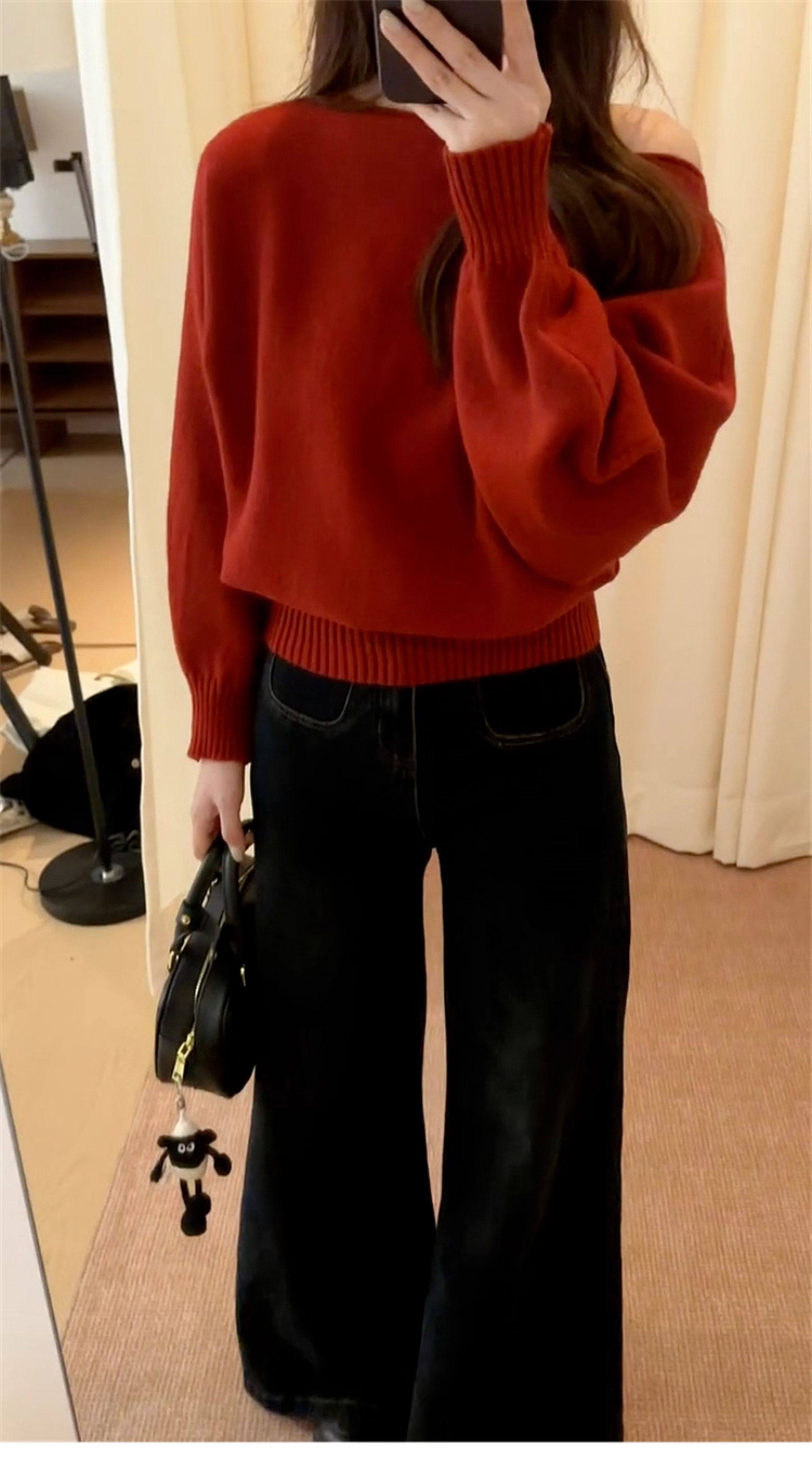 一字肩紅色針織毛衣女2026新款韓系穿搭獨特超好看秋冬季露肩上衣