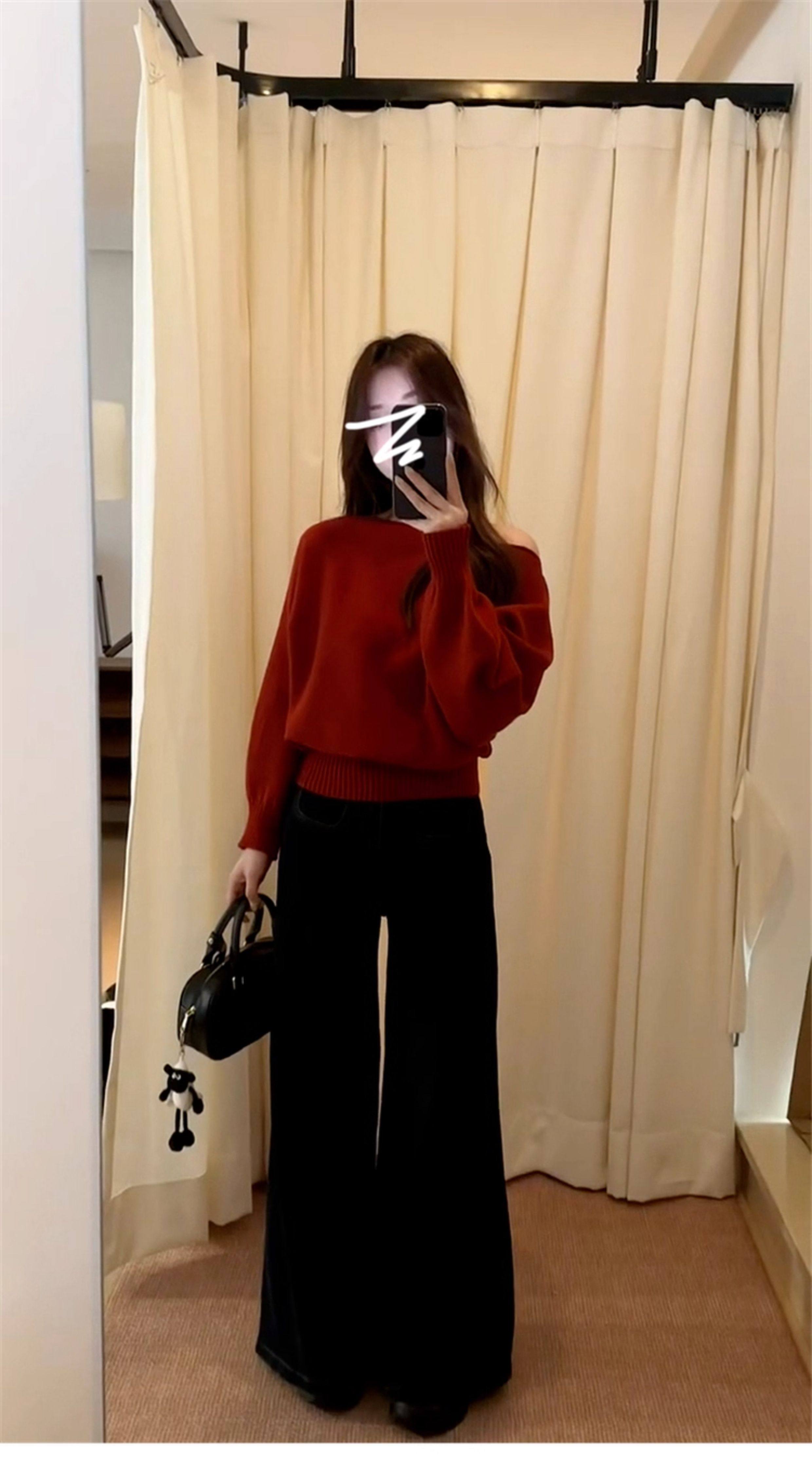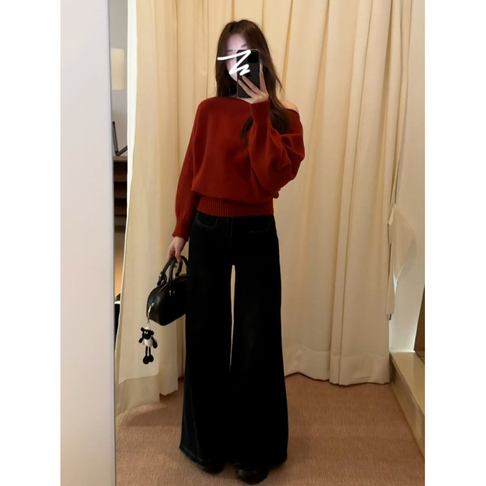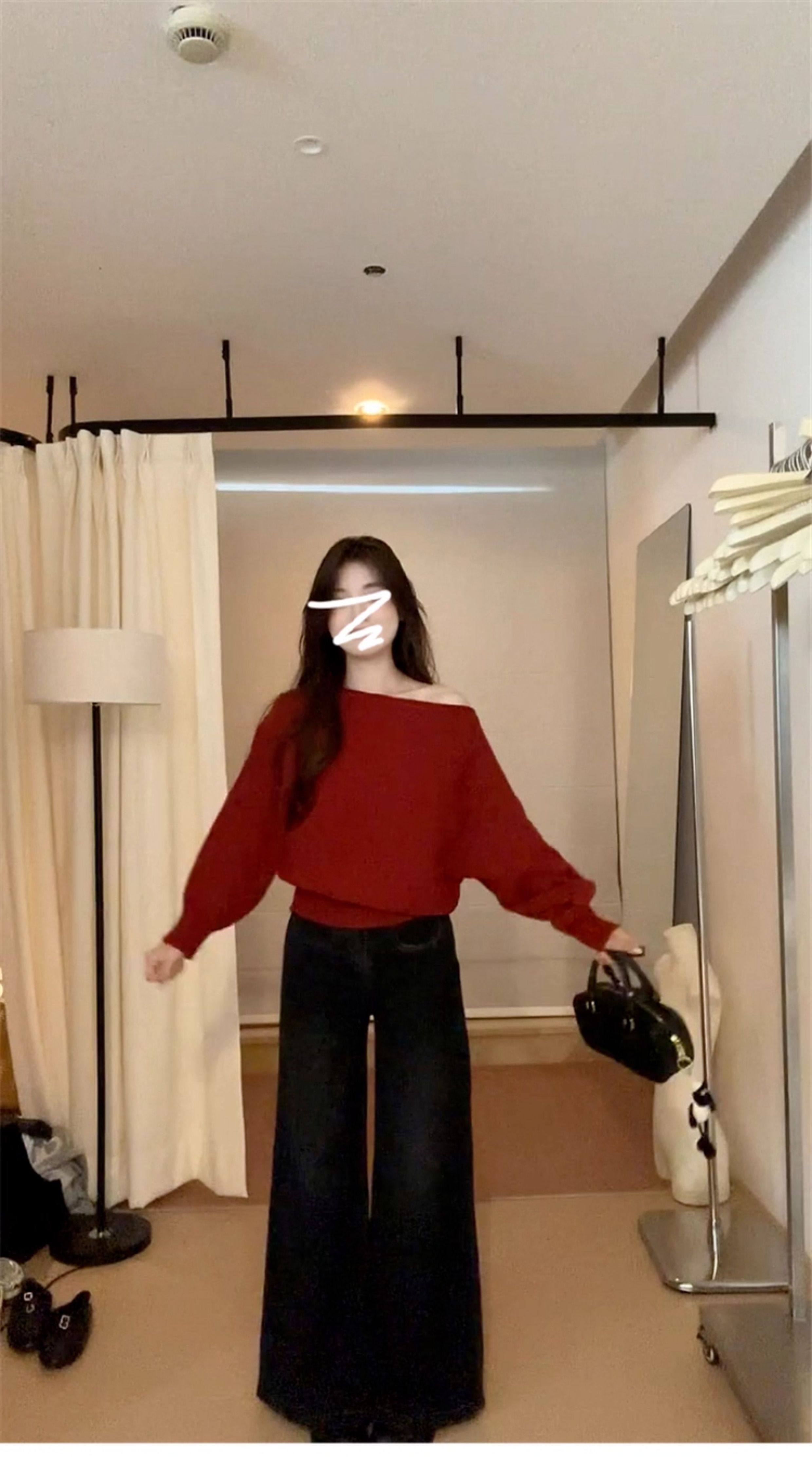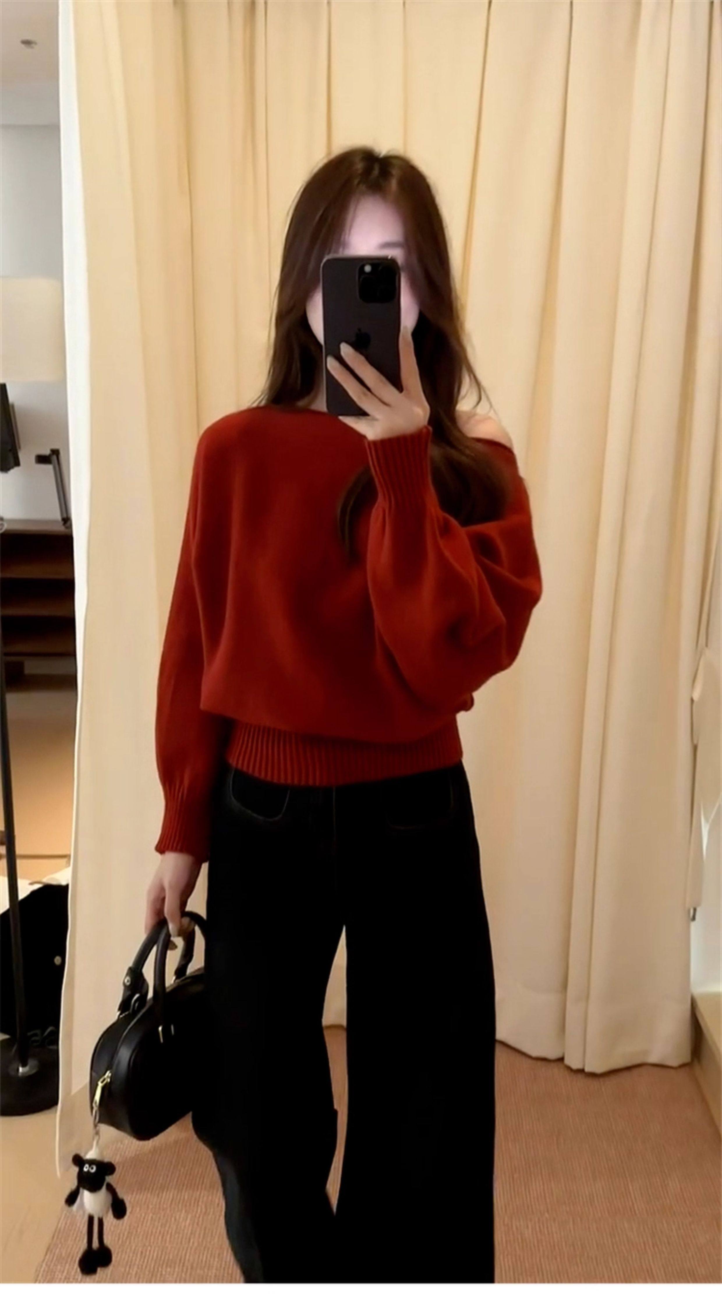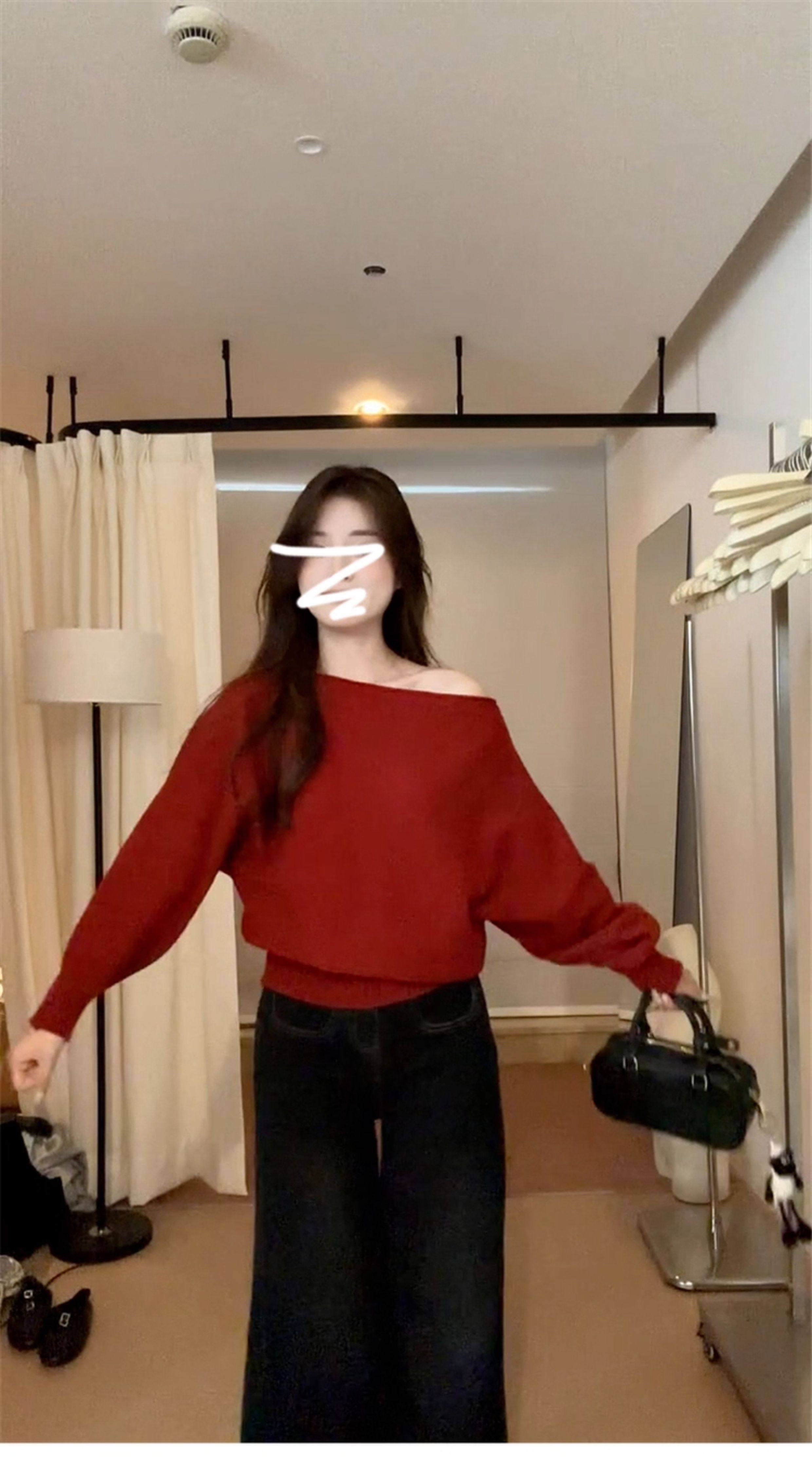 一字肩紅色針織毛衣女2026新款韓系穿搭獨特超好看秋冬季露肩上衣