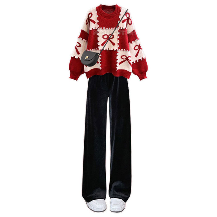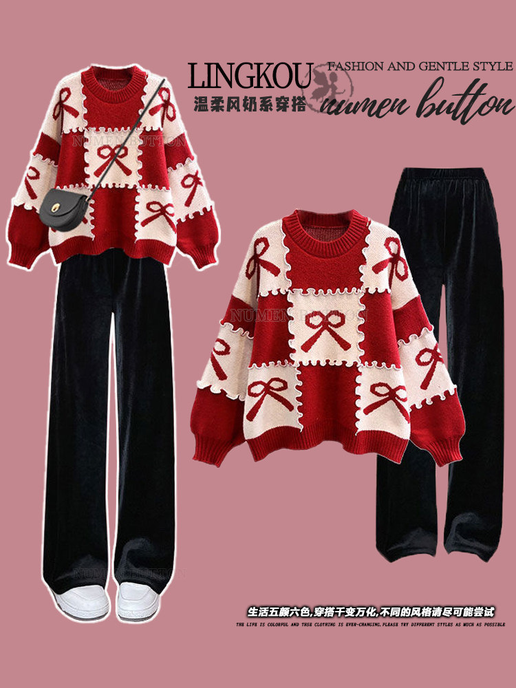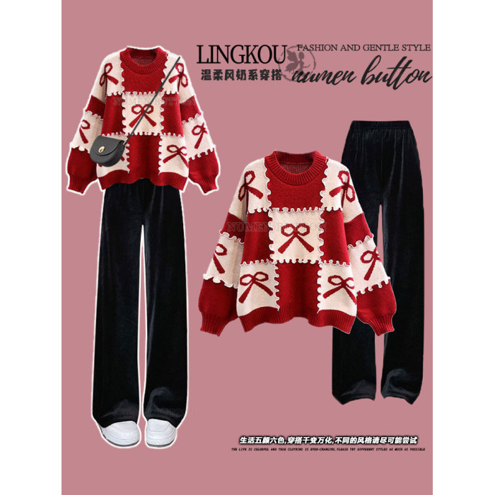 大碼女秋冬時尚套裝胖mm顯瘦遮肉聖誕節新年紅色毛衣濶腿褲兩件套