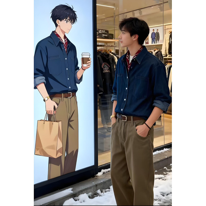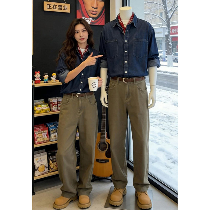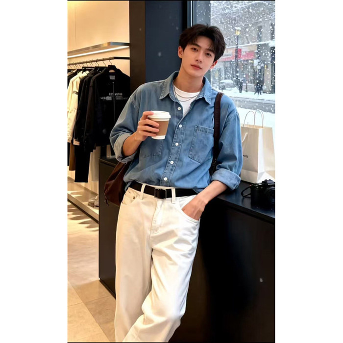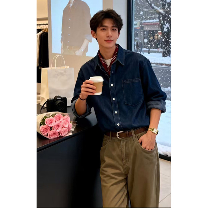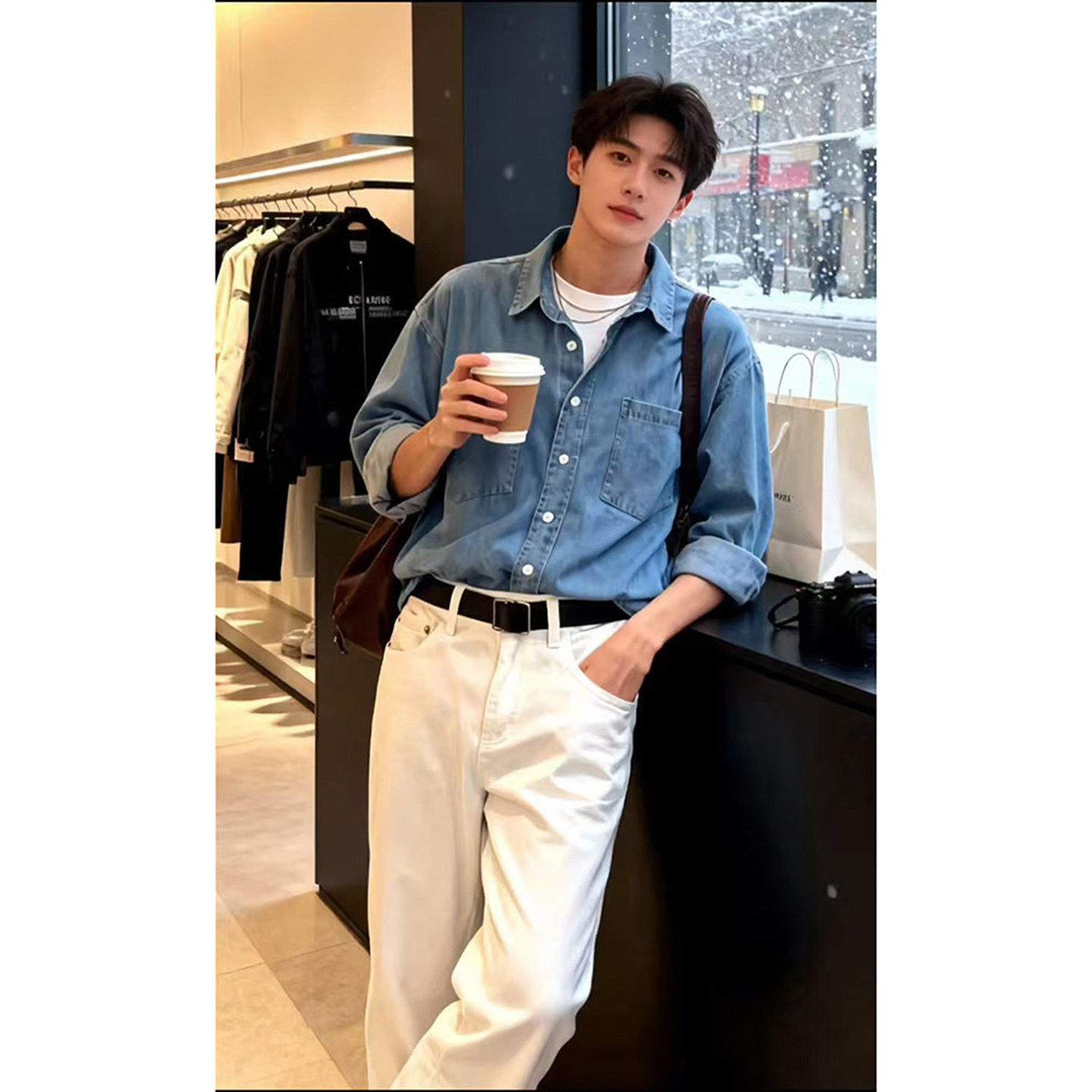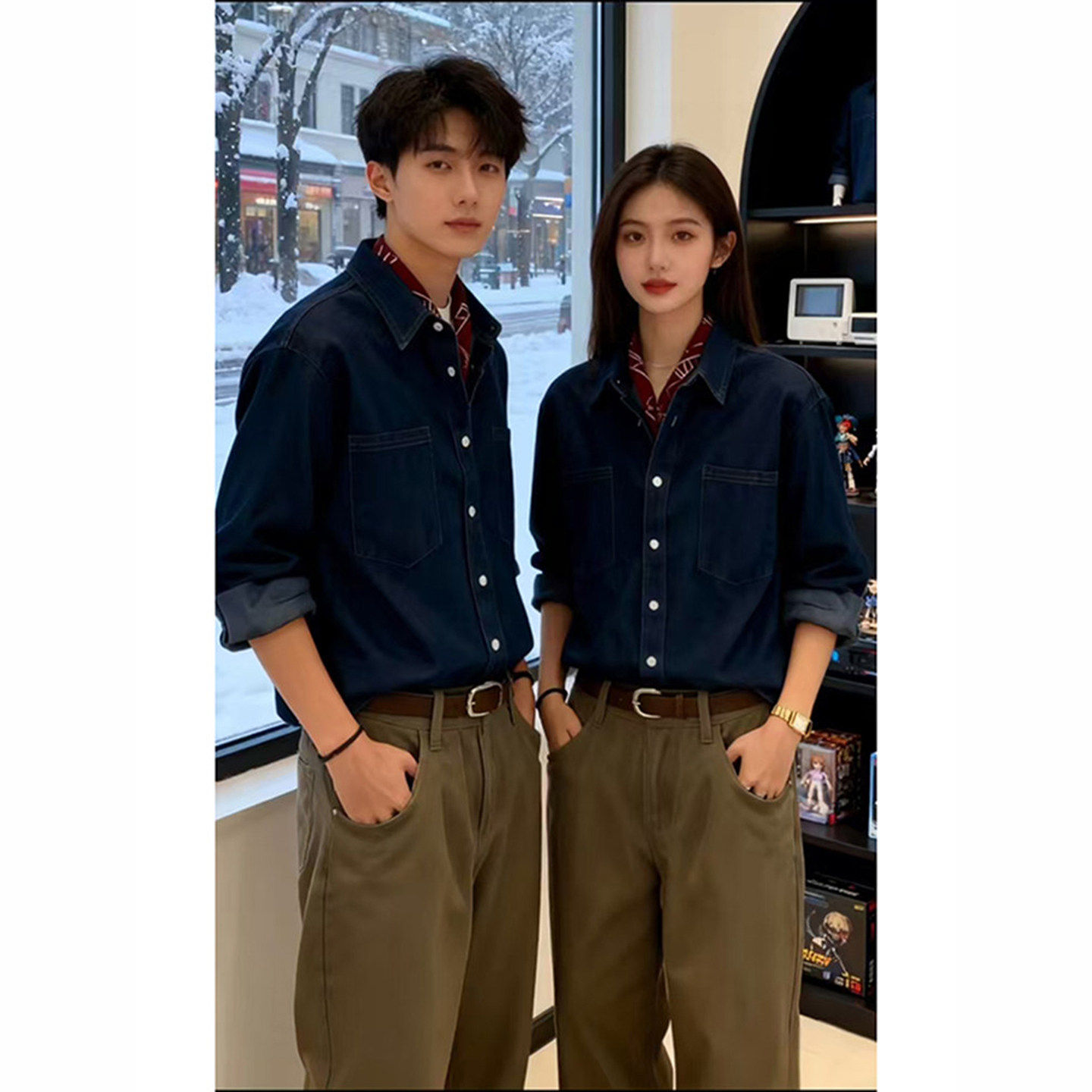 韓系深藍色牛仔襯衫男春秋高級感痞帥長袖襯衣慵懶松弛感曡穿外套