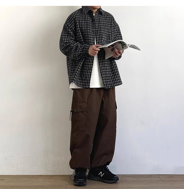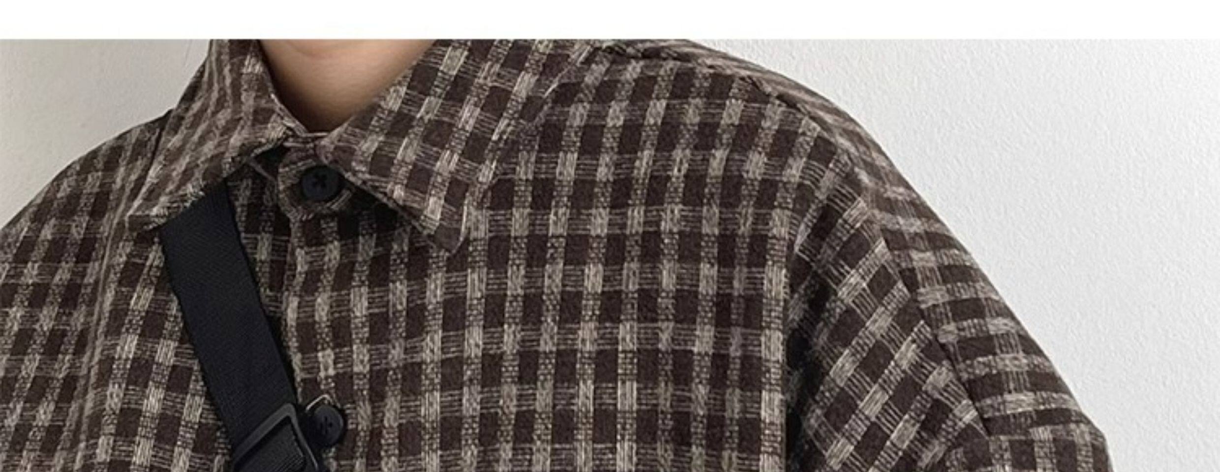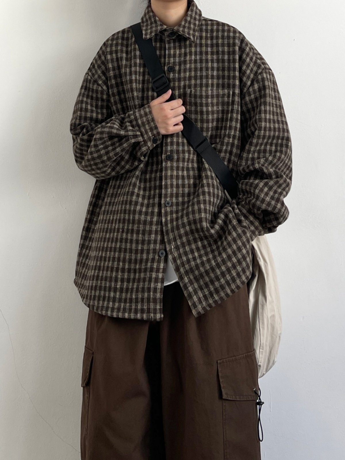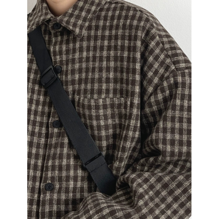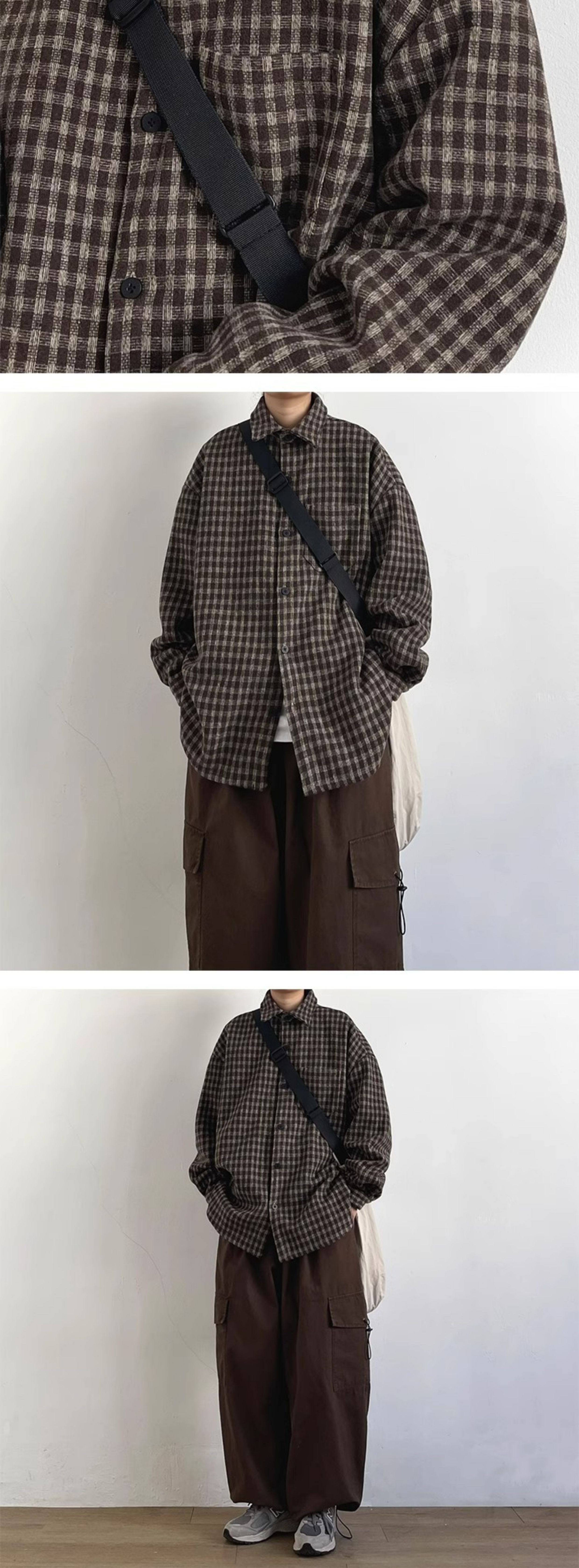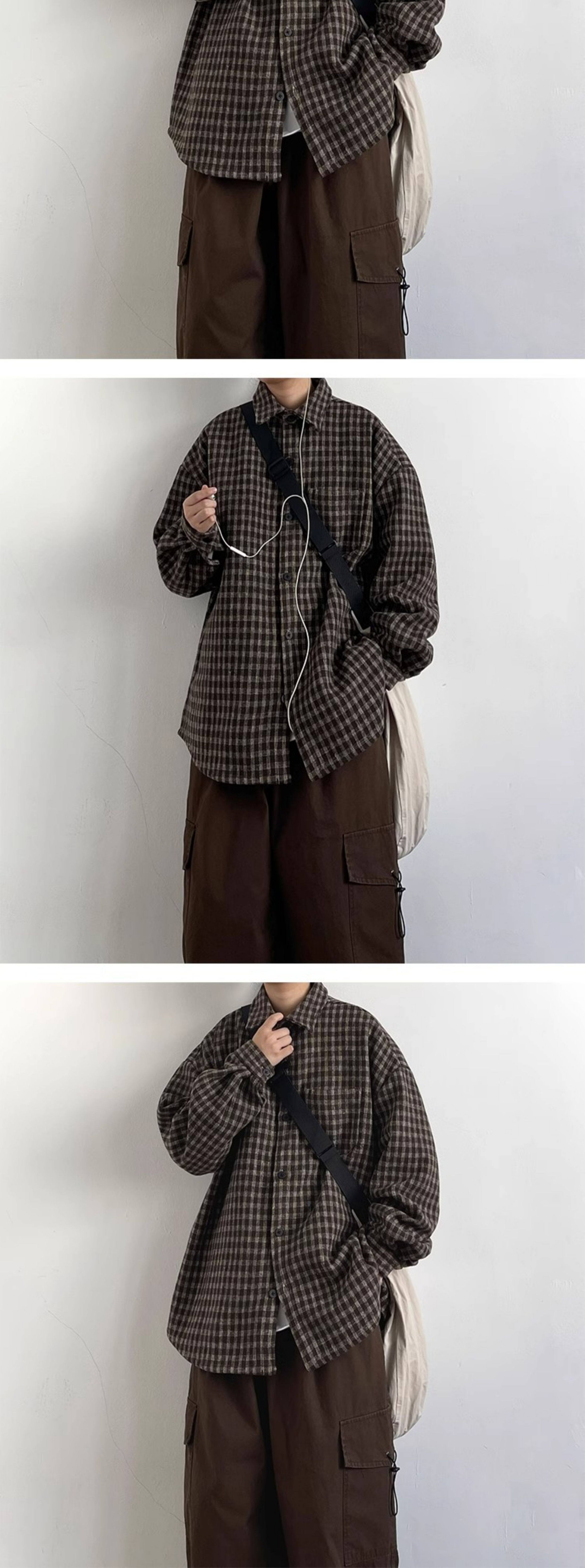 日系復古學院風細格子襯衫男女春秋cityboy寬鬆休閒工裝襯衣外套