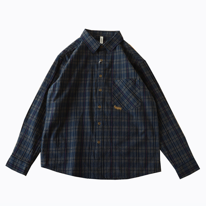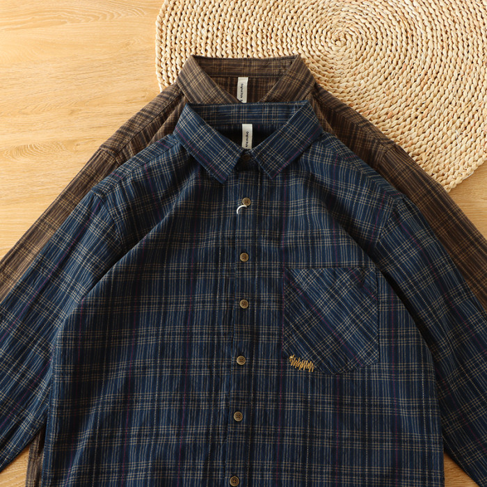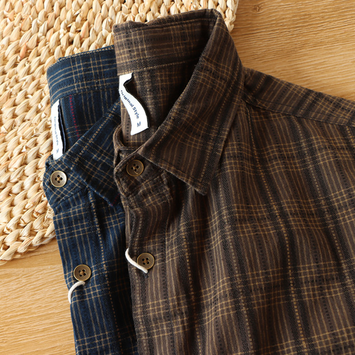 復古時尚感覺好日系格子襯衫男裝潮流拼色全棉長袖襯衣小外套