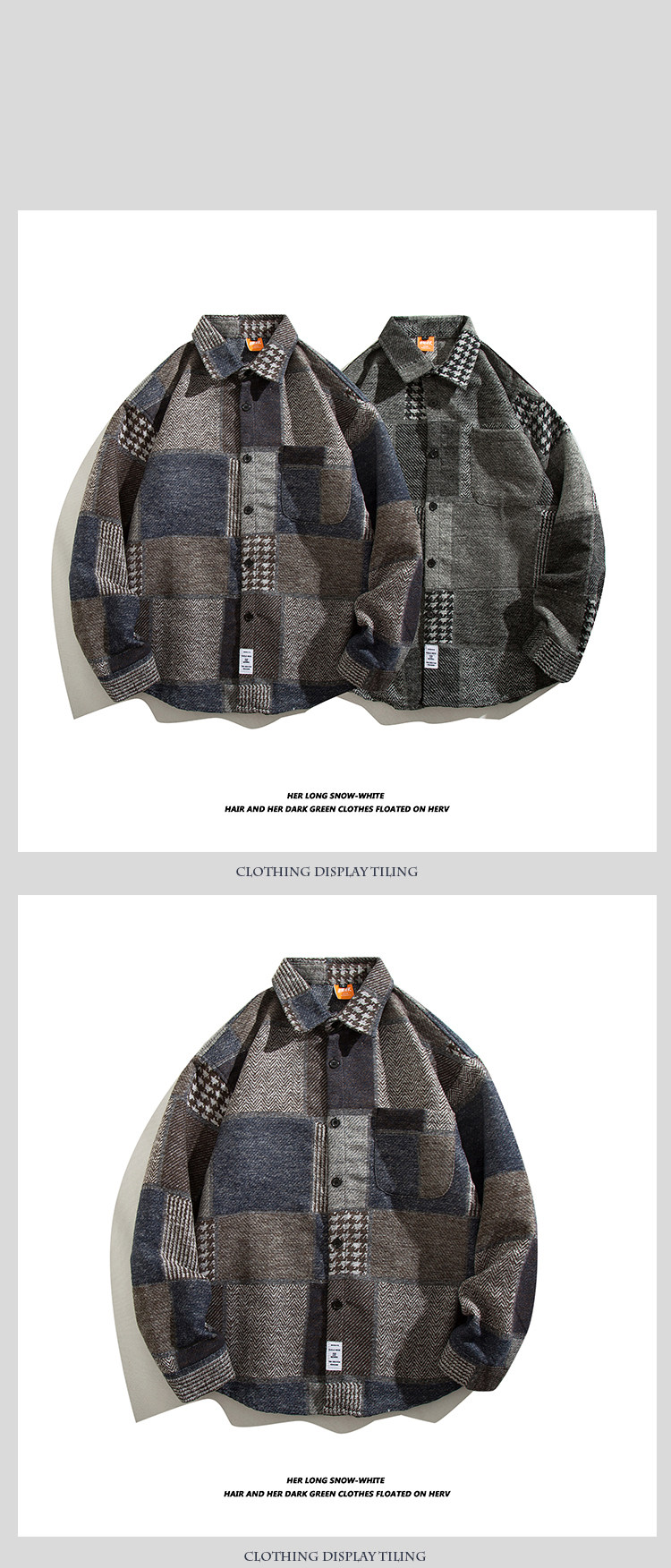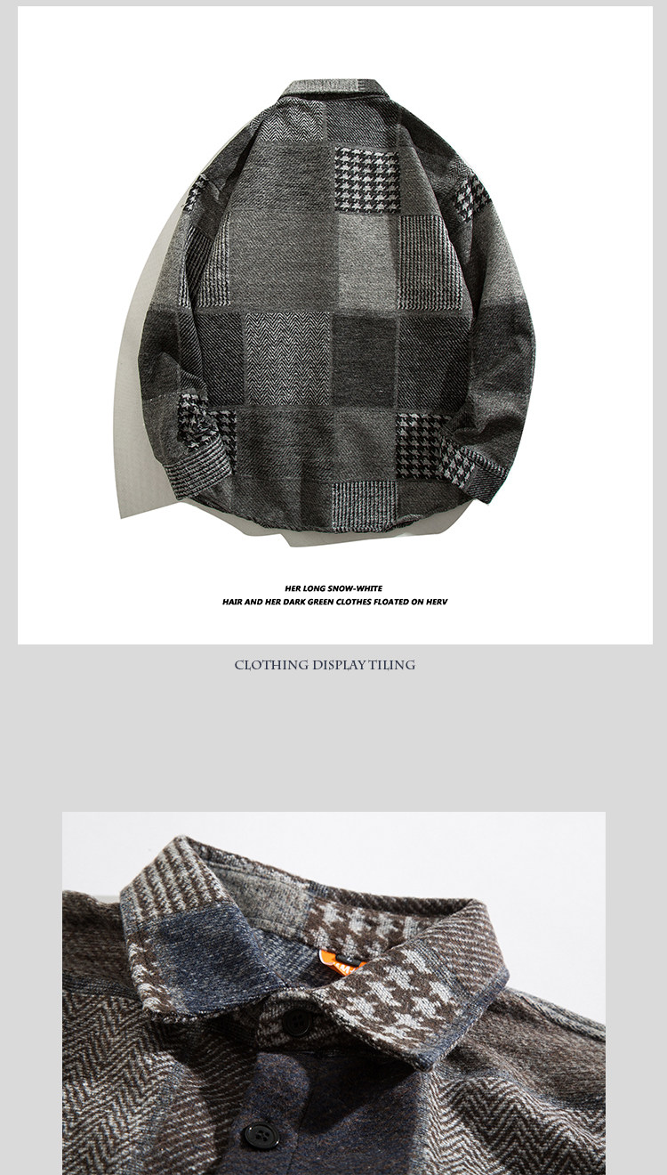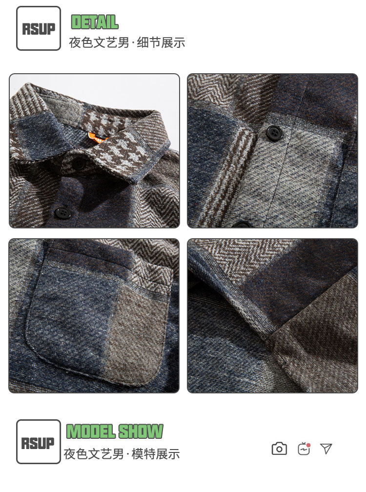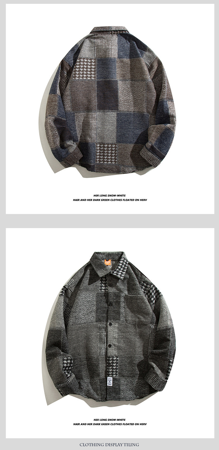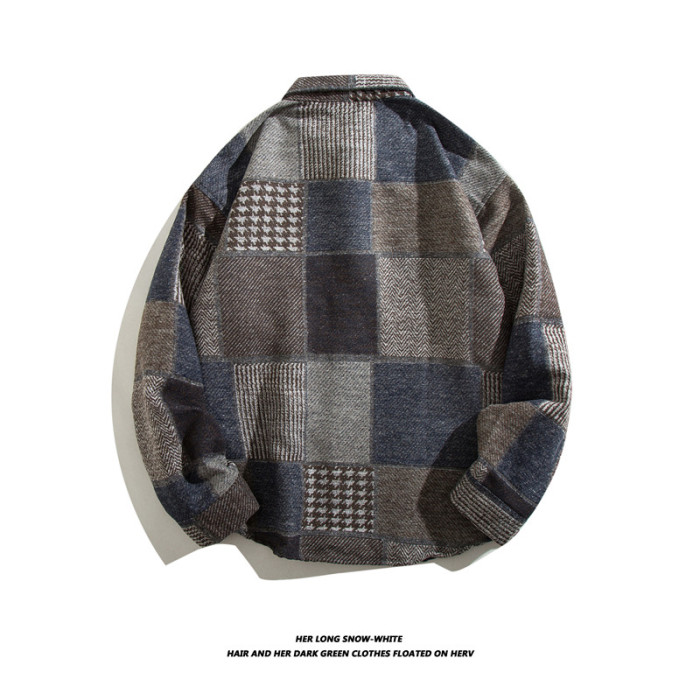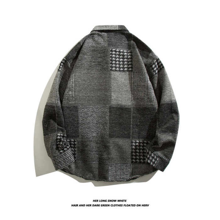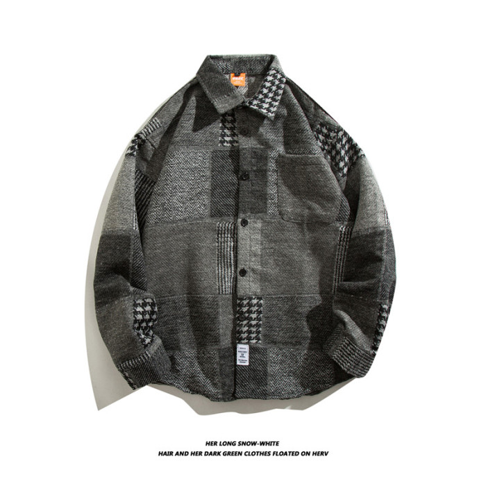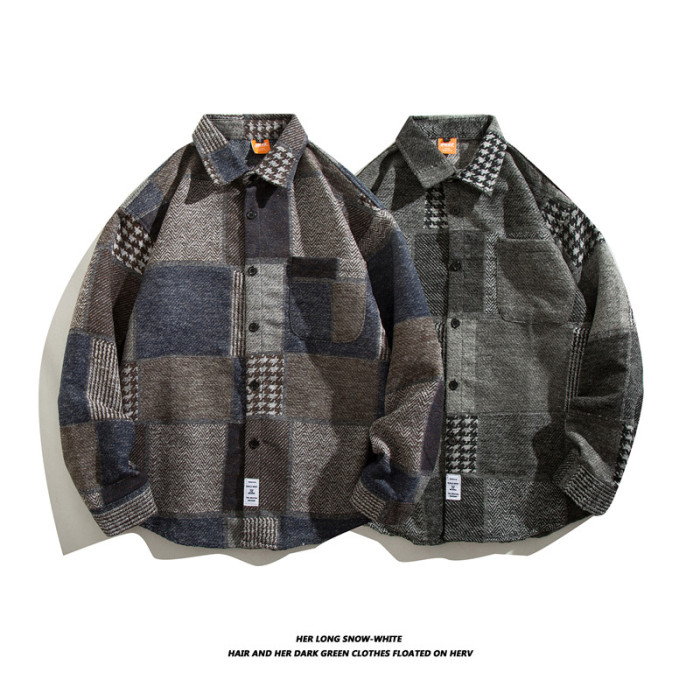 日系復古拼接格子襯衫男士長袖休閒百搭毛呢襯衣外穿痞帥ins潮流