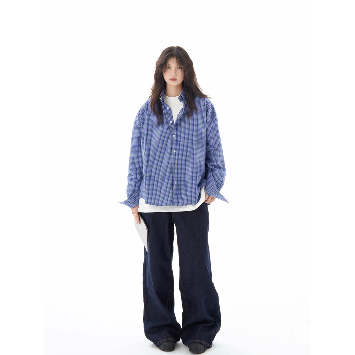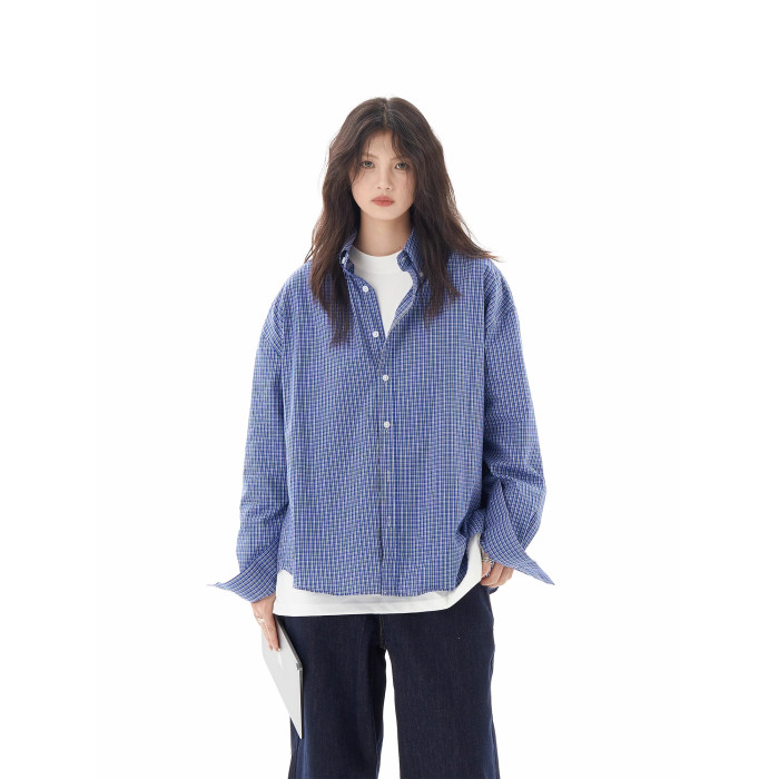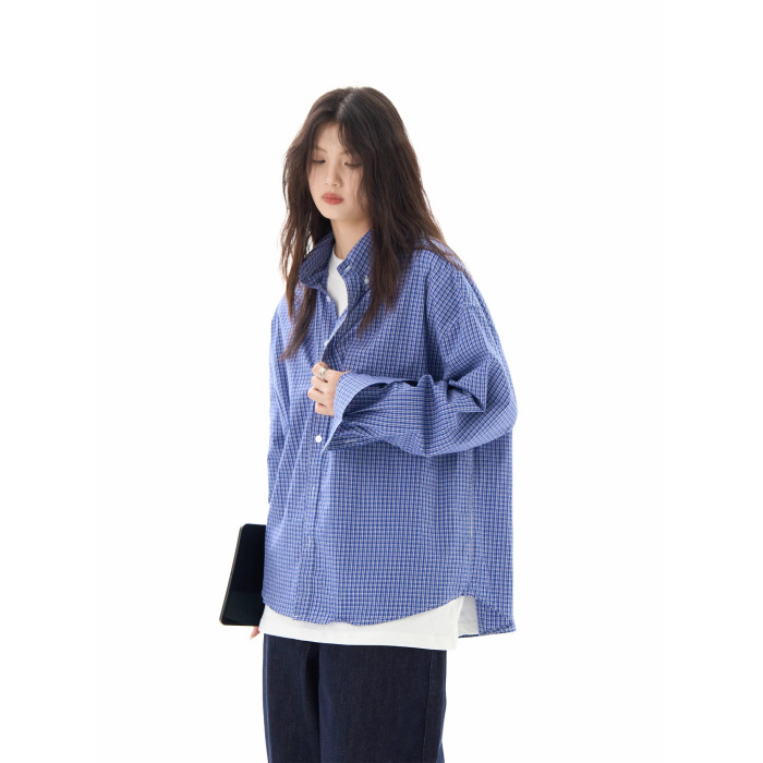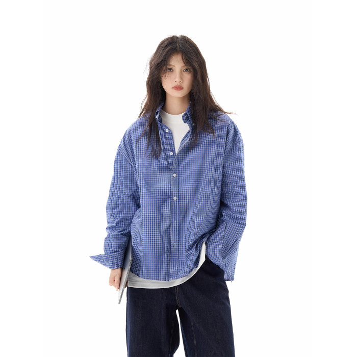 OLEOT美式復古藍色格子襯衫長袖男女高級感休閒寬鬆情侶襯衣外套