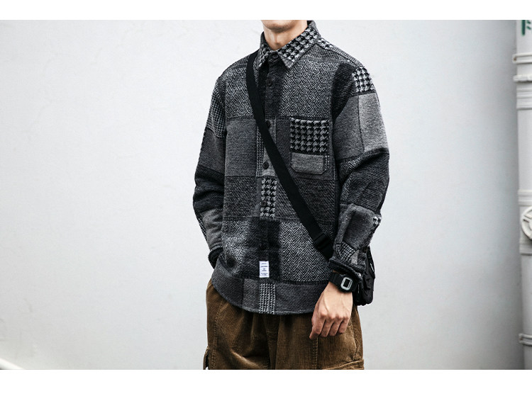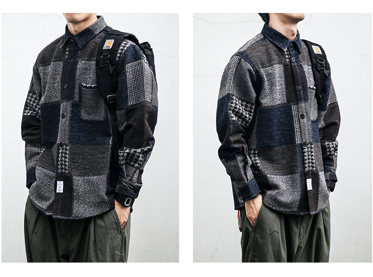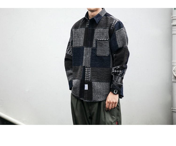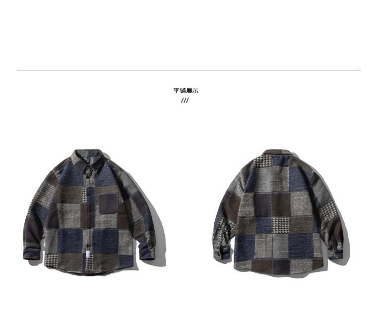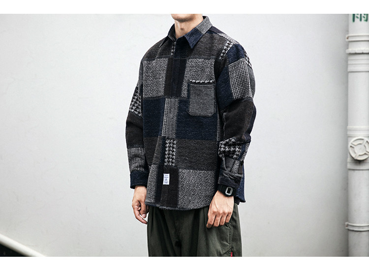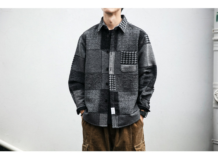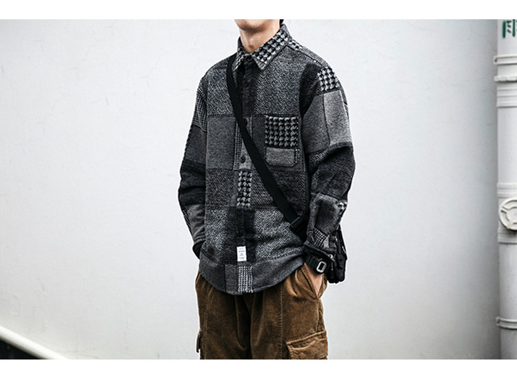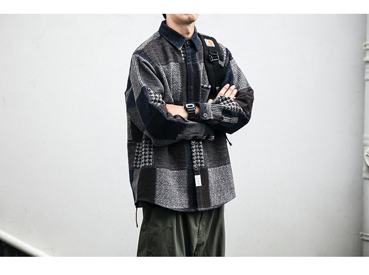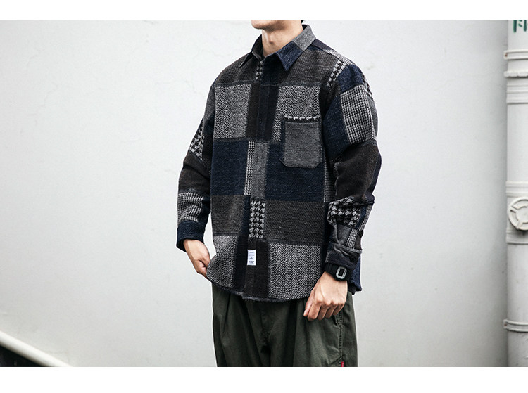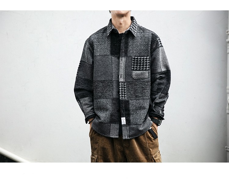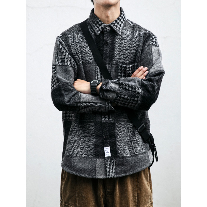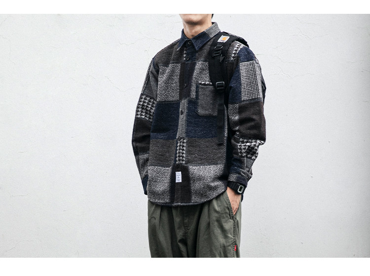 秋冬日系復古拼接格子襯衫男士潮流磨毛長袖休閒百搭毛呢寸衫外套