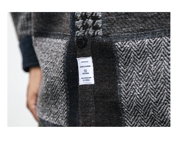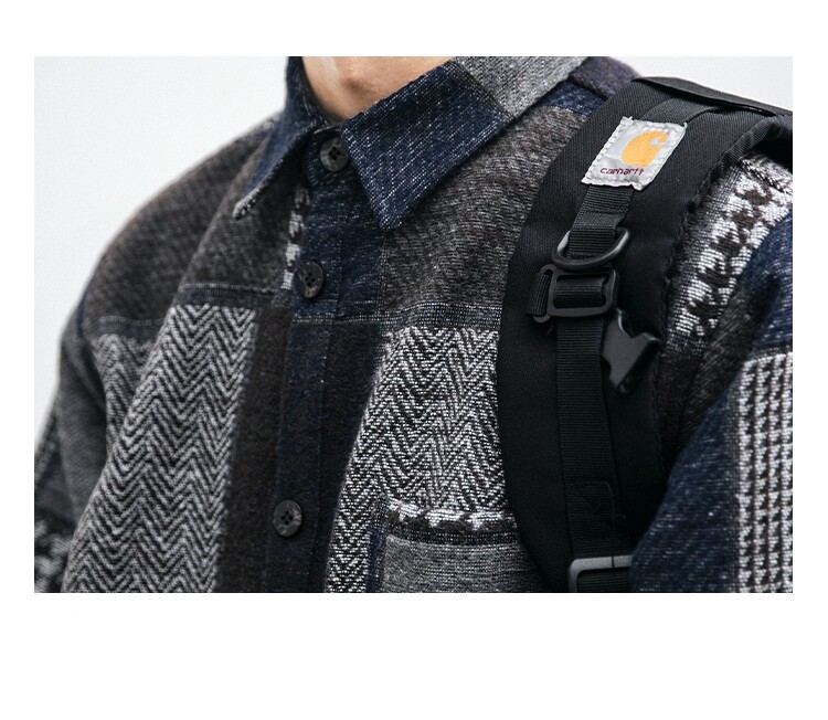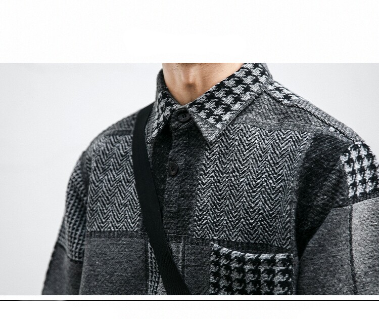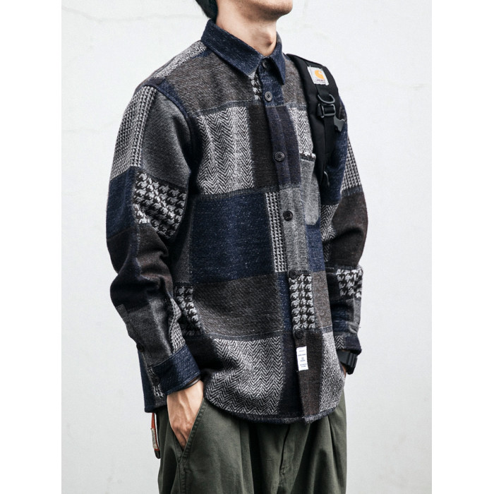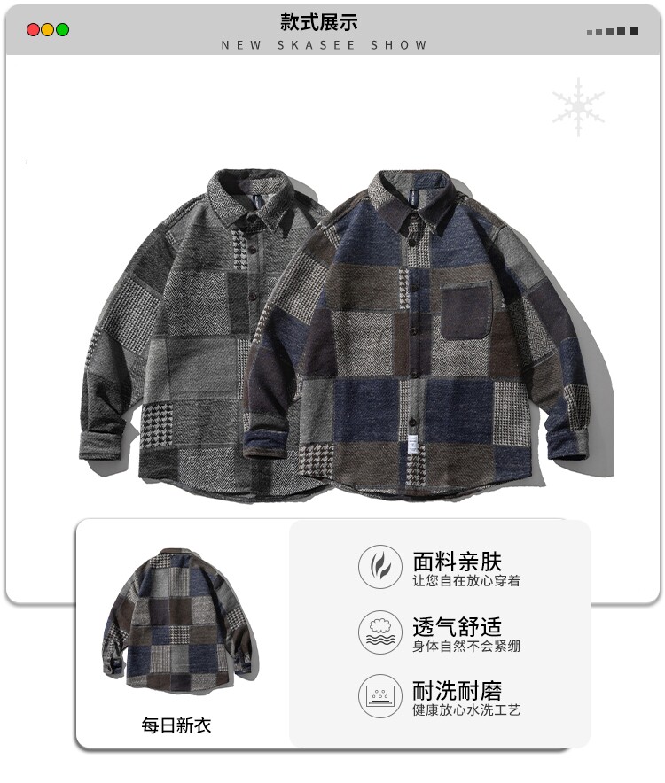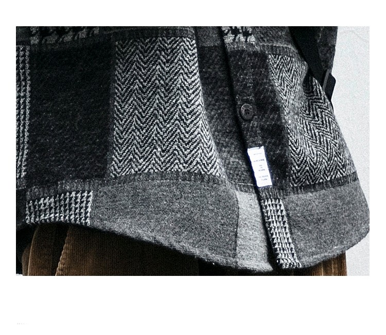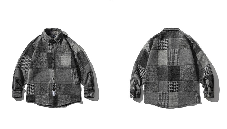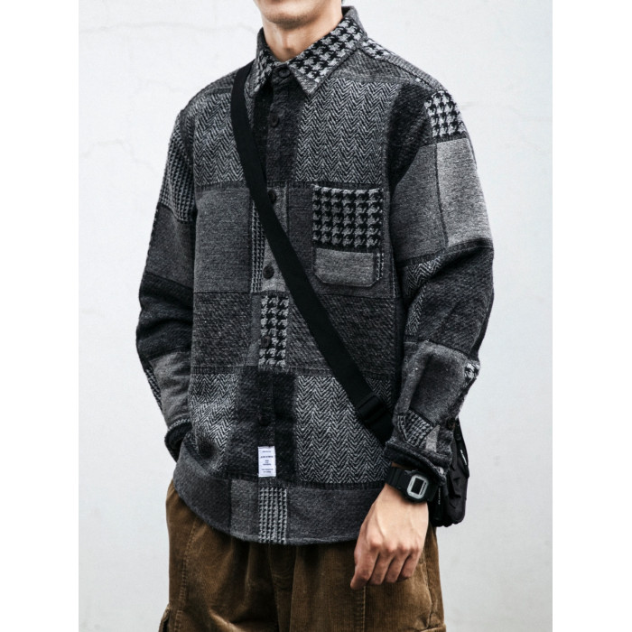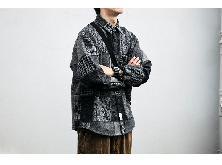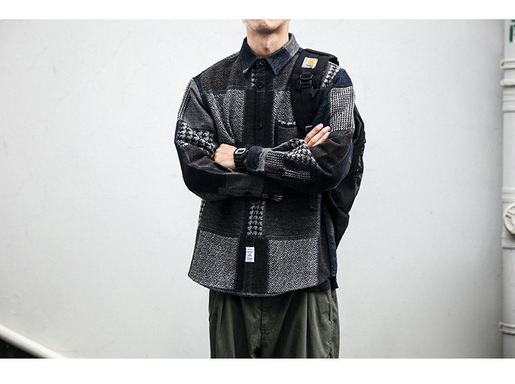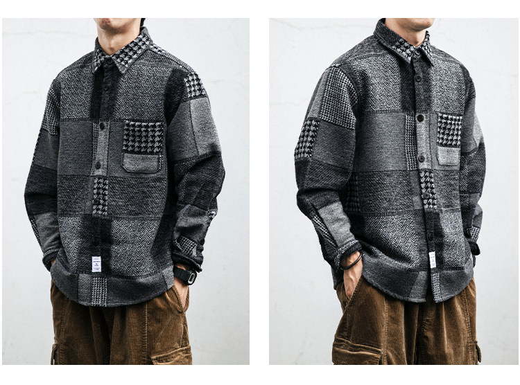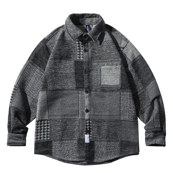 秋冬日系復古拼接格子襯衫男士潮流磨毛長袖休閒百搭毛呢寸衫外套