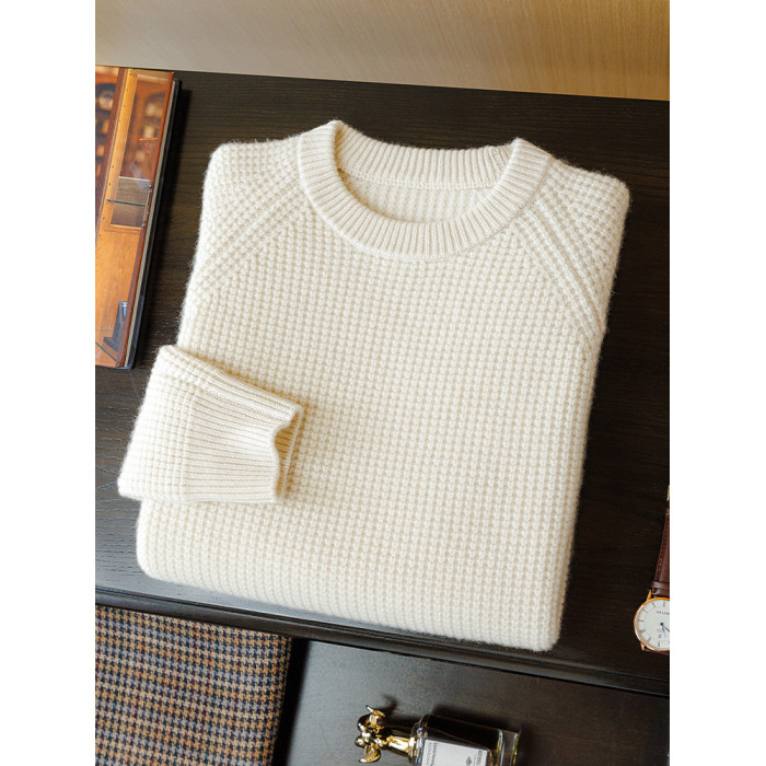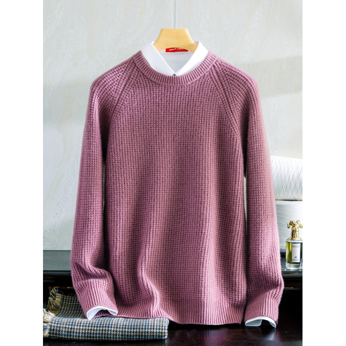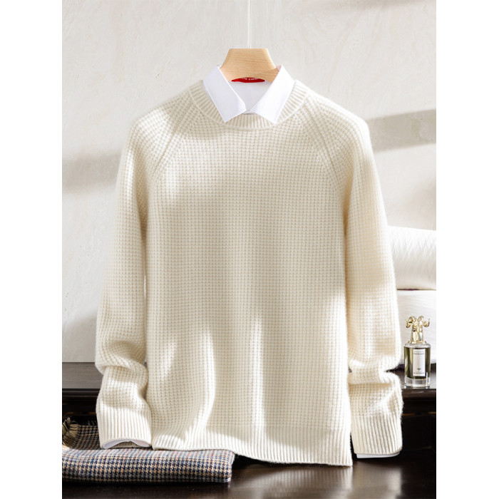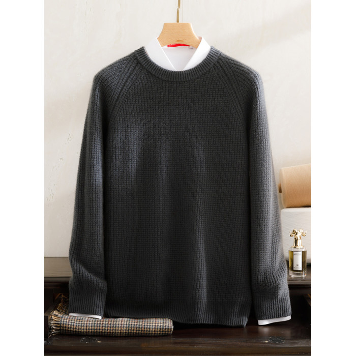 三股加厚羊絨衫男高級圓領提花100%純山羊絨毛衣針織衫套頭打底衫