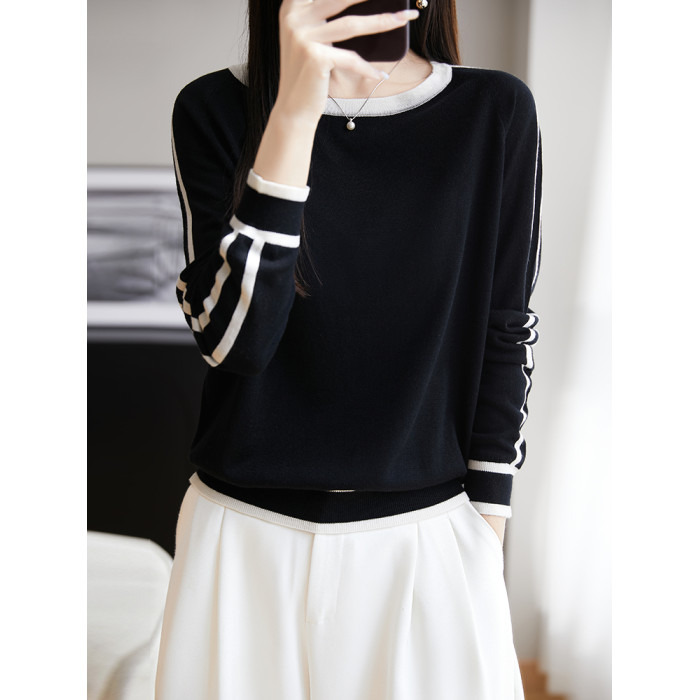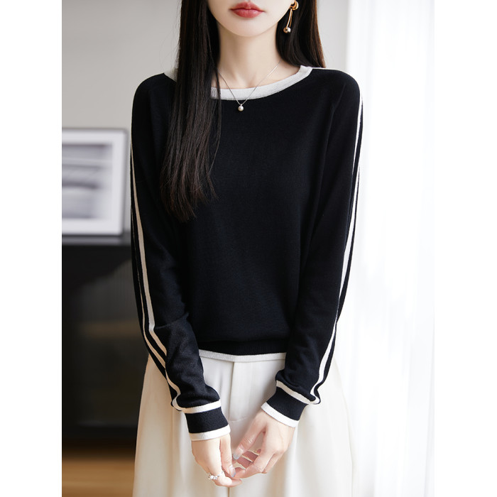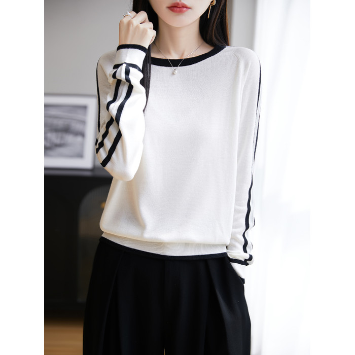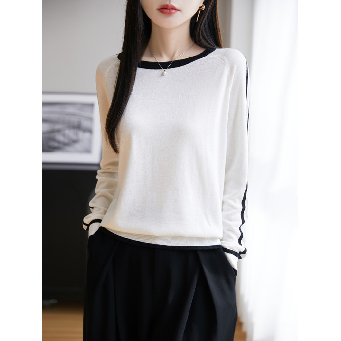 通勤紙片人~新款桑蠶絲羊毛撞色圓領針織衫女薄款天絲百搭打底衫