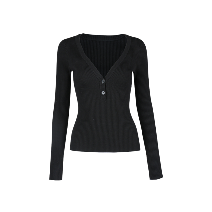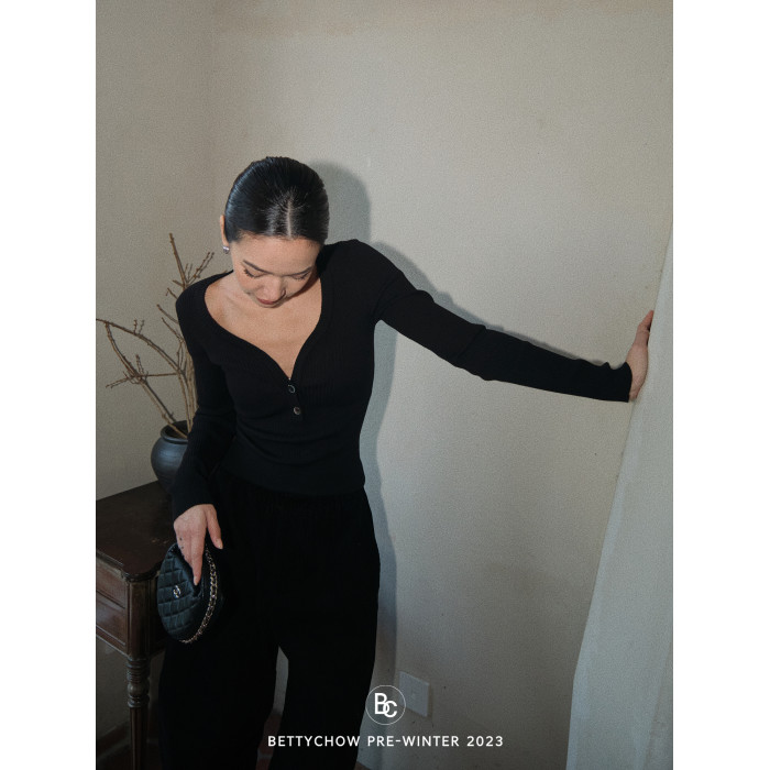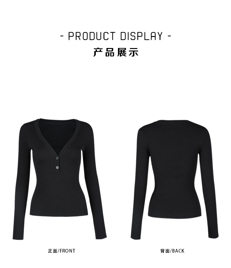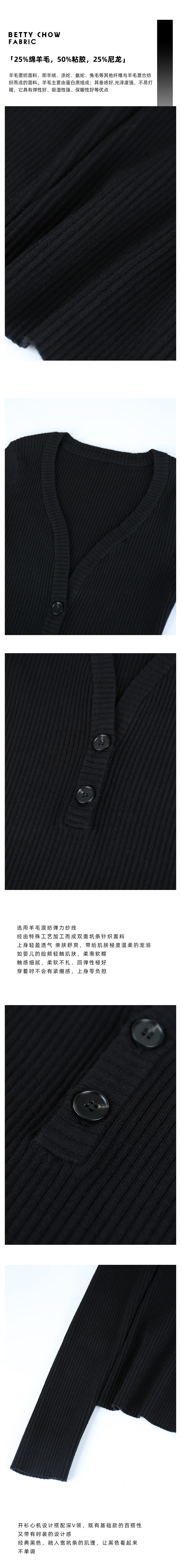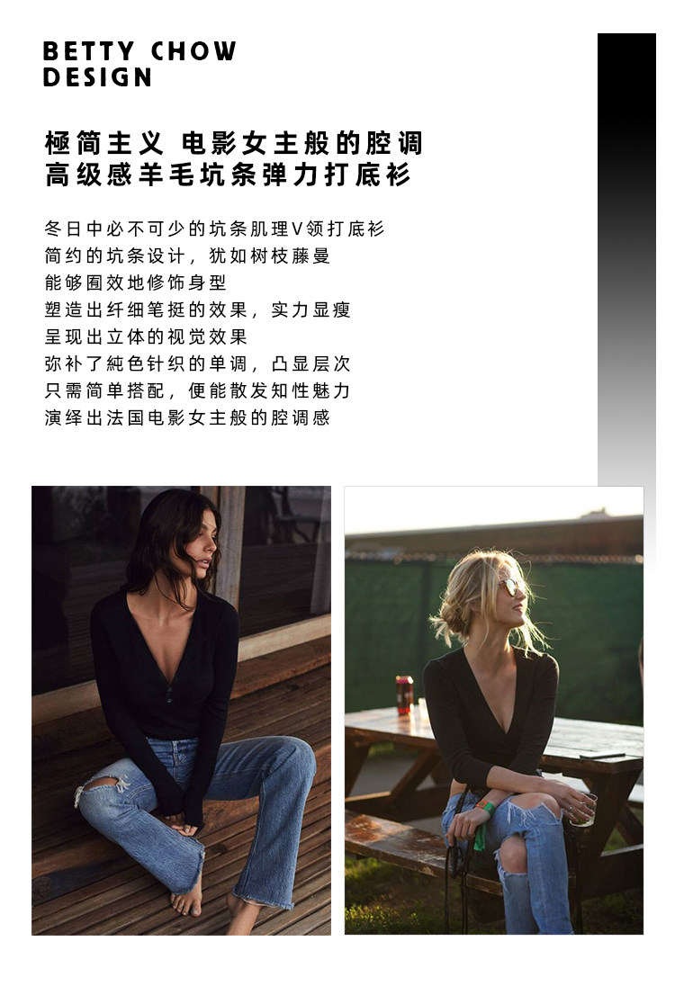 Bettychow羊毛坑條彈力打底衫黑色V領高級感氣質經典修身針織衫