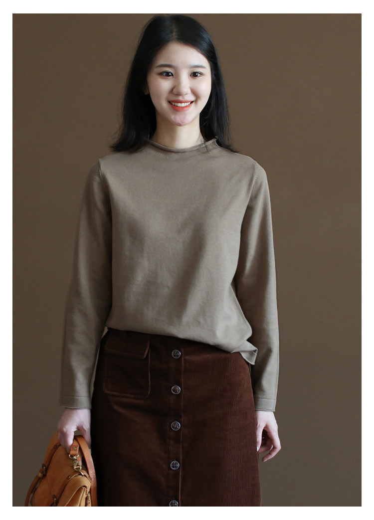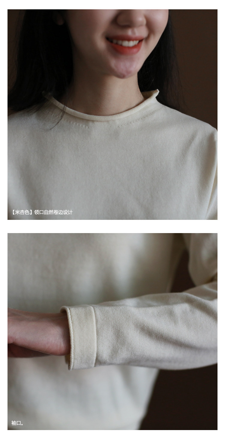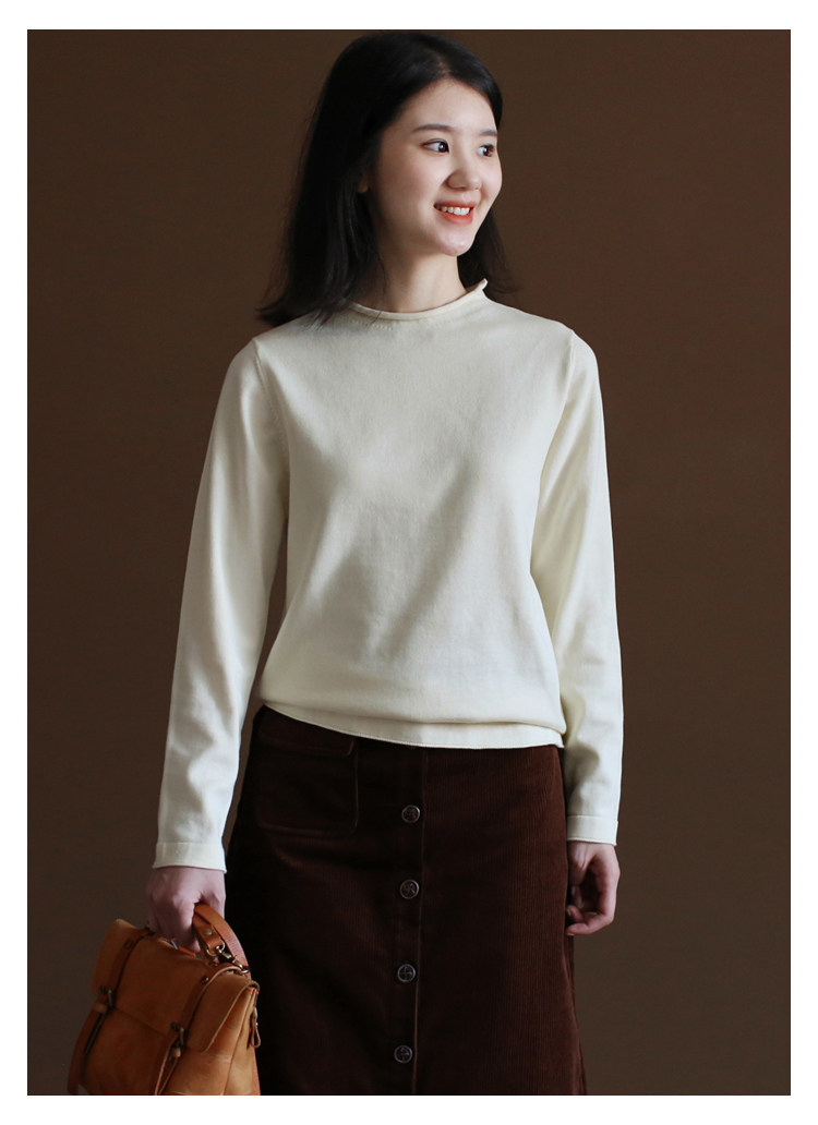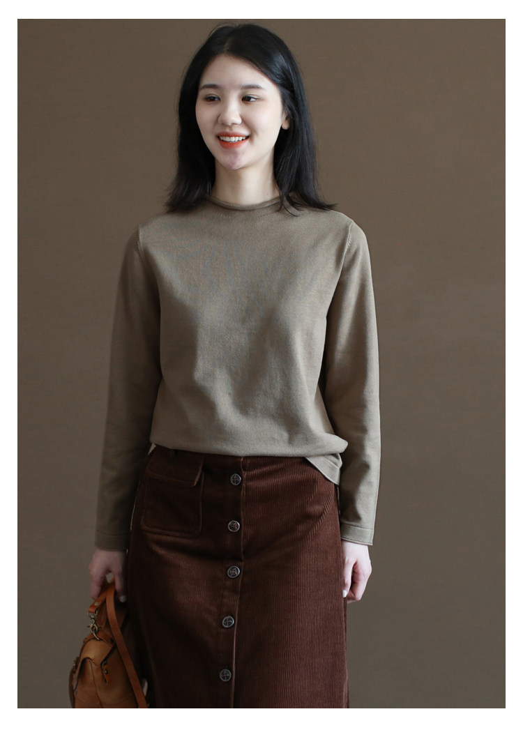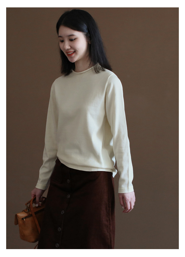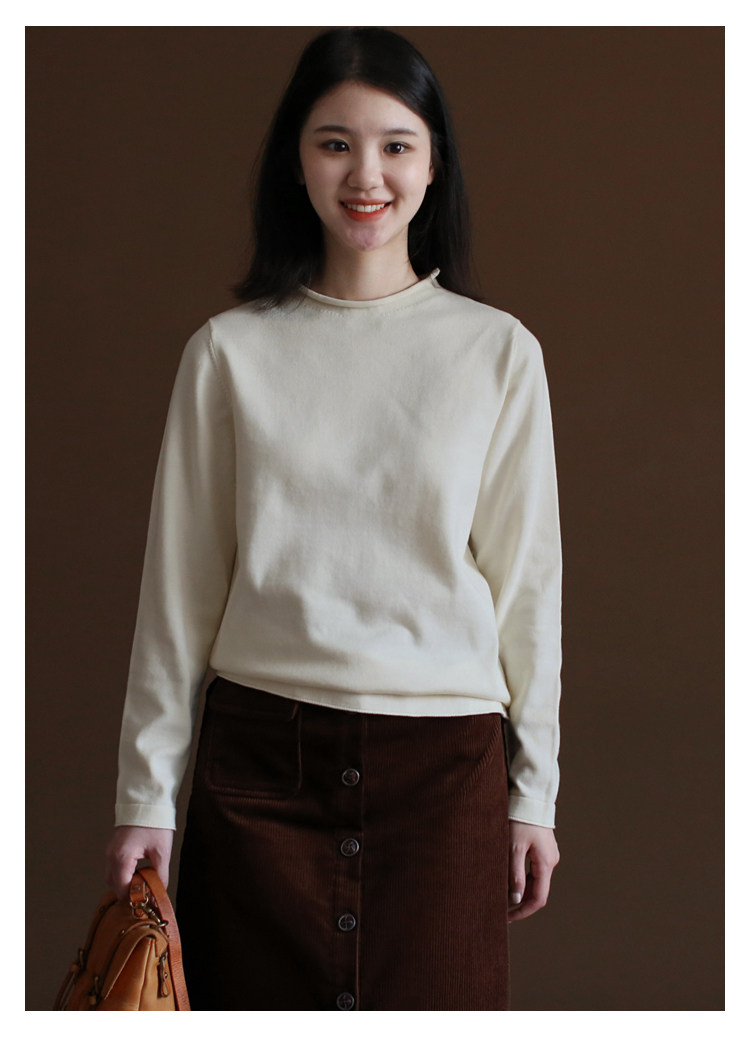 三五年Y480森系純棉線針織打底衫春秋純色圓領長袖打底套頭女上衣